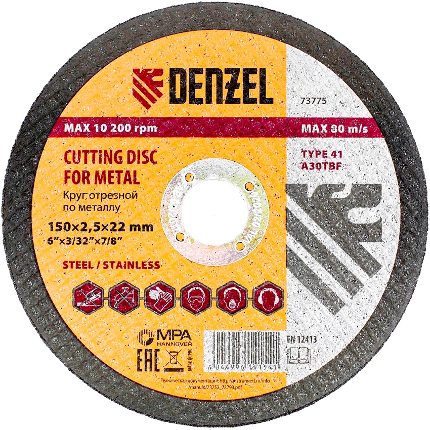 Отрезной круг по металлу Denzel A30TBF 73775 размером 150 х 2,5 х 22,2 мм рассчитан на интенсивную работу с УШМ. Подходит для резки углеродистой и нержавеющей стали. Круг можно использовать не только в быту, но и для решения профессиональных задач.