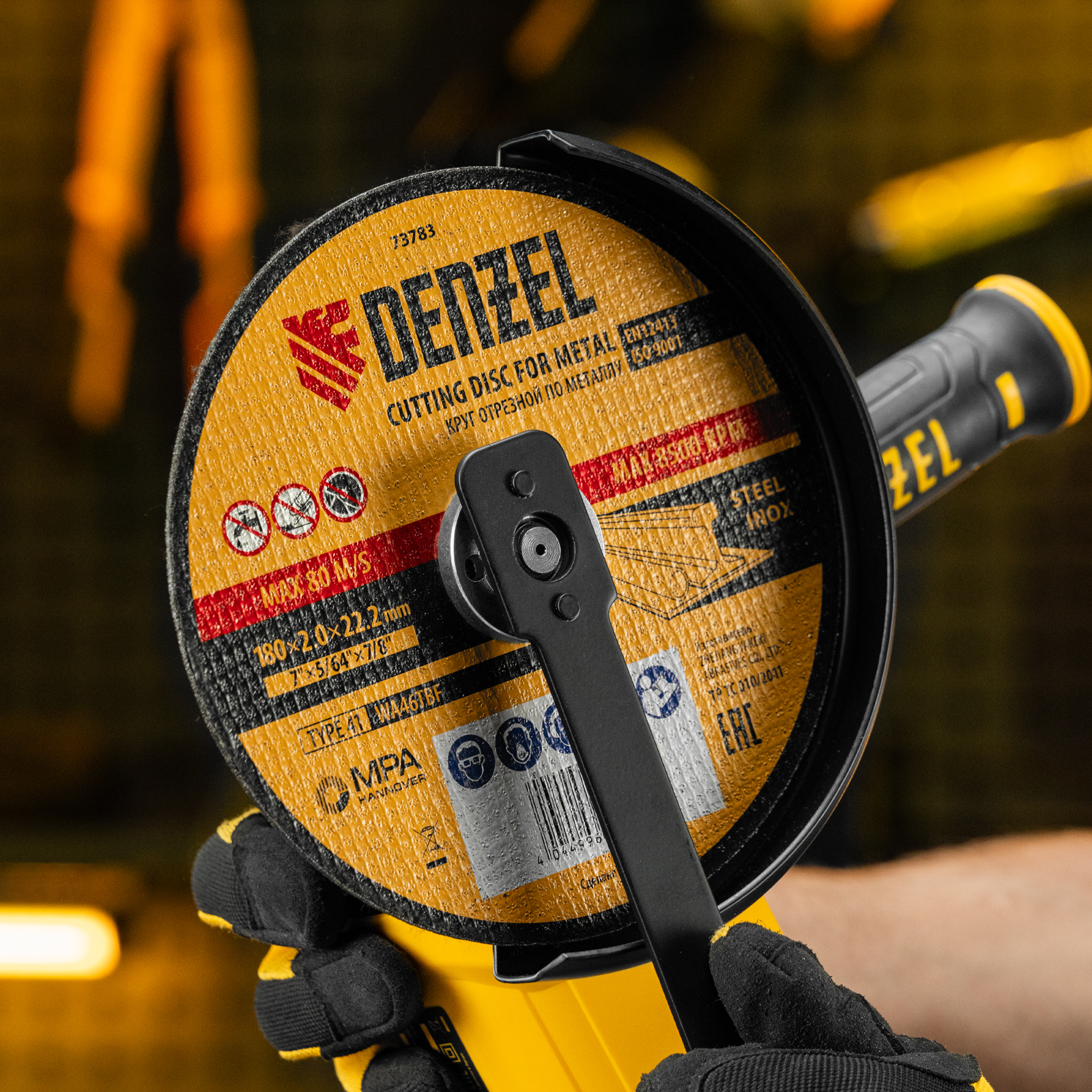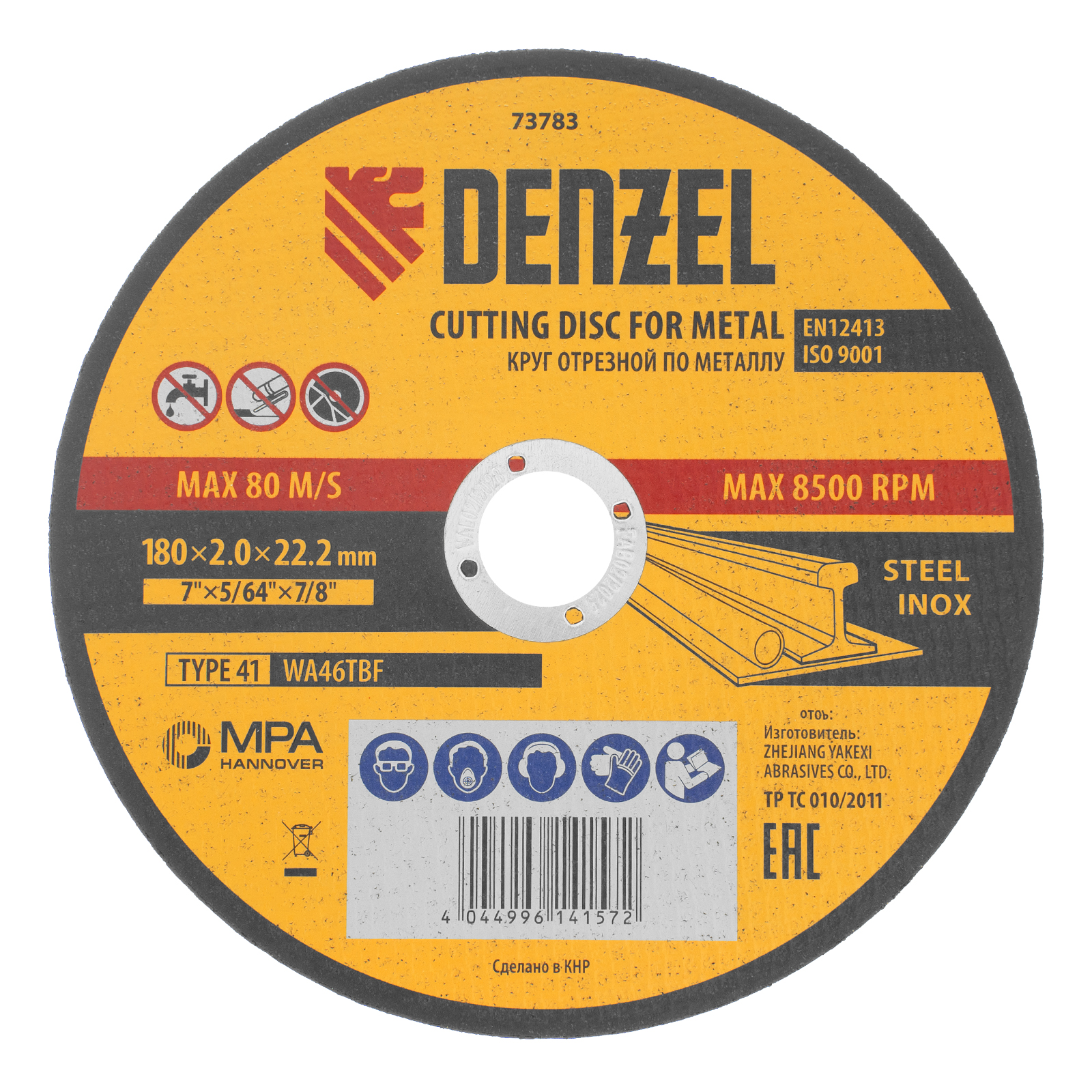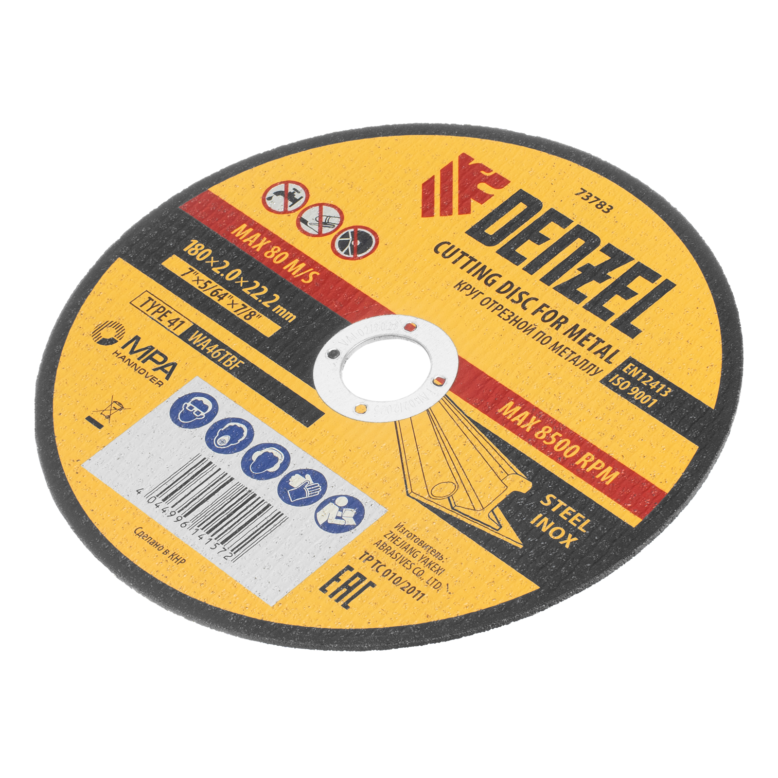 Отрезной круг по металлу Denzel WA46TBF 73783 диаметром 180 мм и толщиной 2,0 мм устанавливается на углошлифовальную машину с посадочным размером 22,2 мм. Предназначен для сухого резания углеродистых и нержавеющих сталей. Максимальная частота вращения составляет 8500 об/мин. Круг пригодится в слесарной мастерской.