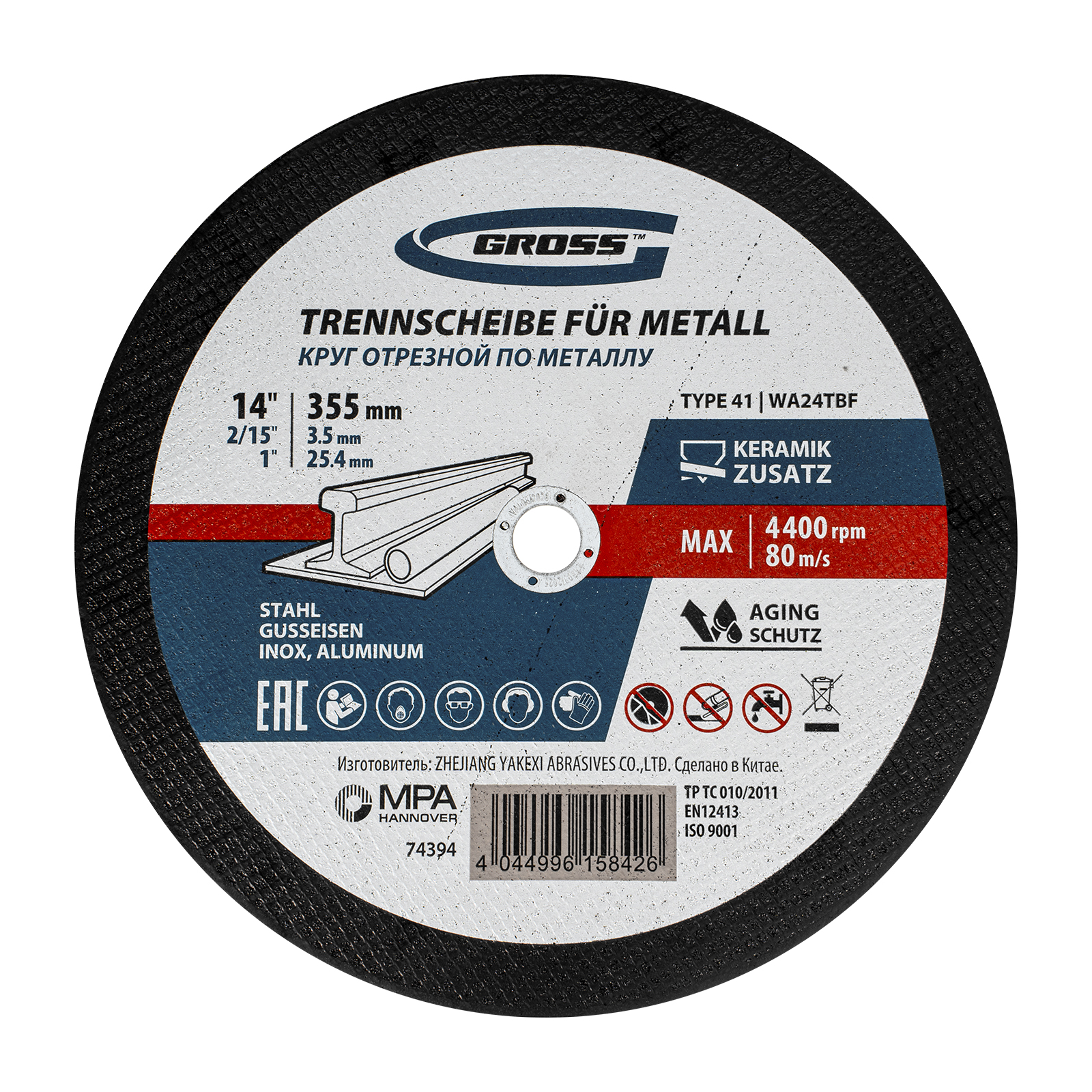 Отрезной круг по металлу Gross WA24TBF 74394 размером 355 х 3,5 х 25,4 мм рассчитан на интенсивный рез углеродистой и нержавеющей стали, алюминия, чугуна. Устанавливается на УШМ соответствующего типоразмера и не требует частой замены, подходит для профессиональной эксплуатации с высокими нагрузками.