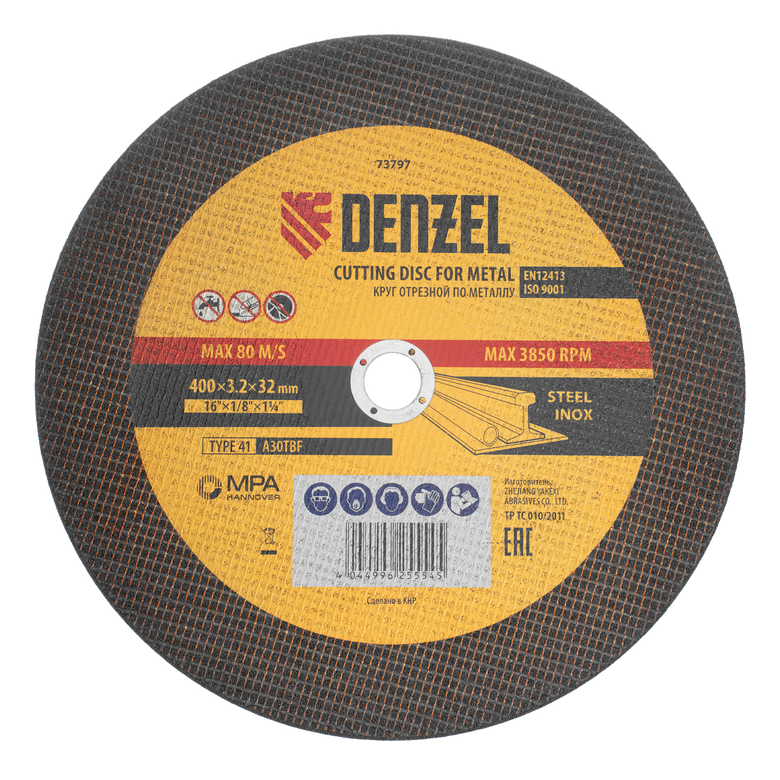 Отрезной круг по металлу Denzel A30TBF 73797 диаметром 400 мм и толщиной 3,2 мм устанавливается на углошлифовальную машину или станок с посадочным размером 32 мм. Предназначен для сухого резания углеродистых и нержавеющих сталей. Максимальная частота вращения составляет 3850 об/мин. Круг пригодится в слесарной мастерской.