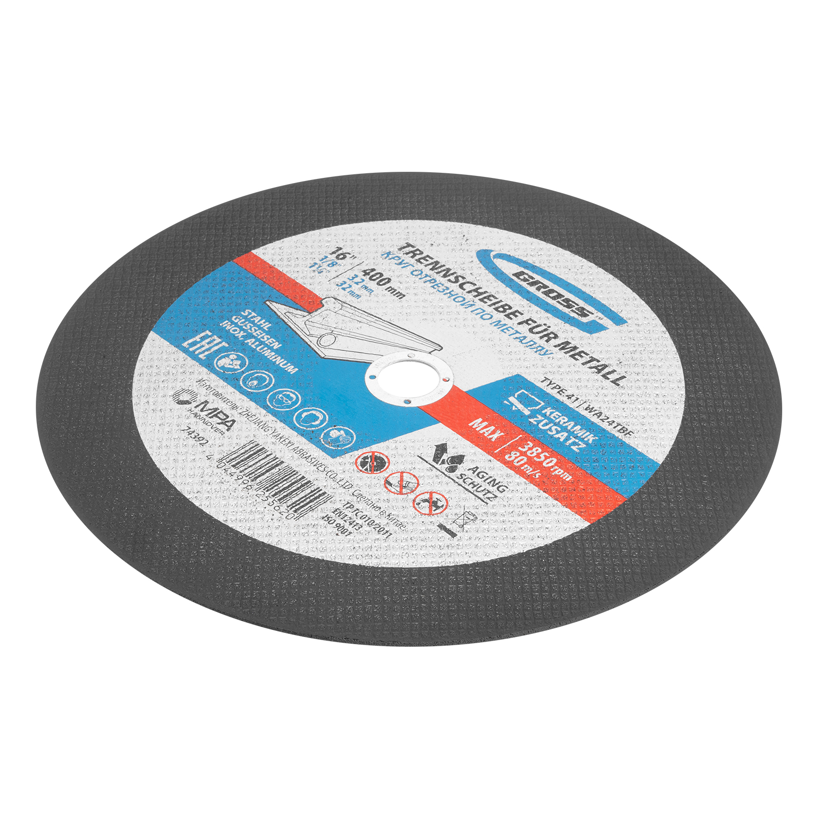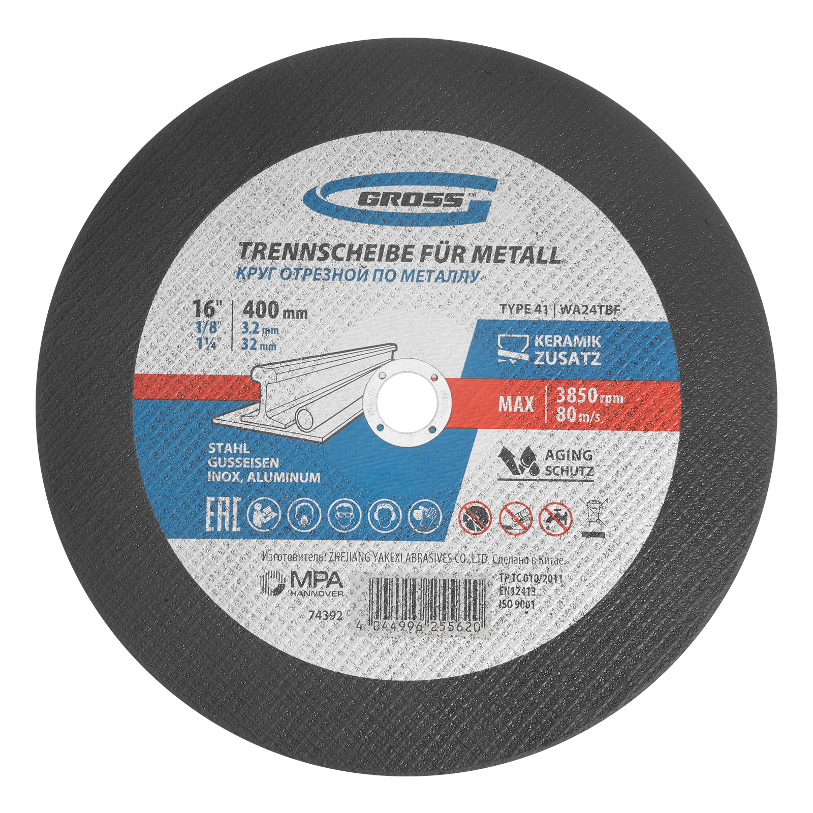 Отрезной круг по металлу Gross WA24TBF 74392 диаметром 400 мм и толщиной 3,2 мм устанавливается на фланец углошлифовальной машины или станка с посадочным размером 32 мм. Предназначен для сухого резания углеродистых и нержавеющих сталей, а также алюминия и чугуна. Рекомендованная максимальная частота вращения составляет 3850 об/мин. Круг выдерживает высокие нагрузки и подходит для профессионального использования.