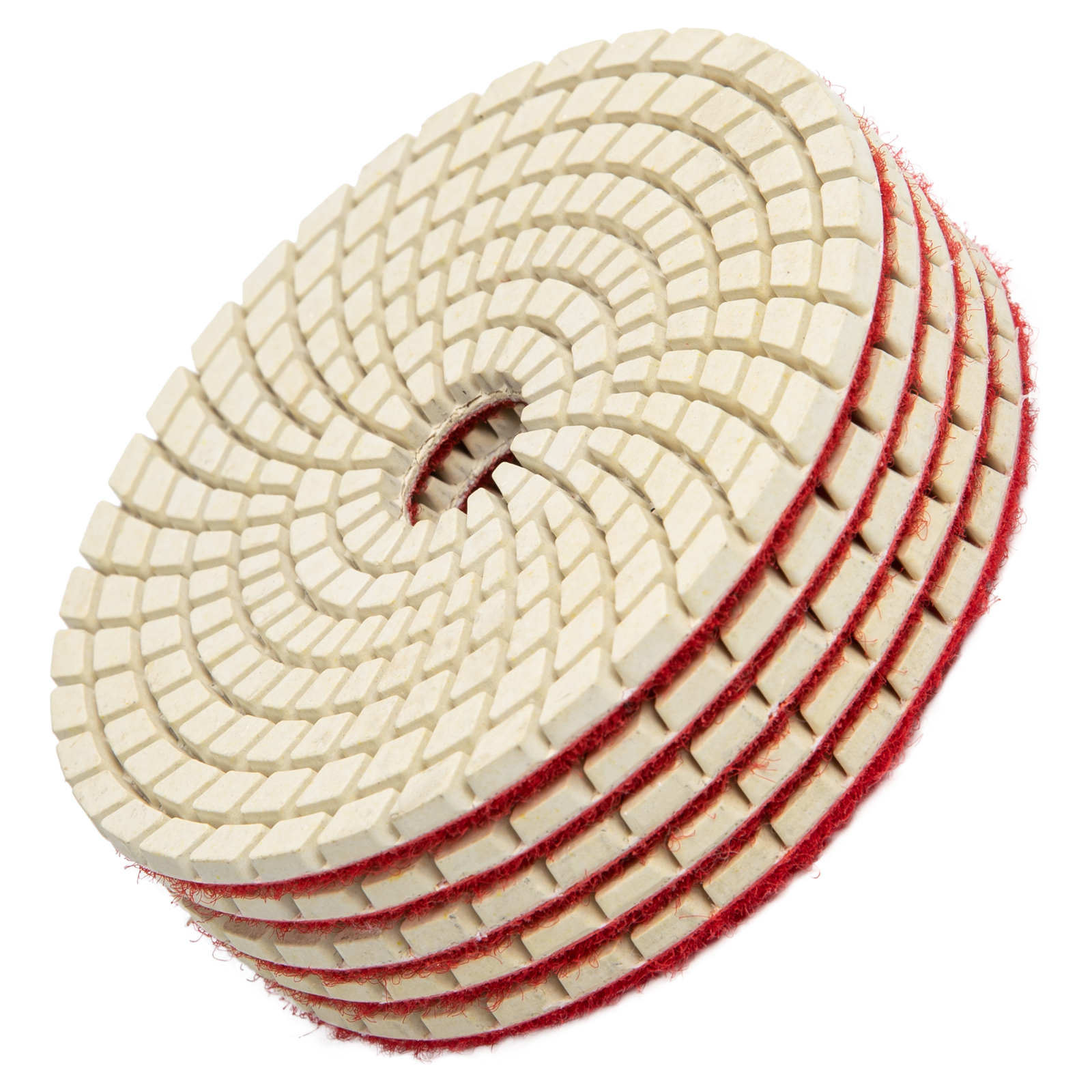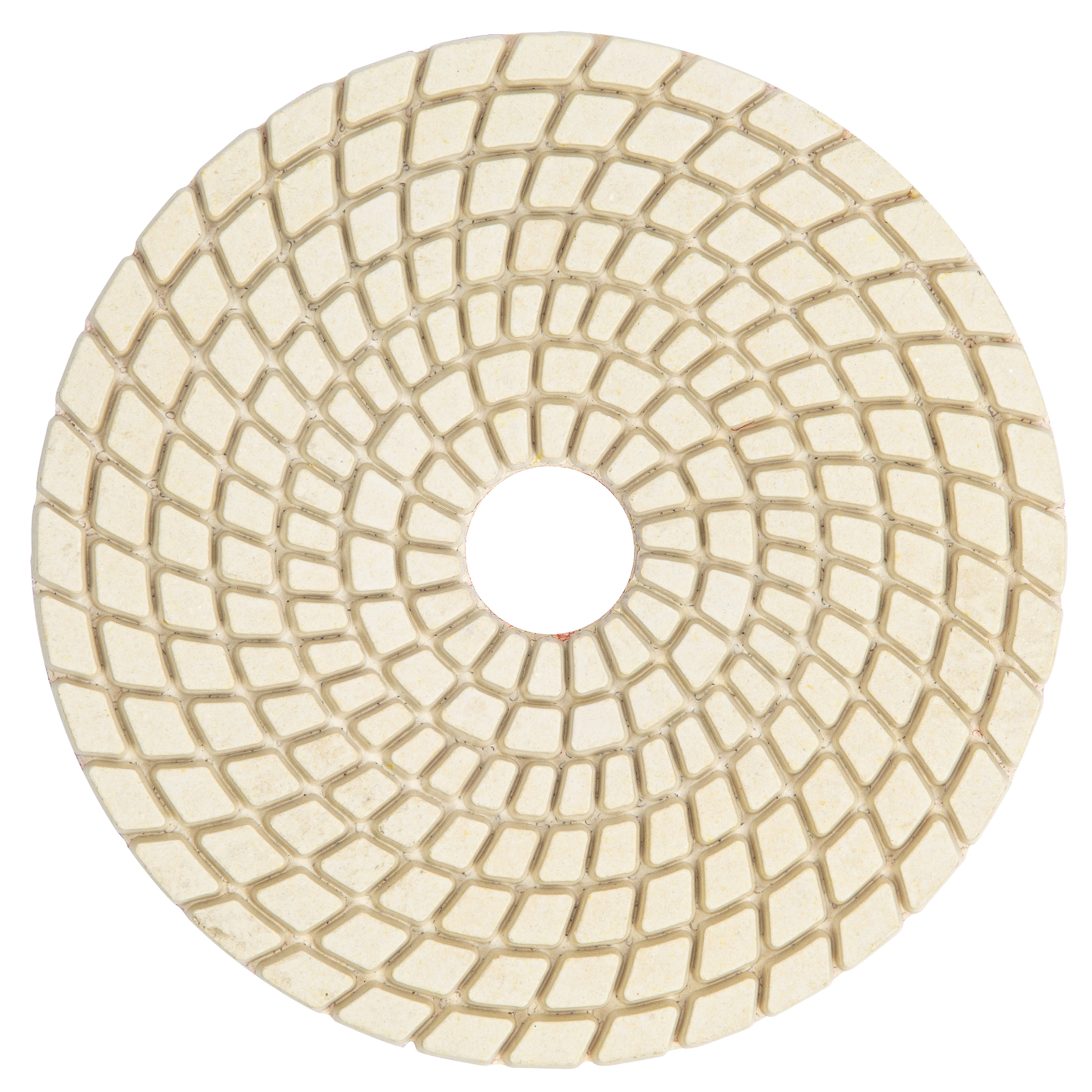 Алмазный гибкий шлифовальный круг Matrix 73510 диаметром 100 мм, с зернистостью P 400, 5 шт. в упаковке, предназначен для мокрого шлифования и используется при проведении строительных, отделочных и художественных работ. Абразив зернистостью P 400 позволяет проводить чистовую обработку, придавать гладкость гранитным, каменным, керамогранитным и мраморным поверхностям. Рабочая часть выполнена из белого термопластика с алмазным напылением и подходит для использования на цветных, преимущественно белых, материалах. Гибкая основа круга облегчает шлифовку рельефных элементов. Круг используется на УШМ с установленной опорной тарелкой для АГШК.