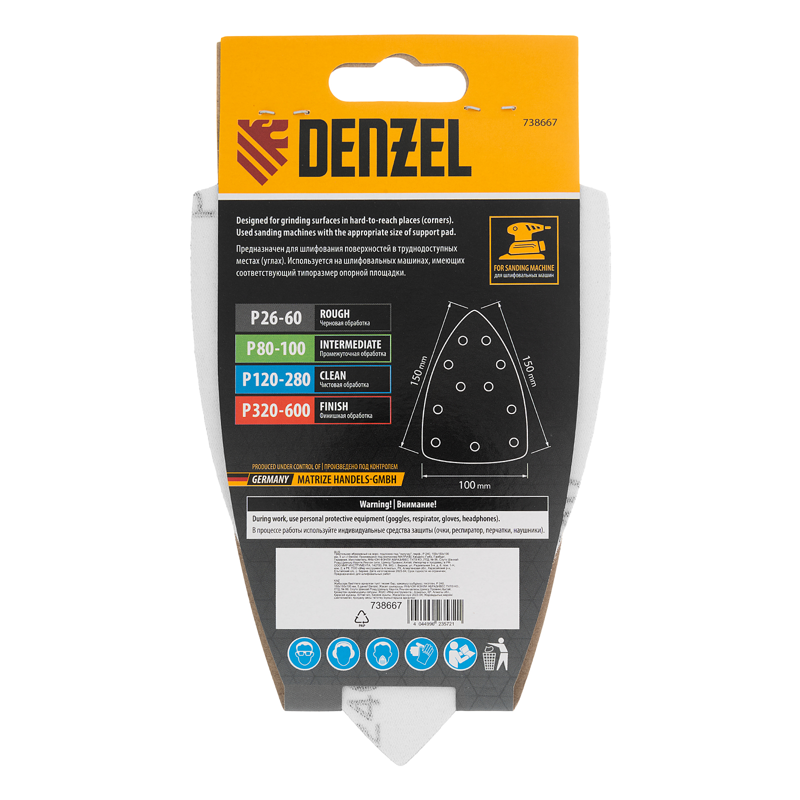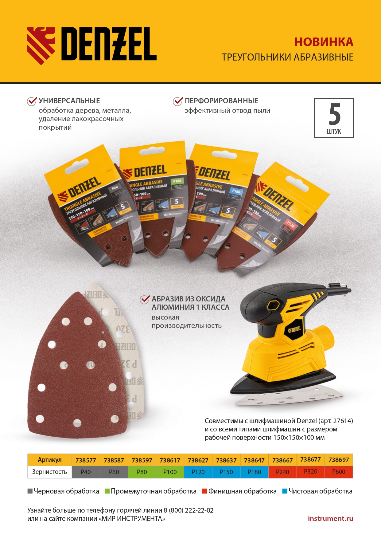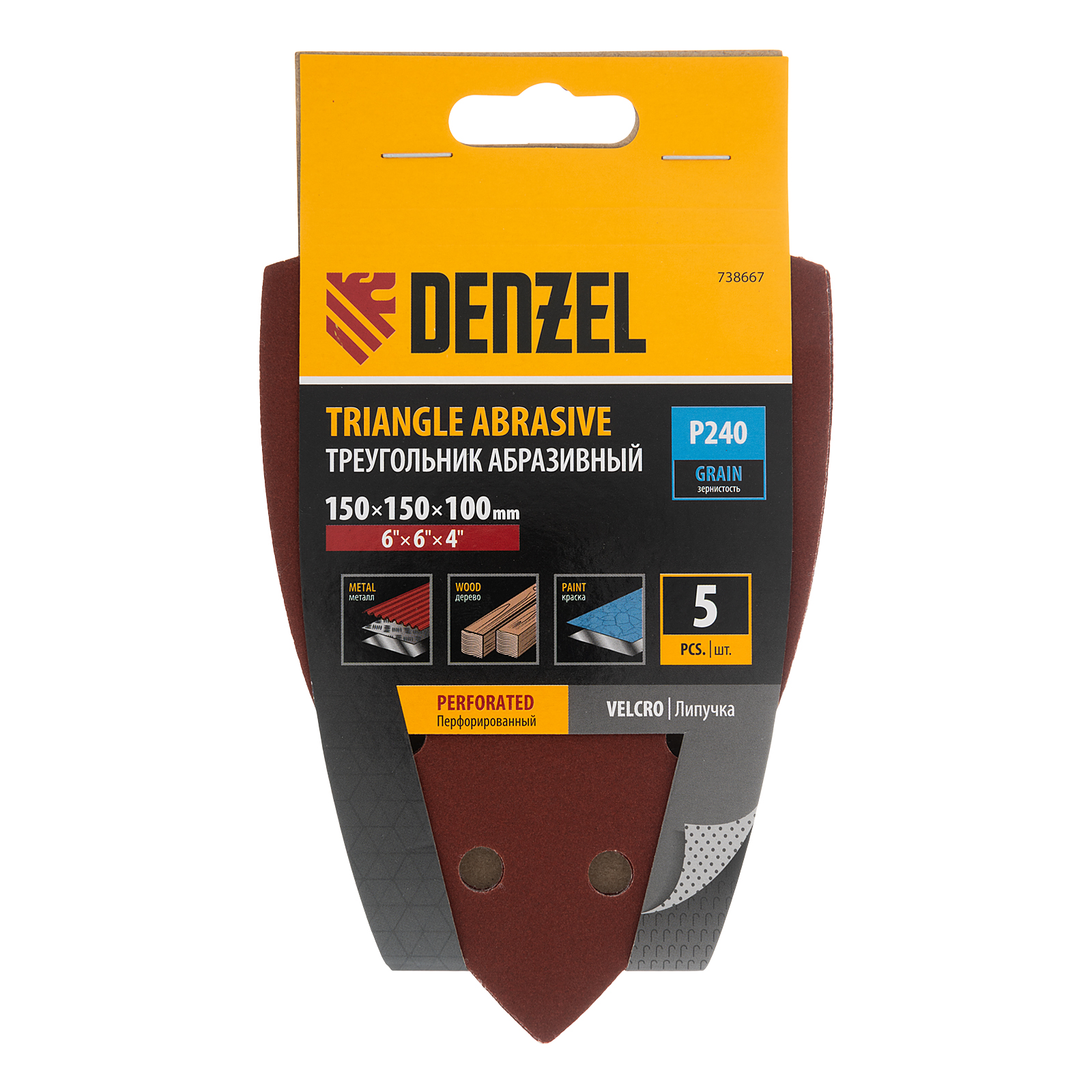 Абразивный перфорированный треугольник на ворсовой подложке «под липучку» Denzel 738667 размером 150 х 150 х 100 мм, 5 шт. в упаковке, имеет зернистость P 240 и предназначен для финишной обработки металлических, деревянных и других деталей. Позволяет устранять с поверхности мельчайшие шероховатости, удобен для работы в углах и других труднодоступных местах. Треугольник совместим с плоскошлифовальной машиной Denzel 27614, также подходит для установки на другие шлифмашины с размером рабочей платформы 150 х 150 х 100 мм.