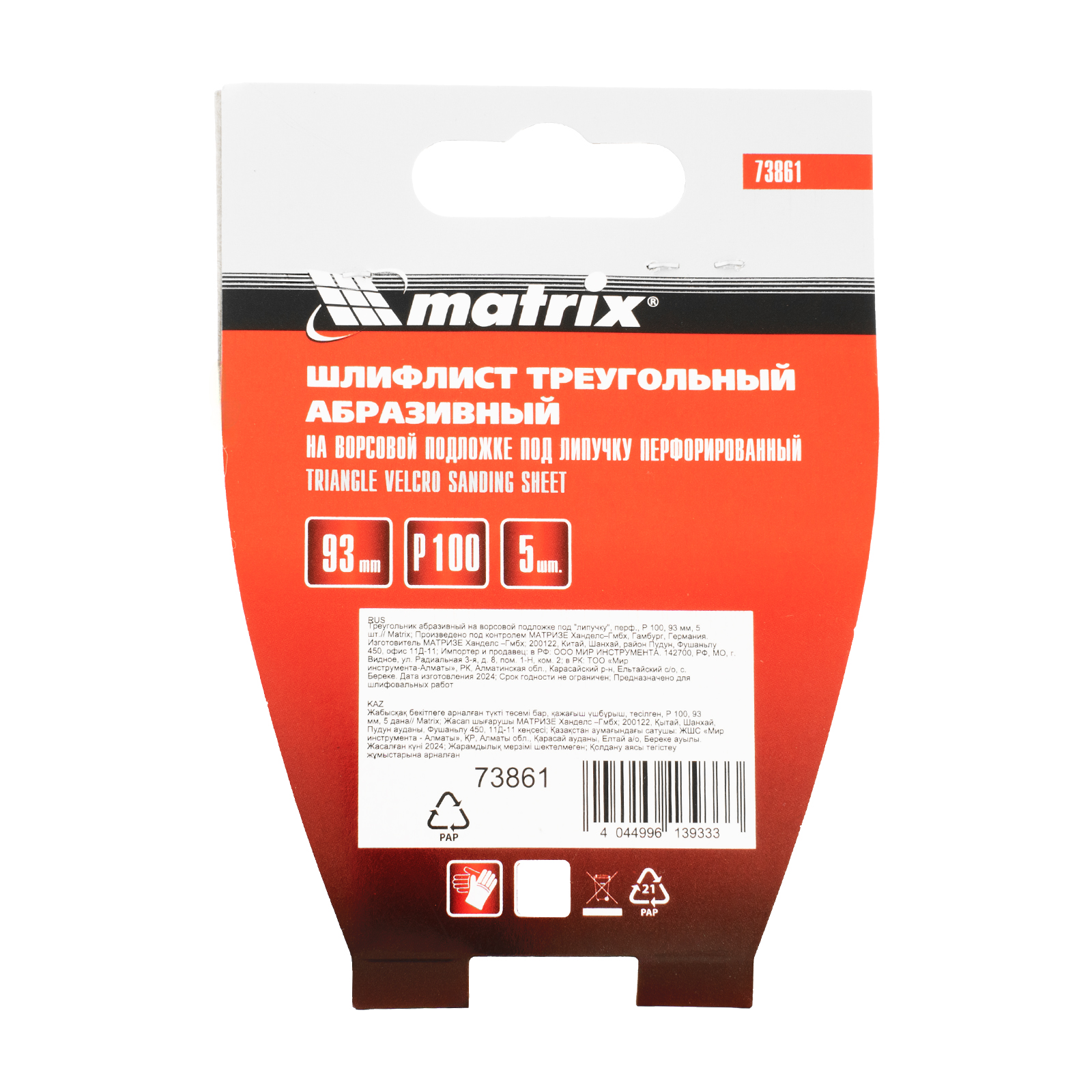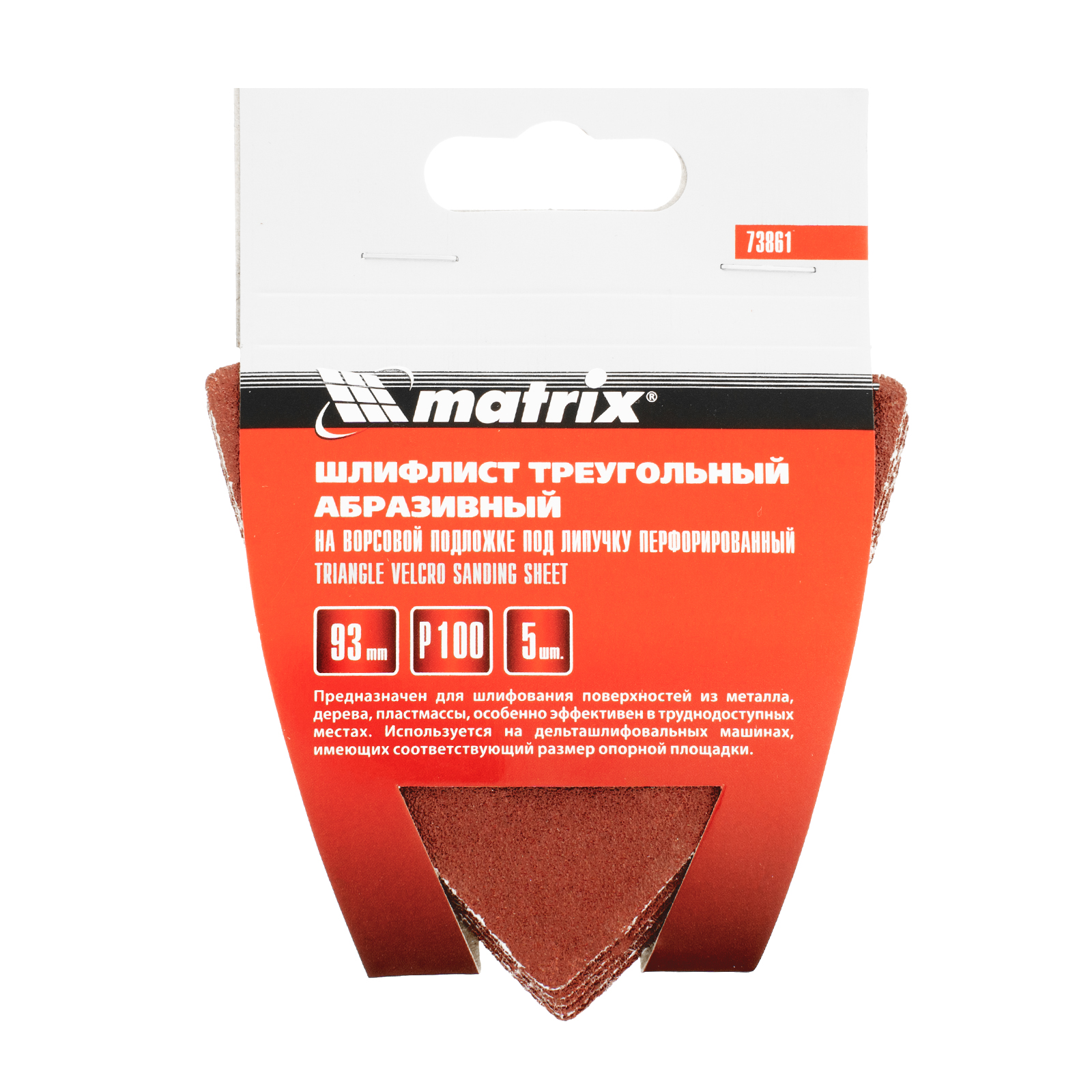 Перфорированный абразивный треугольник на ворсовой подложке под «липучку» Matrix 73861 шириной 93 мм, с абразивом Р 100, 5 шт. в упаковке, предназначен для установки на дельташлифовальную машину с соответствующим посадочным размером опорной площадки. С помощью абразива средней зернистости Р 100 можно произвести сухую чистовую зачистку древесины, металла, пластмассы, придав им гладкость. Треугольная форма облегчает обработку труднодоступных мест.