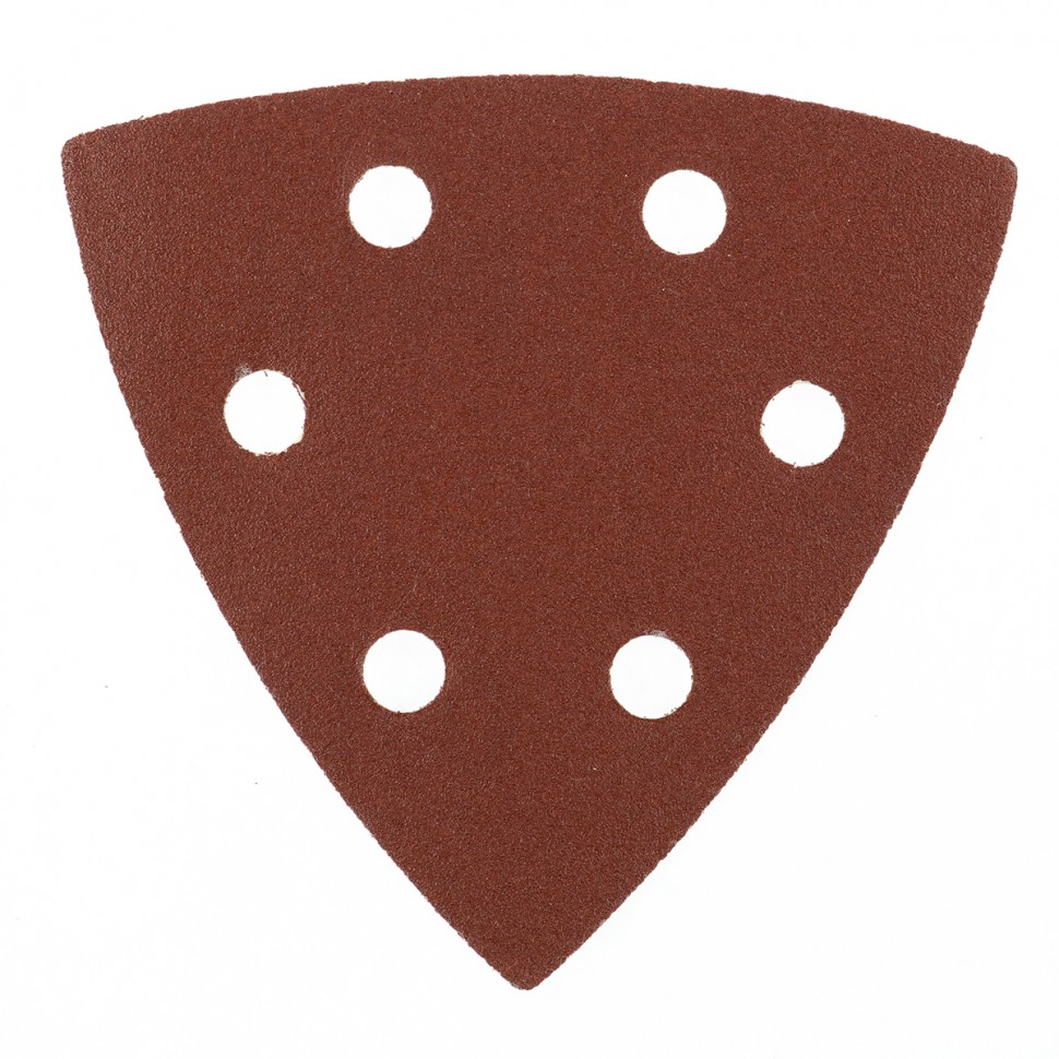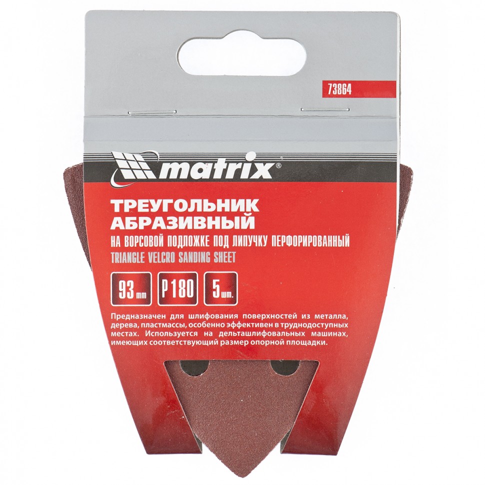 Перфорированный абразивный треугольник на ворсовой подложке под «липучку» Matrix 73864 шириной 93 мм, с абразивом Р 180, 5 шт. в упаковке, предназначен для установки на дельташлифовальную машину с соответствующим посадочным размером опорной площадки. С помощью абразива мелкой зернистости Р 180 можно произвести сухую чистовую шлифовку древесины, металла, пластмассы, подготовив поверхность под покраску, лакирование и нанесение других отделочных материалов. Треугольная форма облегчает обработку труднодоступных мест.