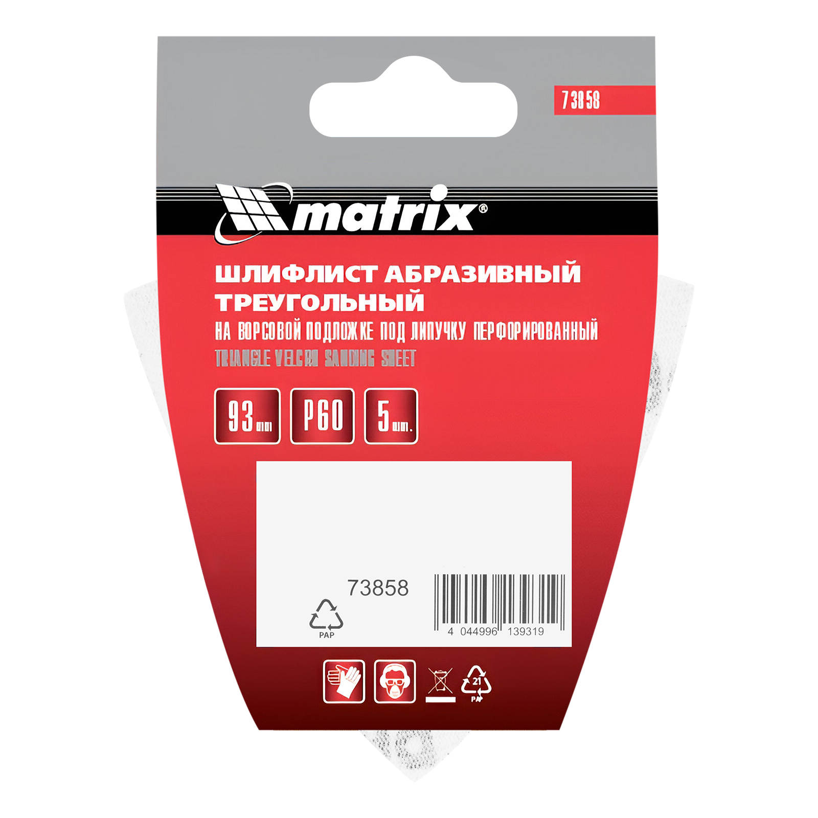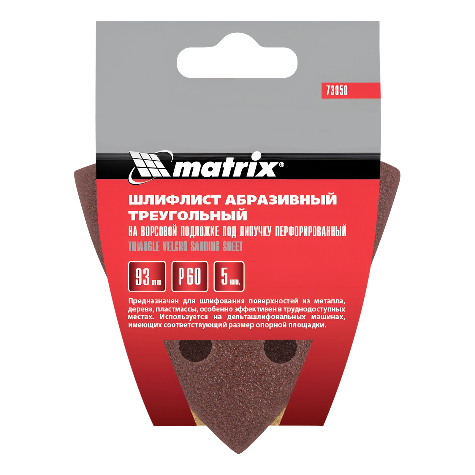 Перфорированный абразивный треугольник под «липучку» Matrix Р 60 арт. 73858 предназначен для дельташлифовальных машин с опорной площадкой 93 мм. С помощью абразива крупной зернистости Р60 можно произвести сухую черновую обработку дерева, металла, пластмассы, снять старую краску, устранить крупные заусенцы, ржавчину и прочие дефекты. Треугольная форма облегчает обработку труднодоступных мест.