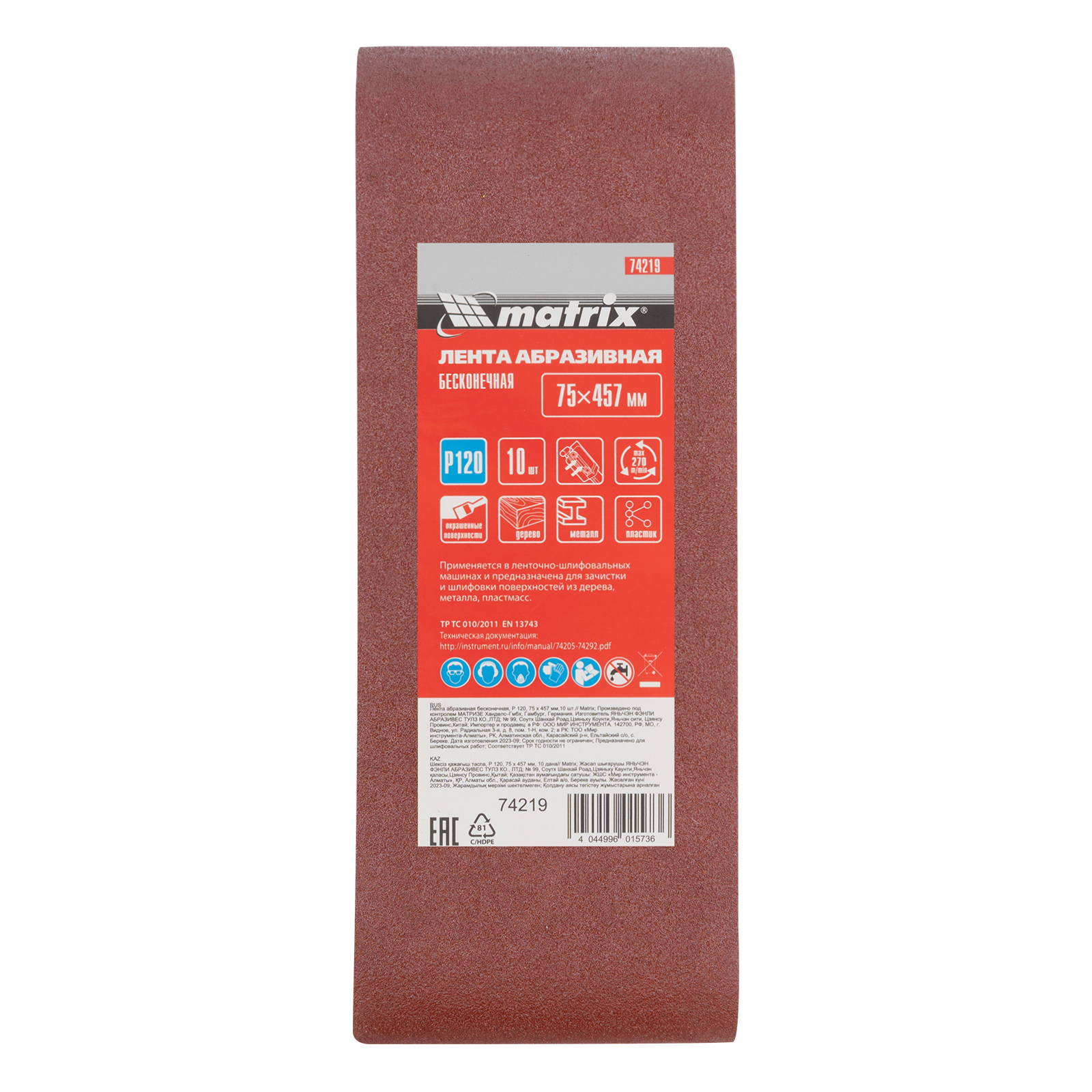 Бесконечная абразивная лента Matrix 74219 с зернистостью P 120, 10 шт. в упаковке, устанавливается на ленточную шлифовальную машину, совместимую со сменными элементами размером 75 х 457 мм. Применяется для чистовой обработки деревянных и металлических поверхностей.