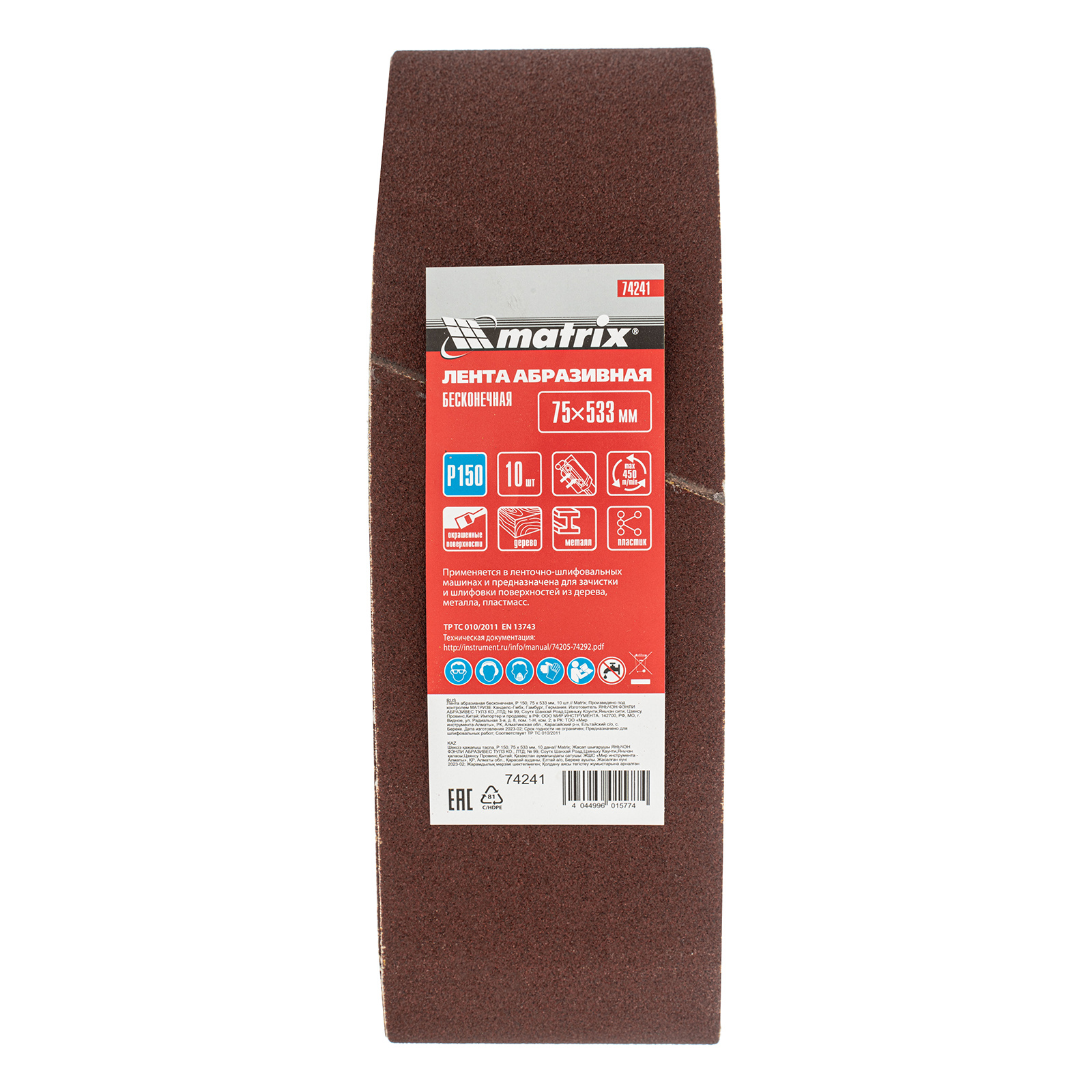Бесконечная абразивная лента Matrix 74241 с зернистостью P 150, 10 шт. в упаковке, устанавливается на ленточную шлифовальную машину, совместимую со сменными элементами размером 75 х 533 мм. Применяется для финишной обработки деревянных и металлических поверхностей.
