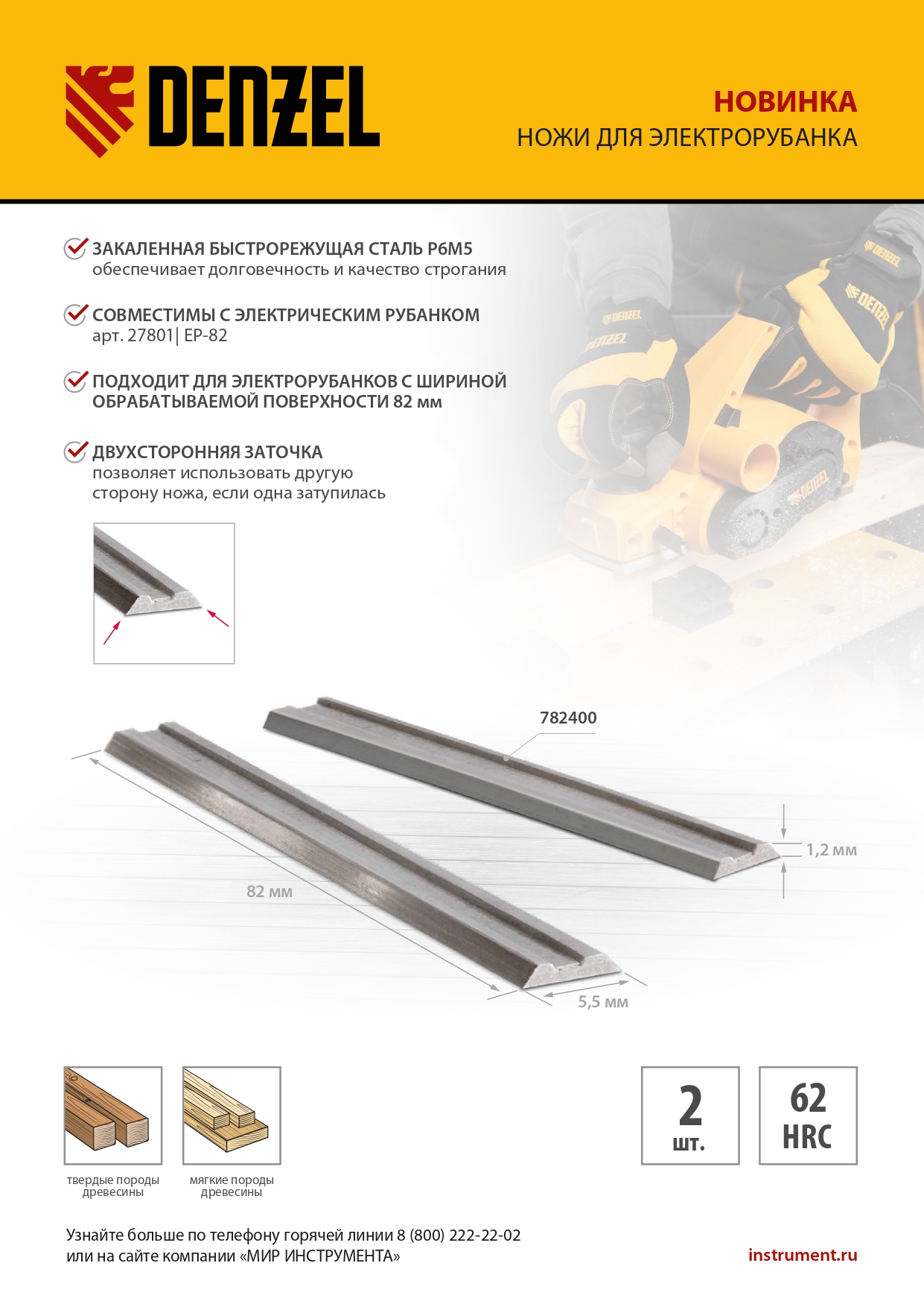 Ножи для электрического рубанка Denzel 782400 — комплект из 2 сменных режущих элементов длиной 82 мм, изготовленных из стали P6M5. Предназначены для строгания поверхностей из твердых и мягких пород древесины, а также других материалов, схожих по твердости и текстуре. Обеспечивают чистоту строгания и ровную поверхность материала. Совместимы с электрорубанком Denzel 27801, а также для всех электрорубанков с шириной обработки 82 мм.