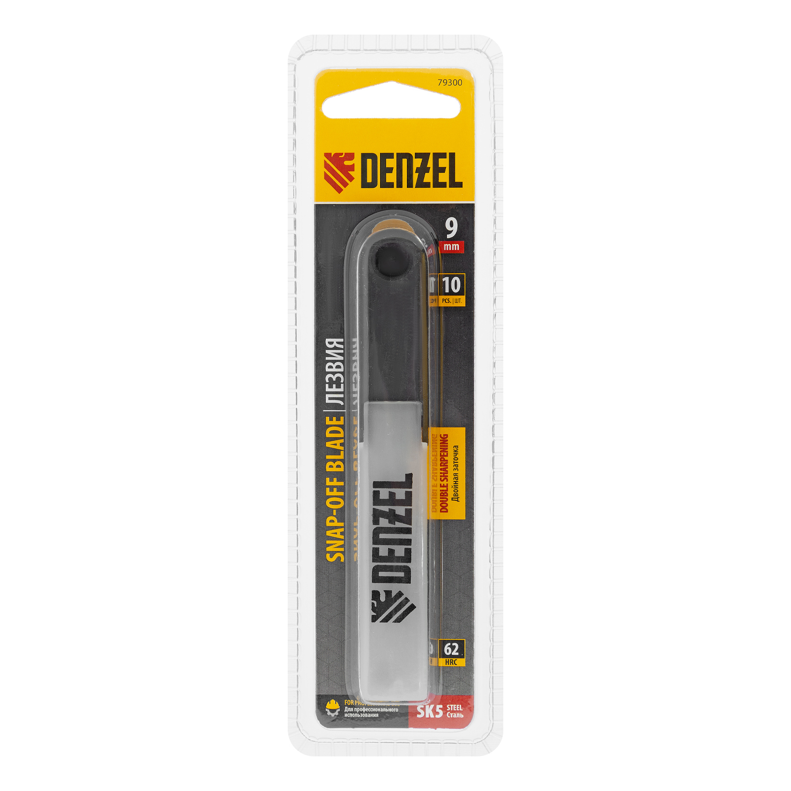 Лезвия Denzel 79300 шириной 9 мм, изготовленные из стали SK5 толщиной 0,4 мм, 10 шт. в упаковке, — сменные рабочие элементы для монтажных ножей соответствующего типоразмера. Подходят для разрезания картона, линолеума, пленки, обоев, обеспечивают легкий рез. Отличаются повышенной прочностью и долговечностью по сравнению с аналогами других торговых марок. Лезвия остро заточены и хорошо гнутся, могут применяться в бытовых целях, а также во время строительства и ремонта.