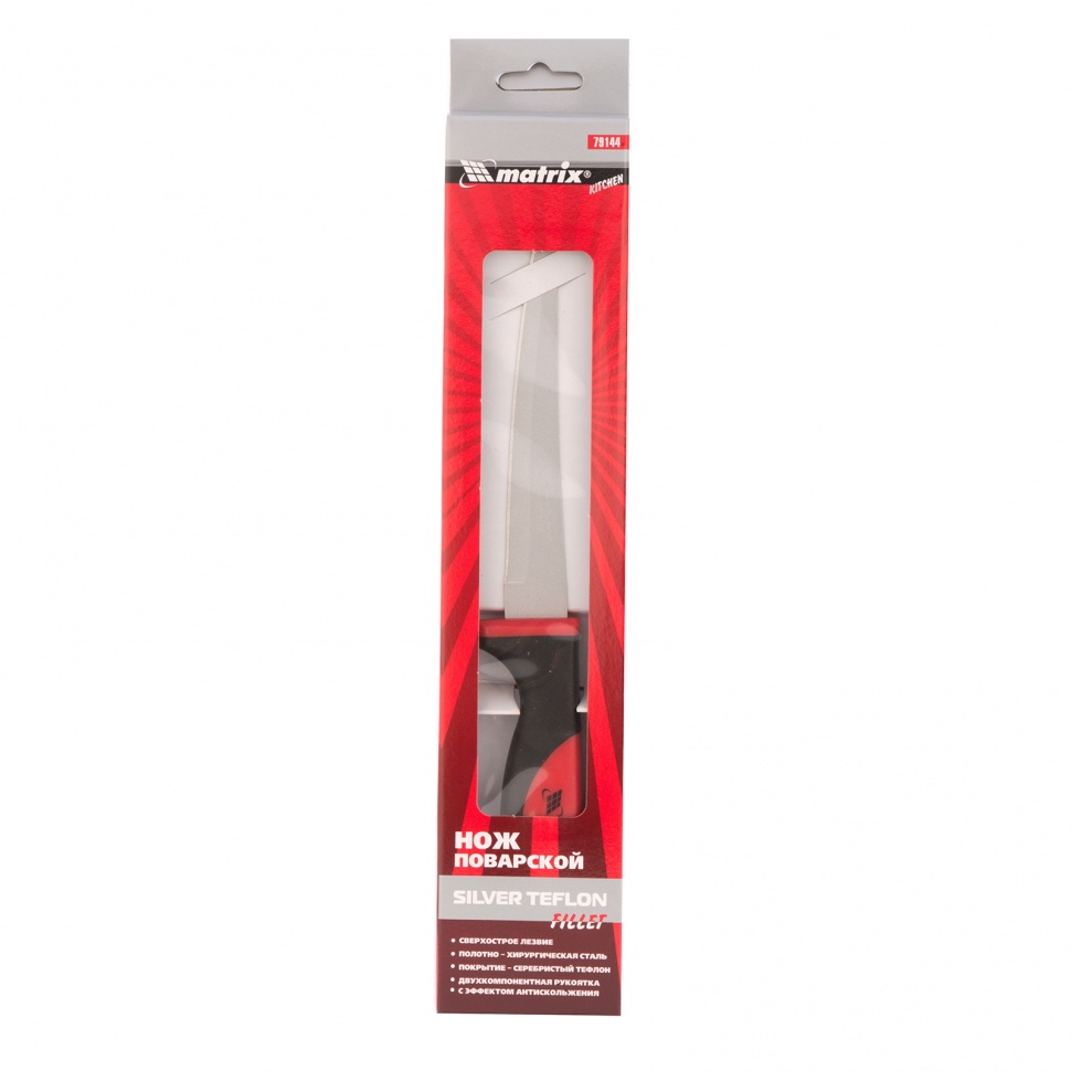 Поварской нож Matrix Kitchen «Silver Teflon» fillet 79144 с лезвием длиной 160 мм, с тефлоновым покрытием полотна и двухкомпонентной рукояткой, применяется для нарезания филе рыбы или мяса. Высокопрочное и износостойкое серебристое тефлоновое покрытие характеризуется минимальным коэффициентом трения, что исключает налипание кусочков продуктов на полотно. Нож пригодится на каждой кухне.