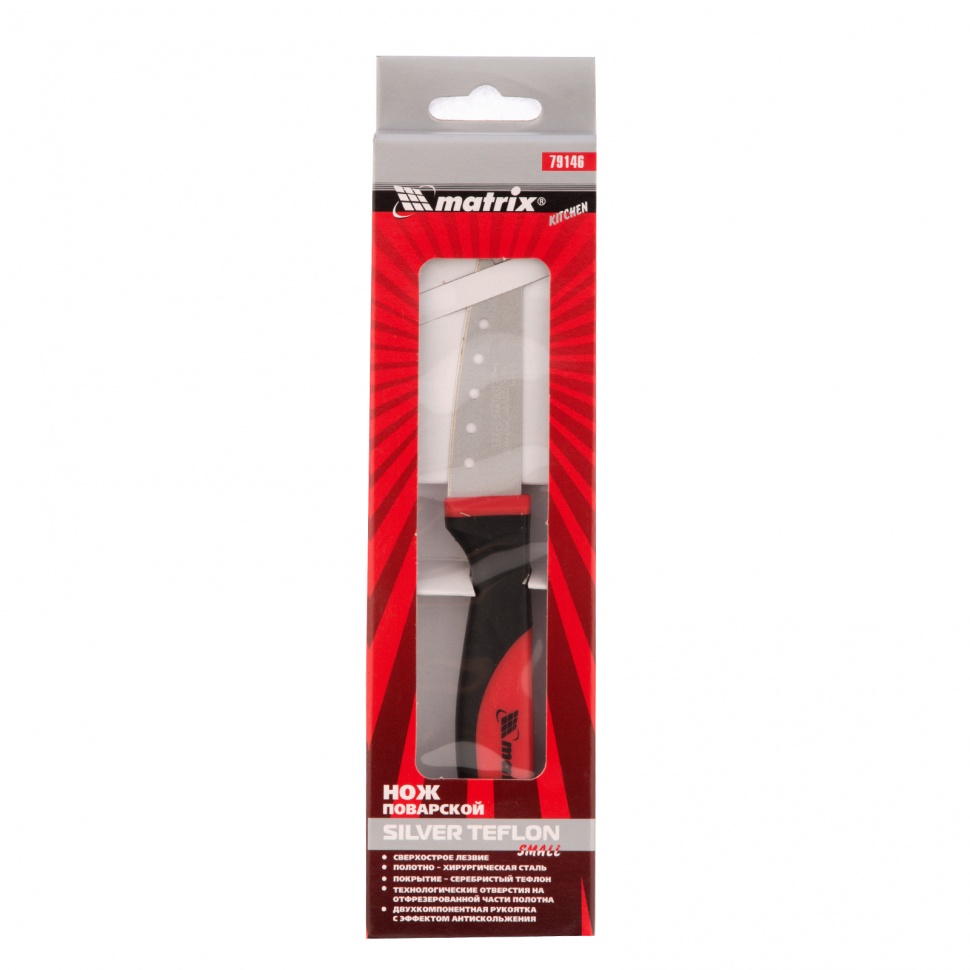 Поварской нож Matrix Kitchen «Silver Teflon» small 79146 с лезвием длиной 80 мм, с тефлоновым покрытием полотна и двухкомпонентной рукояткой, применяется для нарезания всех видов продуктов: сыра, колбасы, ветчины и других закусок, а также мяса, птицы, рыбы, овощей, фруктов и зелени. Благодаря технологическим отверстиям в полотне продукты не прилипают к клинку. Нож пригодится на каждой кухне.