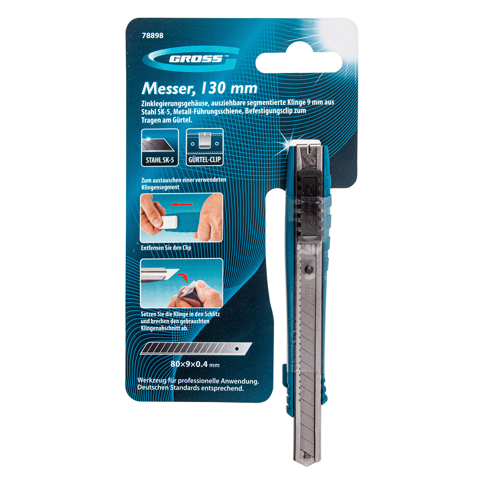 Нож Gross 78898 из стали SK-5, длиной 130 мм, в металлическом корпусе, с выдвижным сегментным лезвием шириной 9 мм, металлической направляющей и клипсой для ремня, — профессиональный инструмент, предназначенный для разрезания бумаги, картона, кожи, обоев и других материалов. Используется при проведении ремонтных и отделочных работ, будет полезен в хозяйстве.