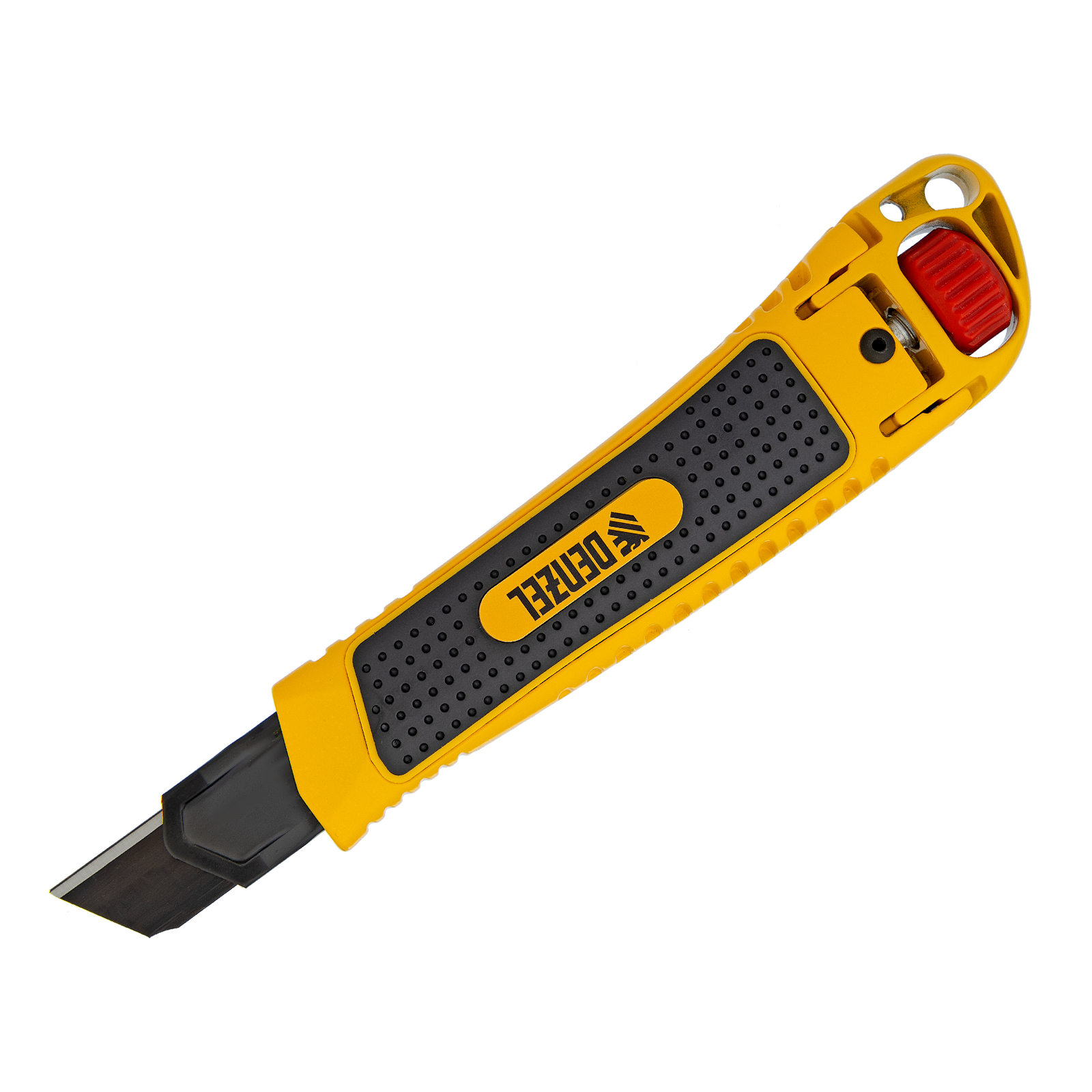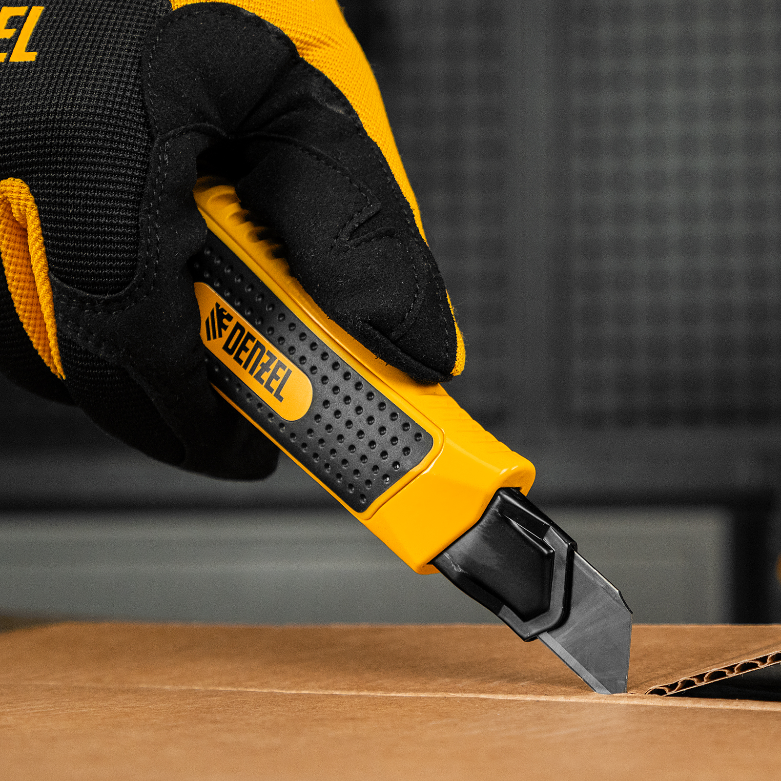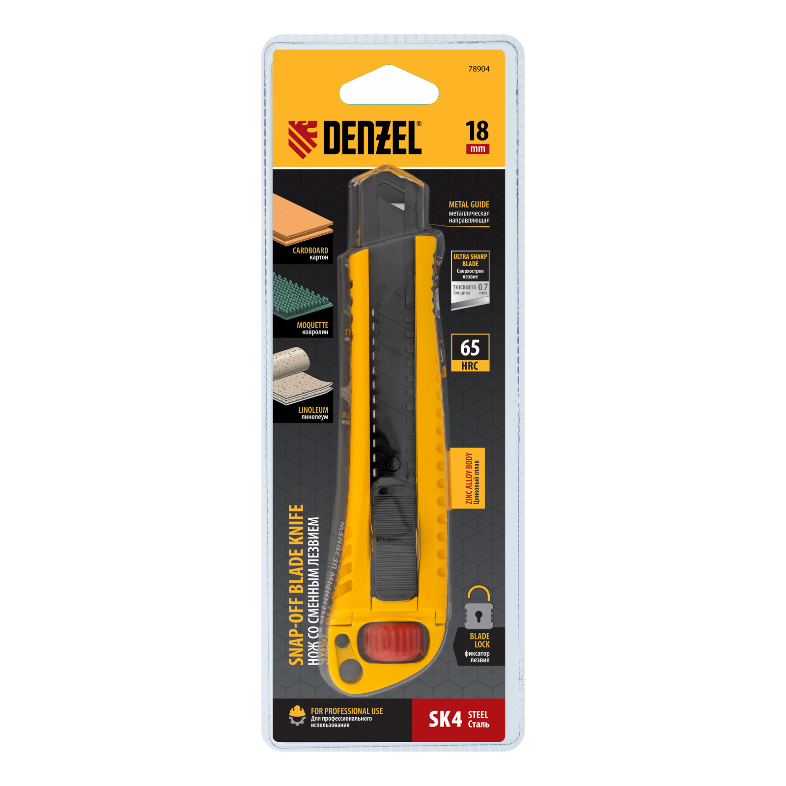 Нож Denzel 78904 выполнен в корпусе из цинкового сплава с вставкой из термопластичной резины TPR, оснащен сменным лезвием шириной 18 мм, изготовленным из стали SK4 по технологии UltraSharp, и торцевым зажимом. Сверхострое выдвижное лезвие легко режет линолеум, ковролин, бумагу, обои, картон и другие листовые материалы. Нож будет полезен для проведения профессиональных ремонтных и отделочных работ, пригодится также в домашнем хозяйстве.