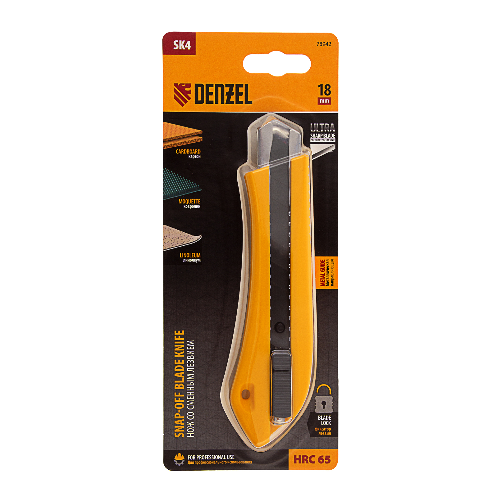 Нож Denzel 78942 со сменным лезвием шириной 18 мм, изготовленным из стали SK4, оснащен нажимным фиксатором и металлической направляющей. Сверхострое выдвижное лезвие легко режет линолеум, ковролин, бумагу, обои, картон и другие листовые материалы. Нож рекомендован для профессионального применения, пригодится также в домашнем хозяйстве.