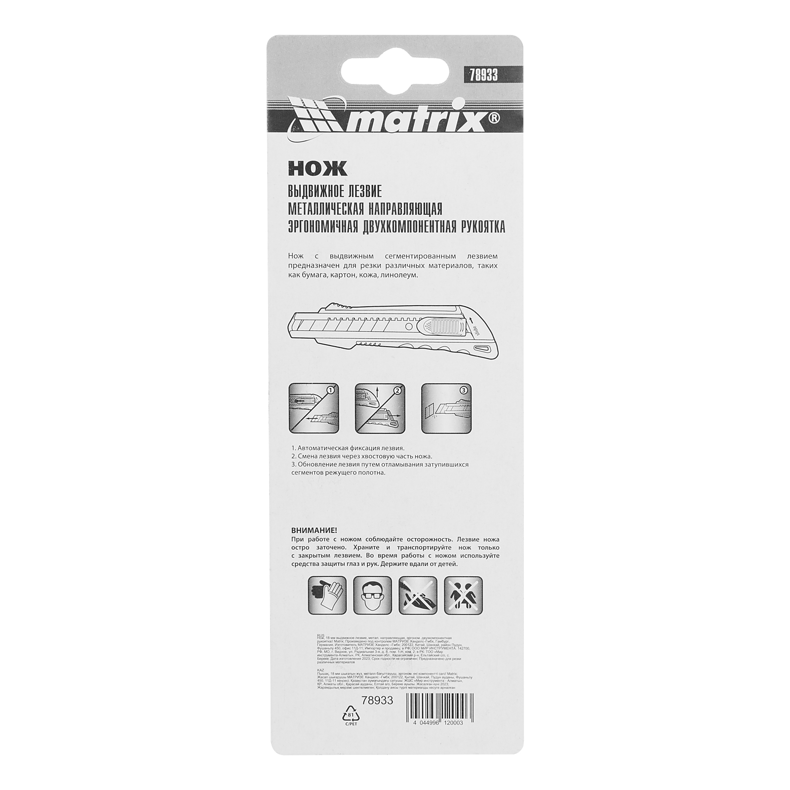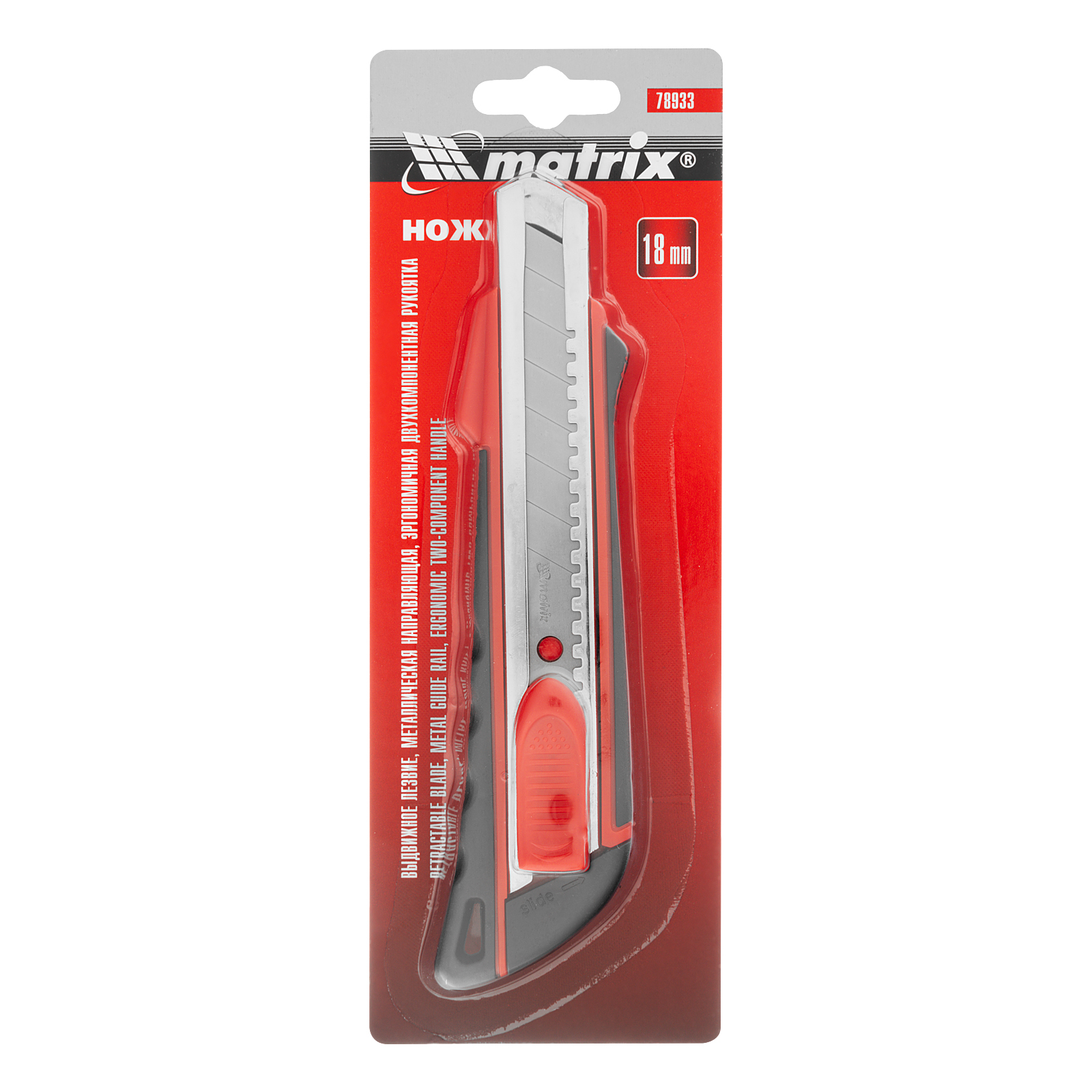 Нож Matrix 78933 с выдвижным лезвием шириной 18 мм, металлической направляющей и эргономичной двухкомпонентной рукояткой пригодится при выполнении ремонтных и строительных работ в мастерской и в быту. Он легко режет бумагу, картон, кожу, обои и другие материалы. Выдвижная конструкция позволяет с удобством эксплуатировать и безопасно перевозить нож.