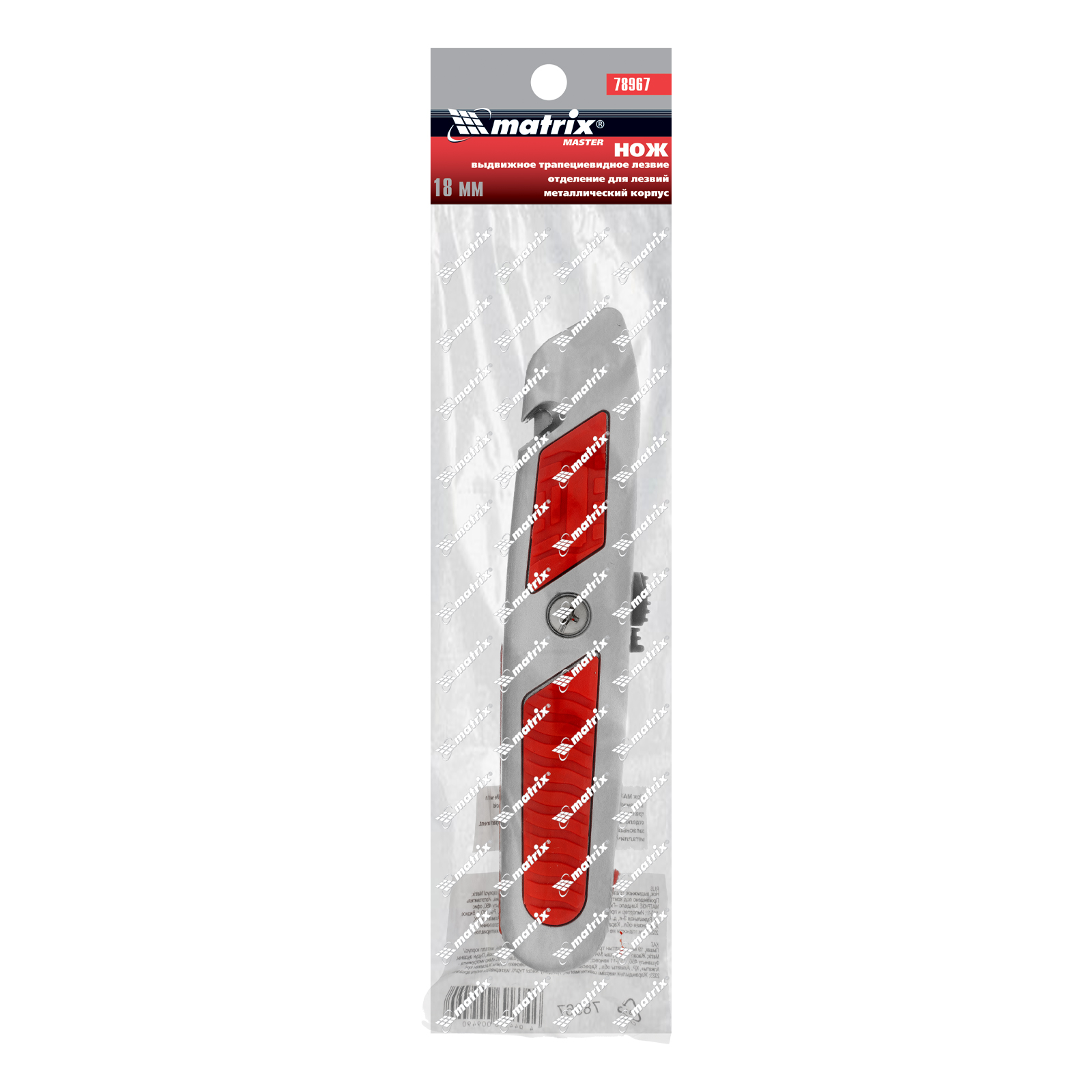 Нож Matrix 78967 с выдвижным трапециевидным лезвием и отделением для лезвий, в металлическом корпусе, режет бумагу, картон, кожу, линолеум и обои. Может применяться в качестве стропореза: для этого в корпусе предусмотрена специальная выемка. Лезвие сменное, артикул совместимых расходников 793555. Металлический корпус выдерживает значительные усилия. Нож будет полезен во время проведения строительных и отделочных работ, а также пригодится в быту.