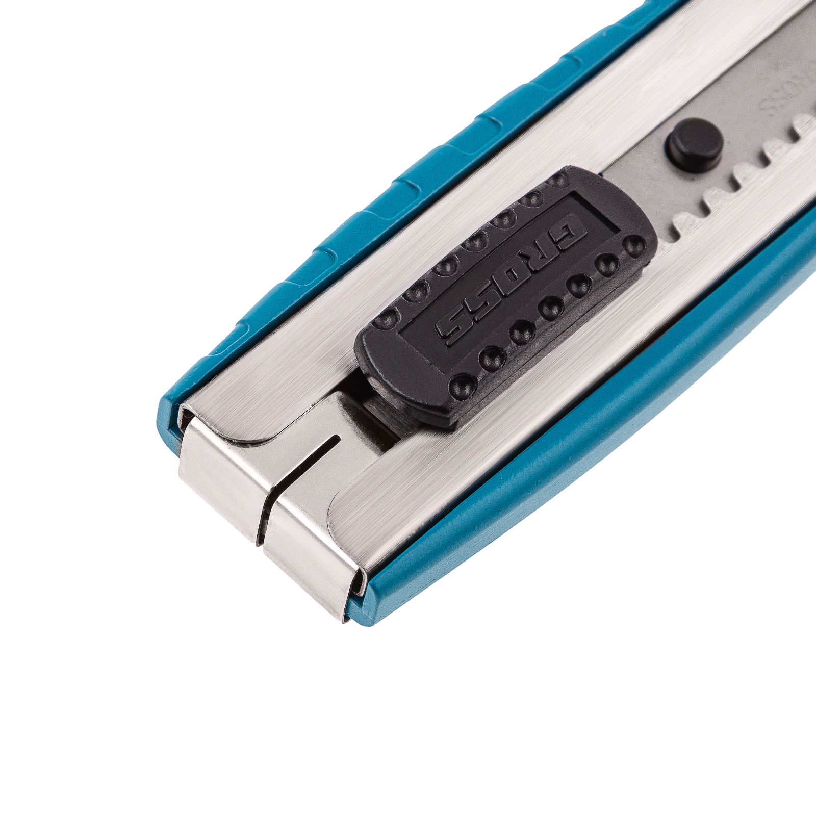Нож Gross 78896 из стали SK-5, длиной 195 мм, в металлическом корпусе, с выдвижным сегментным лезвием шириной 25 мм, металлической направляющей и клипсой для ремня, — профессиональный инструмент, предназначенный для разрезания линолеума, картона, кожи, обоев и других материалов. Используется при проведении ремонтных и отделочных работ, будет полезен в хозяйстве.