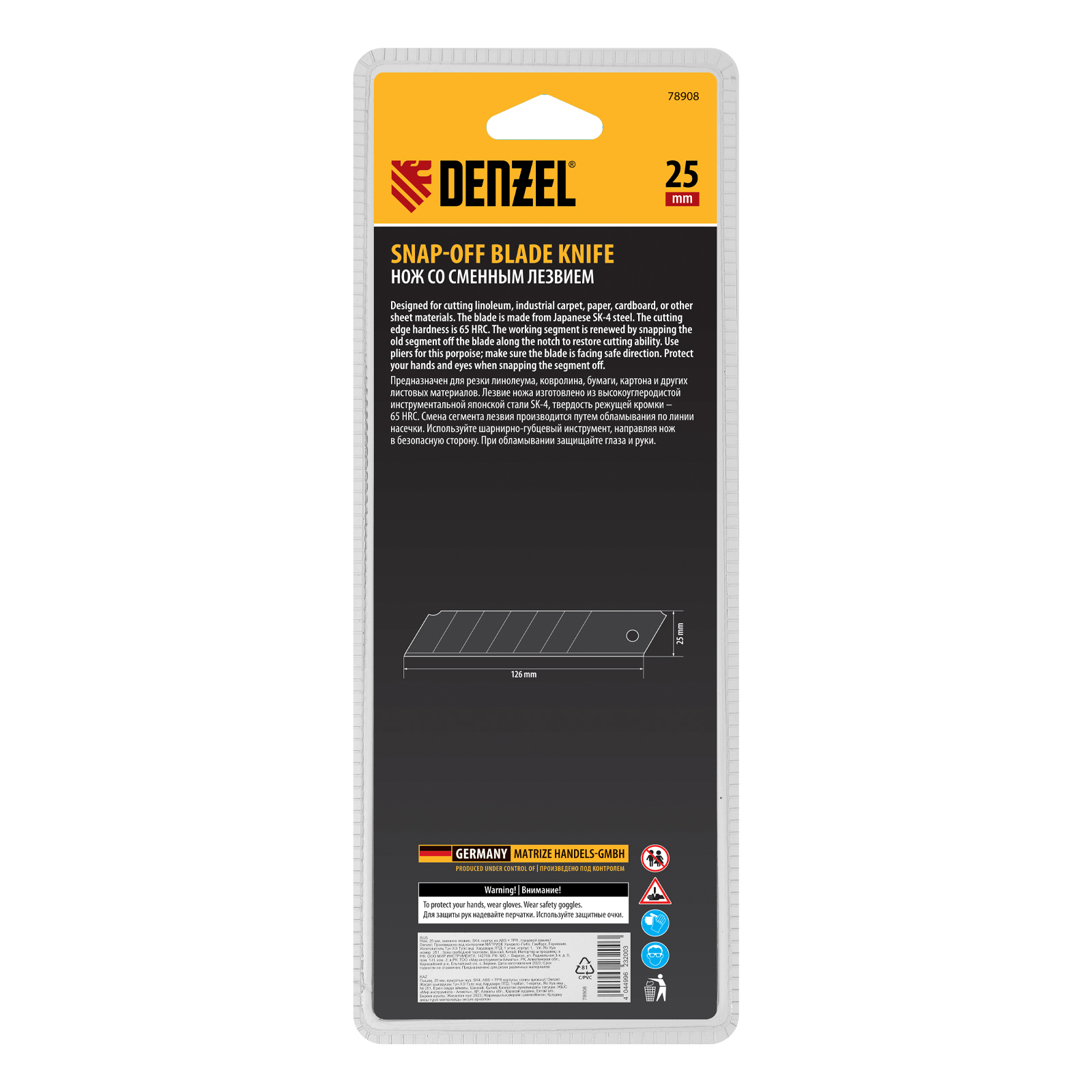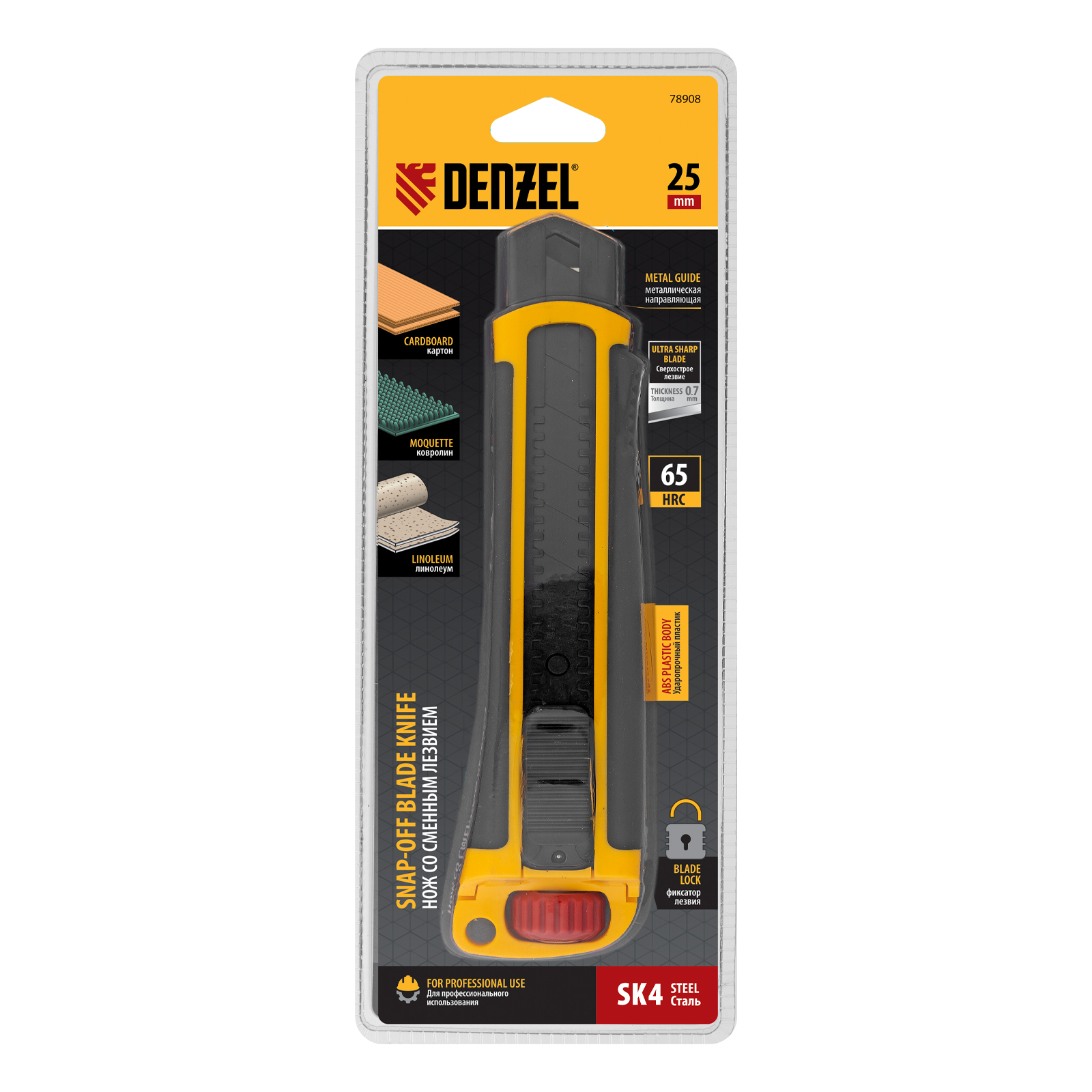 Нож Denzel 78908 выполнен в корпусе из ABS-пластика со вставками из термопластичной резины TPR, оснащен сменным лезвием шириной 25 мм, изготовленным из стали SK4 по технологии UltraSharp, и торцевым зажимом. Сверхострое выдвижное лезвие легко режет линолеум, ковролин, бумагу, обои, картон и другие листовые материалы. Нож будет полезен для проведения профессиональных ремонтных и отделочных работ, пригодится также в домашнем хозяйстве.