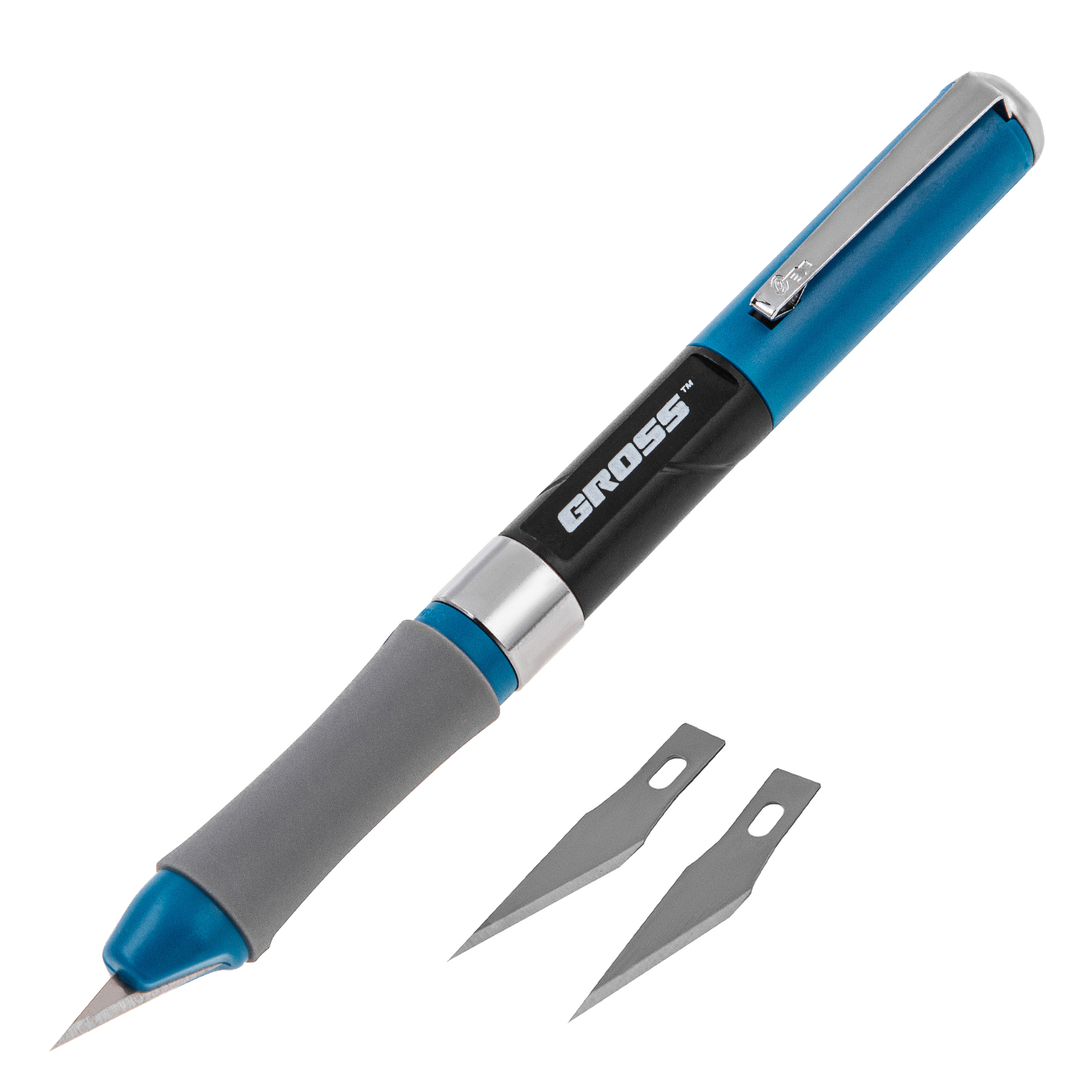 Нож для дизайна Gross 78885 длиной 150 мм, с выдвижным перовым лезвием, двухкомпонентной рукояткой, металлической клипсой для фиксации и 2 запасными лезвиями, предназначен для точной резьбы по дереву. Используется при проведении мелких столярных работ, пригодится также для занятий творчеством.