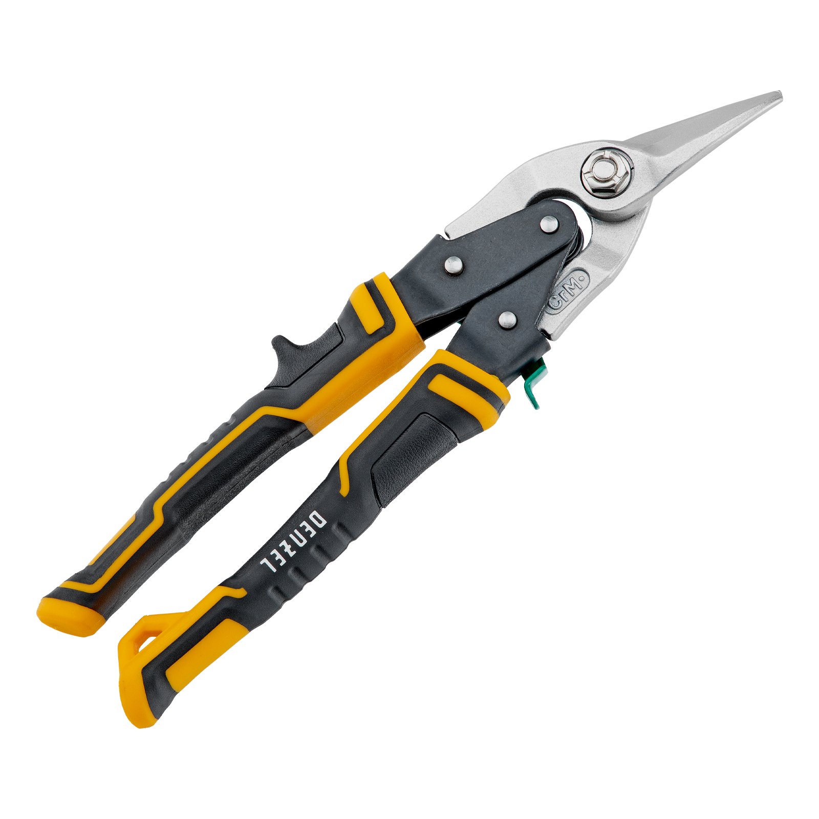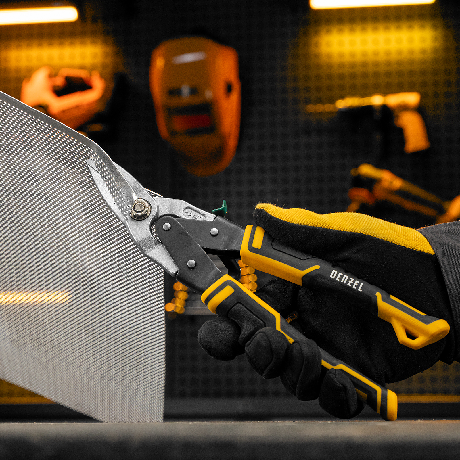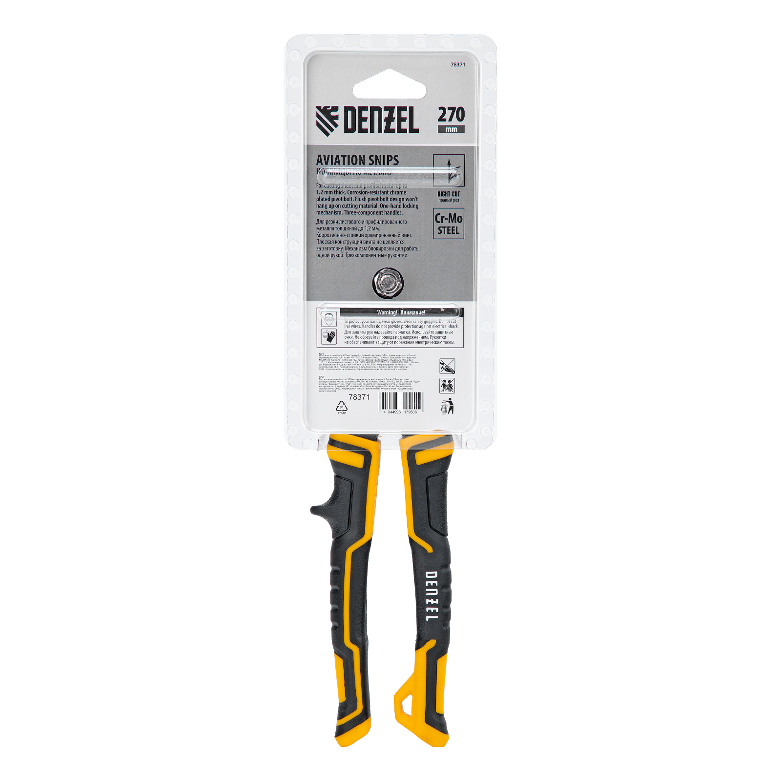 Ножницы по металлу Denzel 78371 общей длиной 270 мм, из стали-CrMo, с трехкомпонентными рукоятками, предназначены для прямого и правого реза листовых металлических заготовок и металлопрофиля толщиной до 1,2 мм. Инструмент с усиленной конструкцией осевого шарнира рассчитан на профессиональное использование. Ножницы используются для проведения строительных, кровельных и слесарных работ.