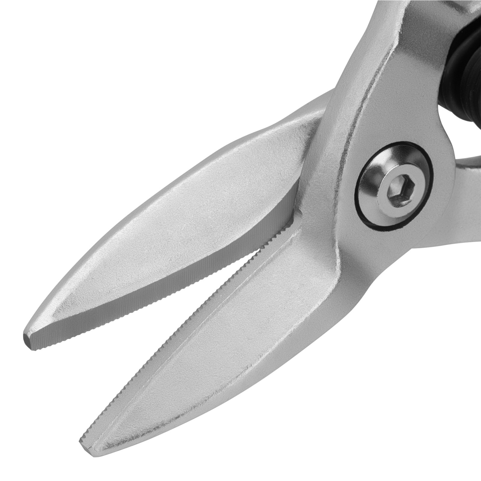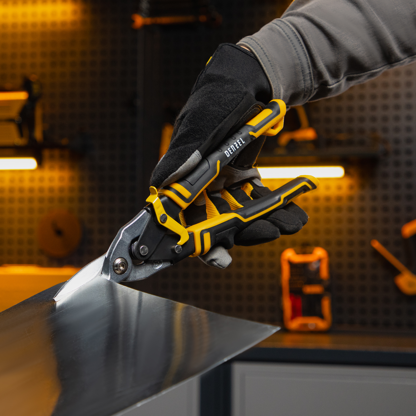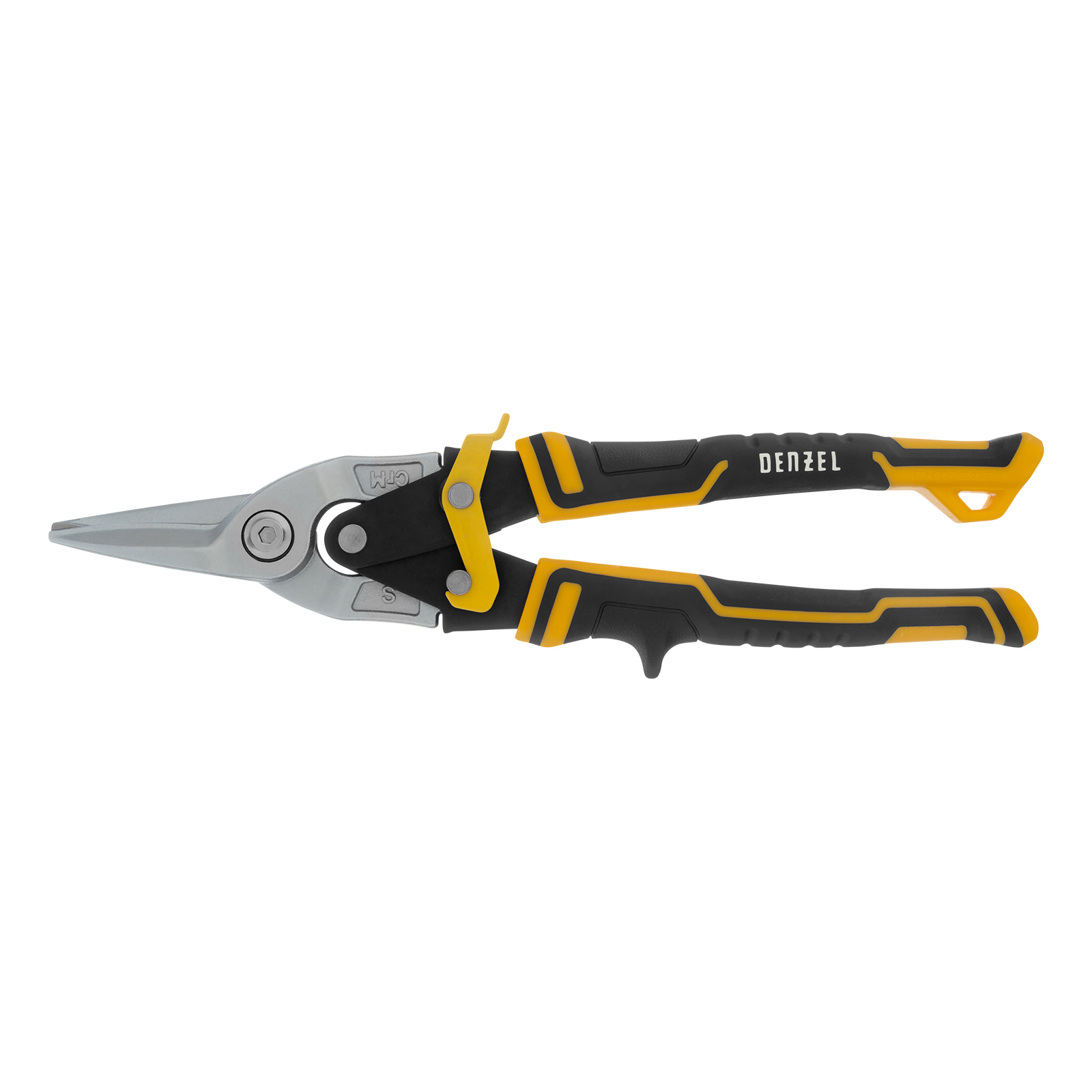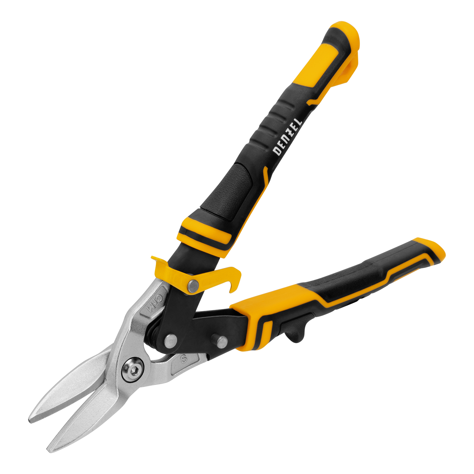 Ножницы по металлу Denzel 78370 общей длиной 270 мм, из стали-CrMo, с трехкомпонентными рукоятками, предназначены для прямого реза листовых металлических заготовок и металлопрофиля толщиной до 1,2 мм. Инструмент с усиленной конструкцией осевого шарнира рассчитан на профессиональное использование. Ножницы используются для проведения строительных, кровельных и слесарных работ.