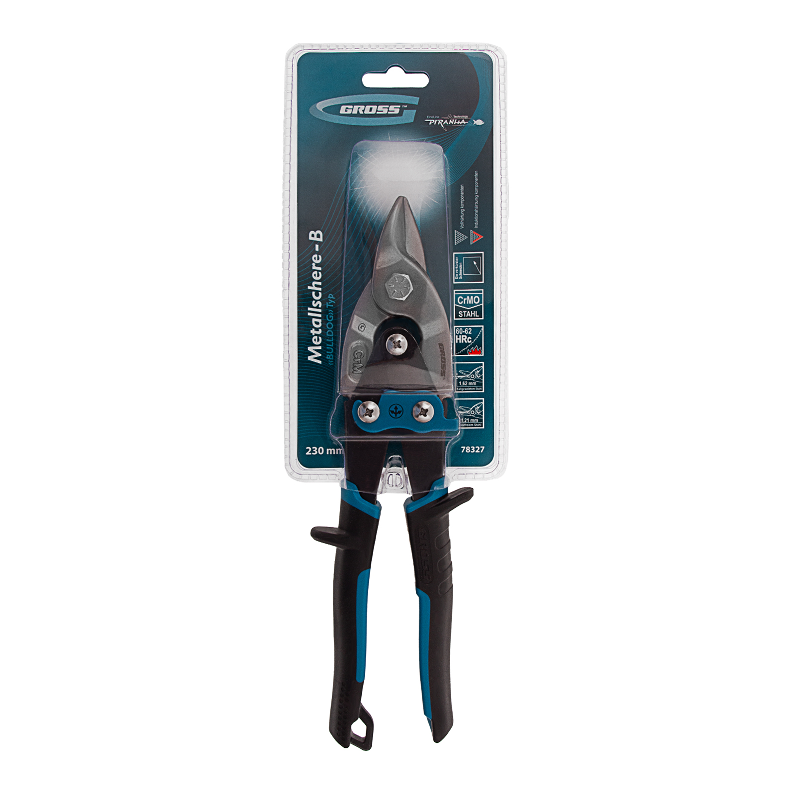 Ножницы по металлу Gross PIRANHA 78327 длиной 230 мм, из стали CrMo, с двухкомпонентными рукоятками и механизмом «bulldog», предназначены для прямого усиленного реза плоских заготовок из цветных металлов и сталей разных марок. Благодаря усиленному двухрычажному механизму «bulldog» инструмент справляется с холоднокатаной сталью толщиной до 1,6 мм и с «нержавейкой» толщиной до 1,2 мм. Ножницы рекомендованы для профессионального применения, пригодятся также и в быту.