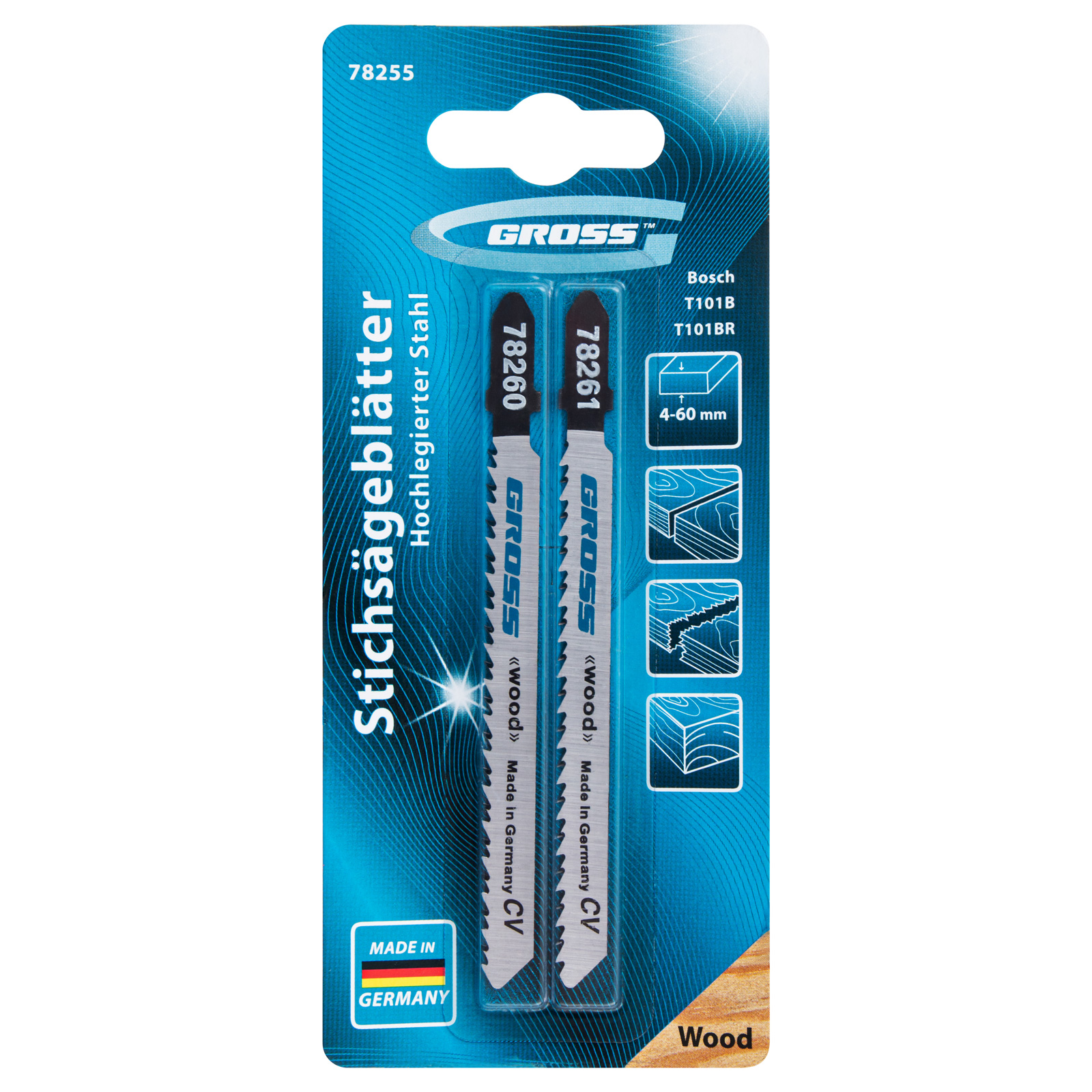 Набор полотен для электролобзика Gross 78255, 2шт. (T101B, T101BR), — это профессиональный инструмент для работ по дереву. Он рассчитан на распил древесины любых пород, а также фанеры, ДВП и пластика. Полотна позволяют осуществить чистый и быстрый рез. Благодаря длине 100 мм они справляются с распилом материалов толщиной 4-60 мм.
