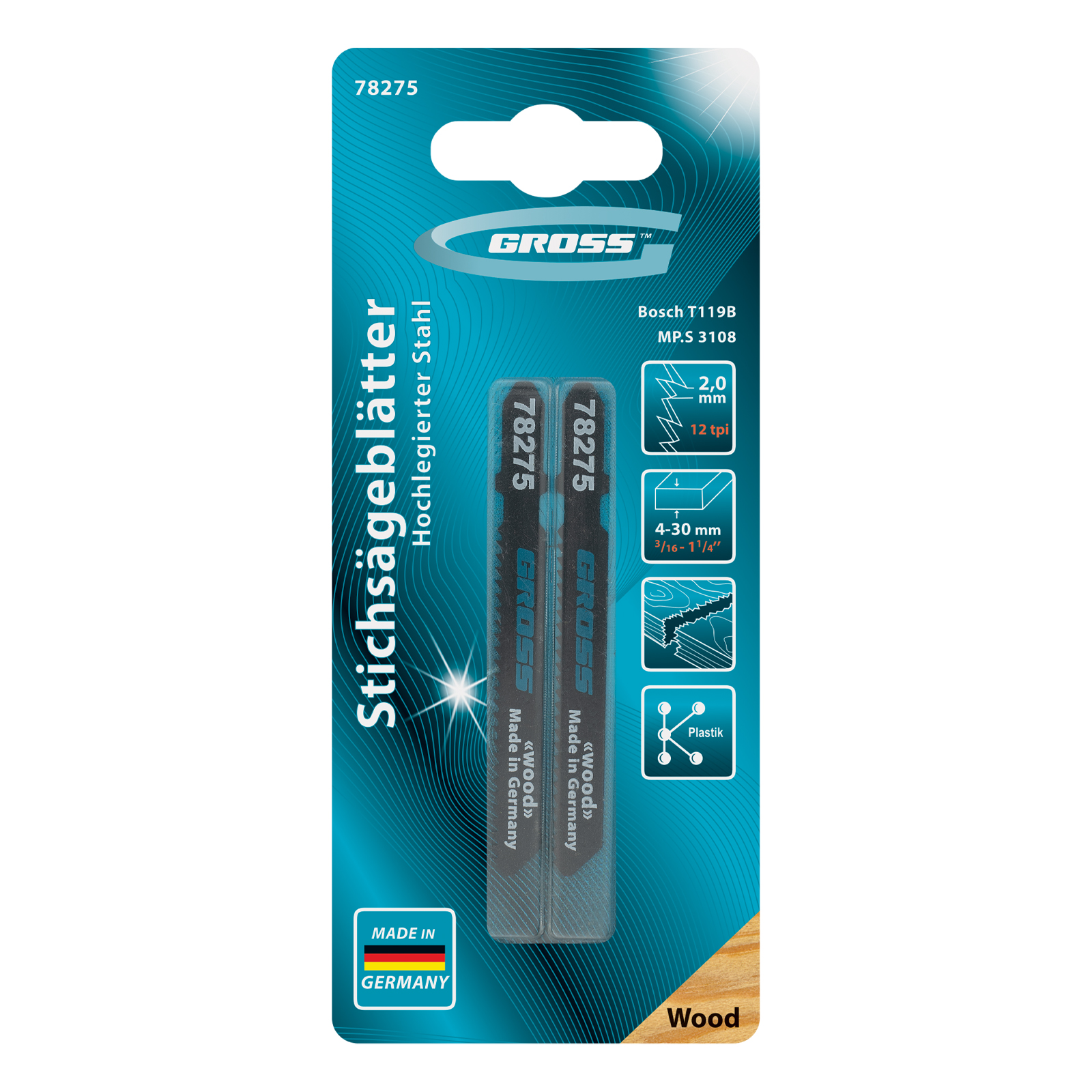 Полотна для электролобзика по дереву Gross 78275, 2 шт. (3108 - T119B), используются для работы с древесиной ДСП, ДВП, МДФ, композитных материалов на основе древесины и т.д. Они рассчитаны на профессиональное применение и пригодятся при проведении строительных и ремонтных работ. За счет длины 75 мм и толщины 1 мм полотна способны распилить заготовки толщиной 4-30 мм.