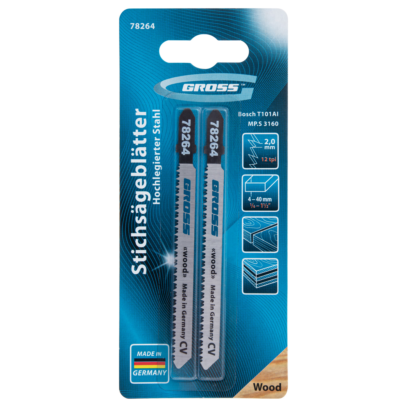 Полотна для электролобзика по дереву Gross 78264, 2 шт. (3160 - T101AI), используются для работы с древесиной мягких и твердых пород, ДСП, ДВП и композитных материалов на основе древесины. Они рассчитаны на профессиональное применение, пригодятся при проведении строительных и ремонтных работ. За счет рабочей длины 75 мм и толщины 1,45 мм полотна способны распилить заготовки толщиной 3-60 мм.