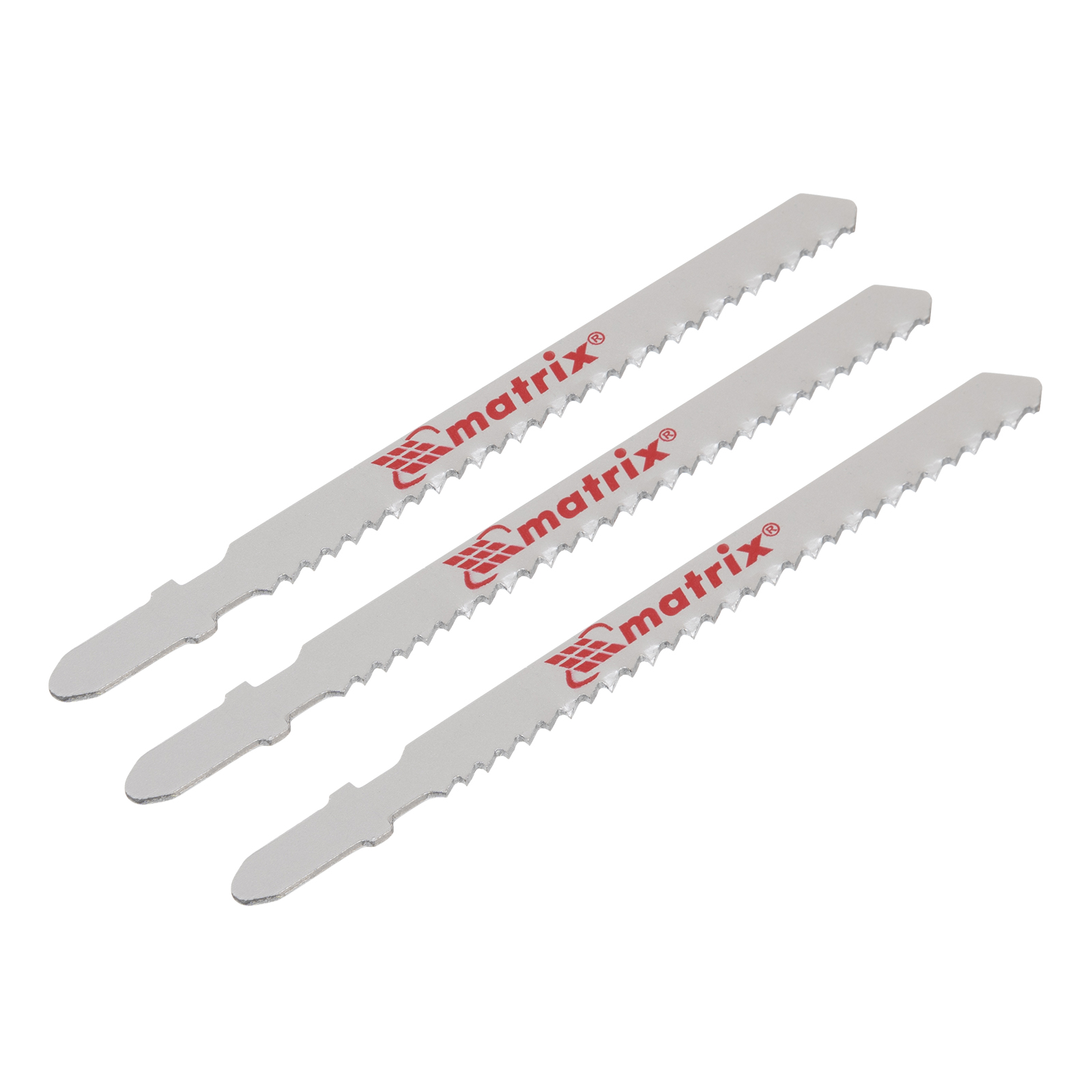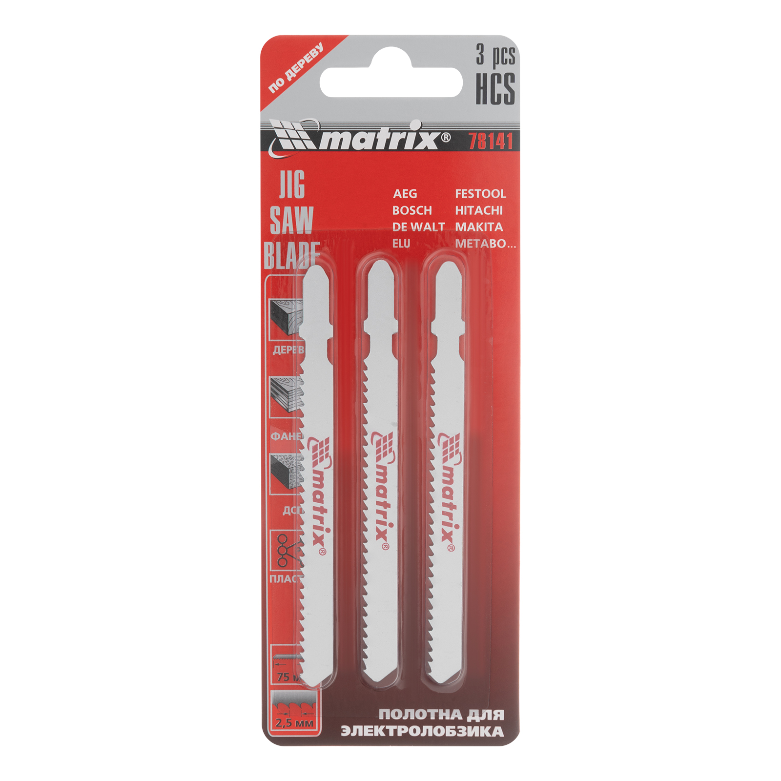 Полотна для электролобзика по дереву Matrix 78141 с рабочей длиной 75 мм и шагом зубьев 2,5 мм, из стали HCS, с EU-хвостовиком, 3 шт. в упаковке, — элементы оснастки электрического пильного инструмента. Применяются для распила древесины, фанеры, ДСП и пластика. Классическая разводка зубьев позволяет уменьшить нагрев полотен и повысить скорость пиления. Полотна подходят для профессионального использования и применения в домашних условиях.