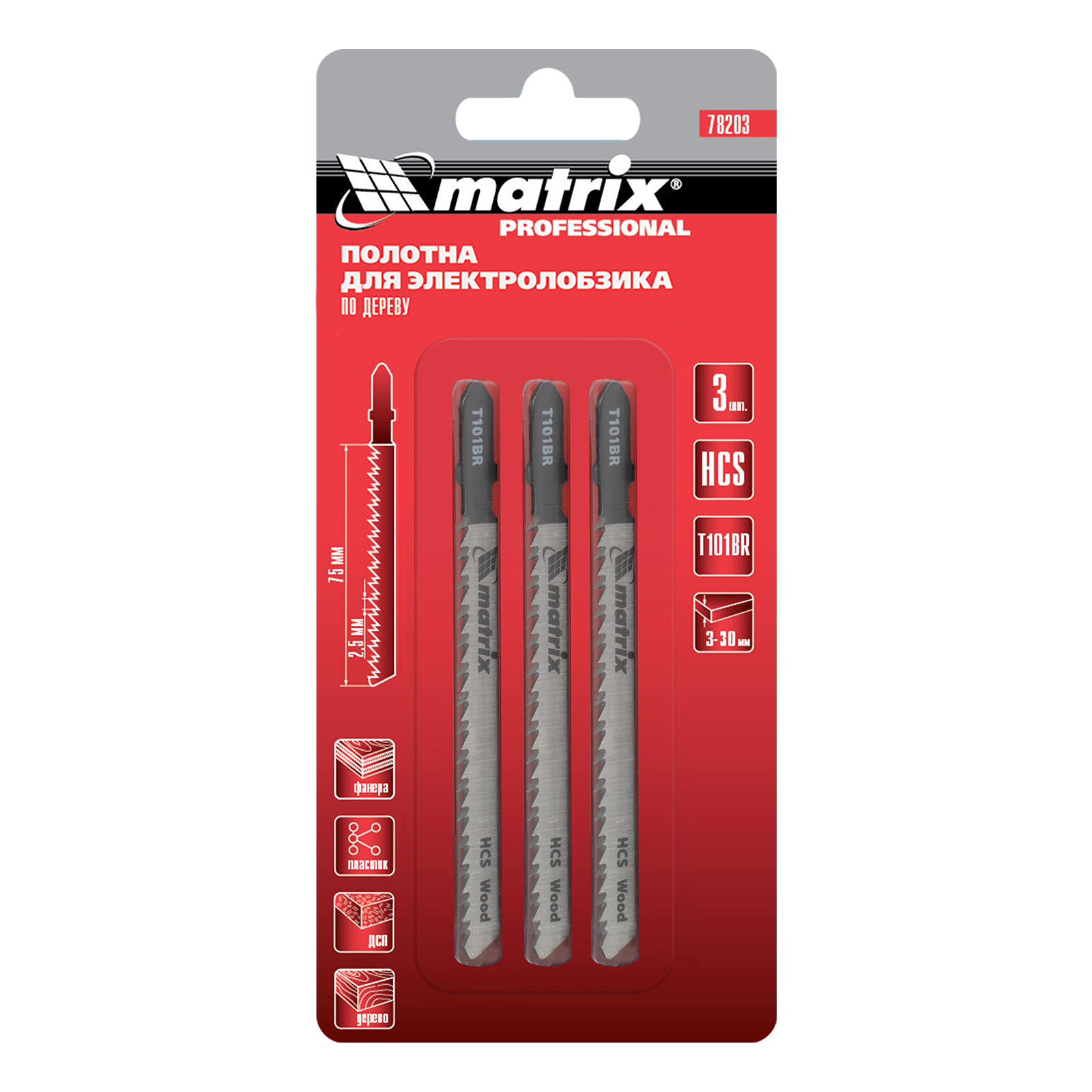 Полотна по дереву T101BR Matrix 78203 с рабочей длиной 75 мм и шагом зубьев 2,5 мм, с обратным зубом, из стали HCS, — оснастка для электролобзика в комплекте из 3 шт. Предназначены для прямого реза фанеры, древесины, ДСП, ДВП и пластика толщиной от 3 до 30 мм. Имеют стандартный Т-образный хвостовик, совместимый с держателями большинства современных моделей электролобзиков. Обратное направление зубьев позволяет чисто распиливать заготовки с лицевой стороны. Полотна используются для проведения профессиональных столярных работ, а также будут полезны в быту.