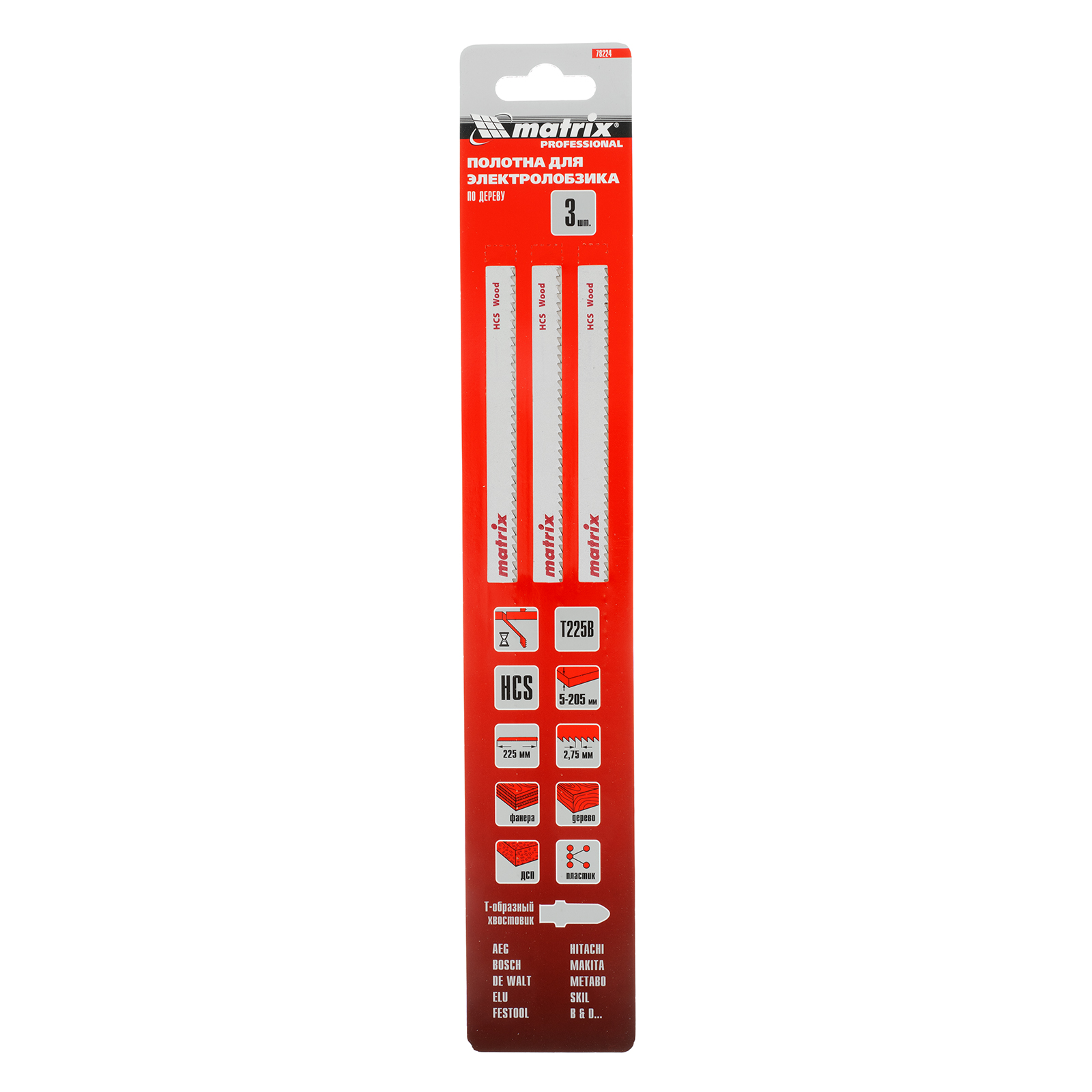 Полотна для электролобзика T225B Matrix 78224 с рабочей длиной 225 мм и шагом зубьев 2,75 мм, из стали HCS, — комплект оснастки из 3 пилок, предназначенных для выполнения работ по дереву. Распиливают заготовки значительной толщины из древесины, фанеры и ДСП. Совместимы с электролобзиками, оснащенными зажимами под Т-образный хвостовик. Подойдут для выполнения строительных, ремонтных и столярных работ.