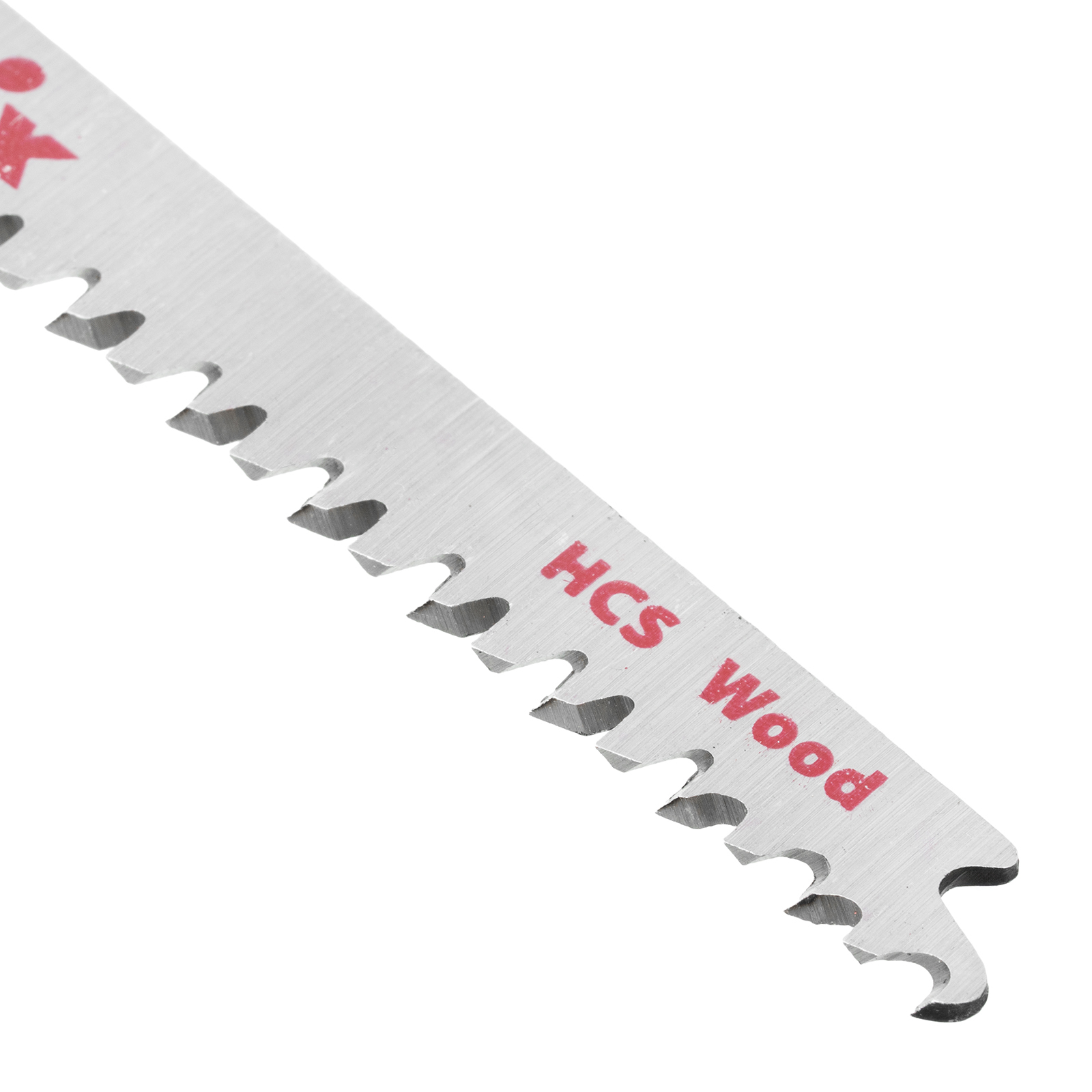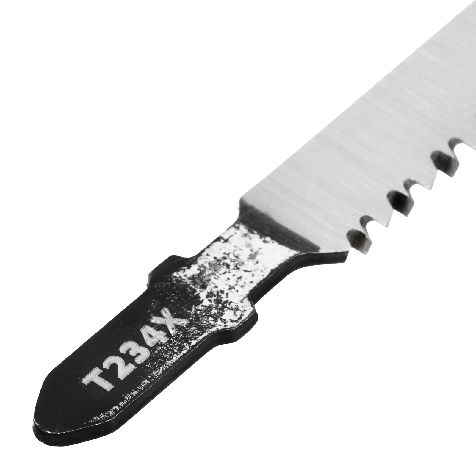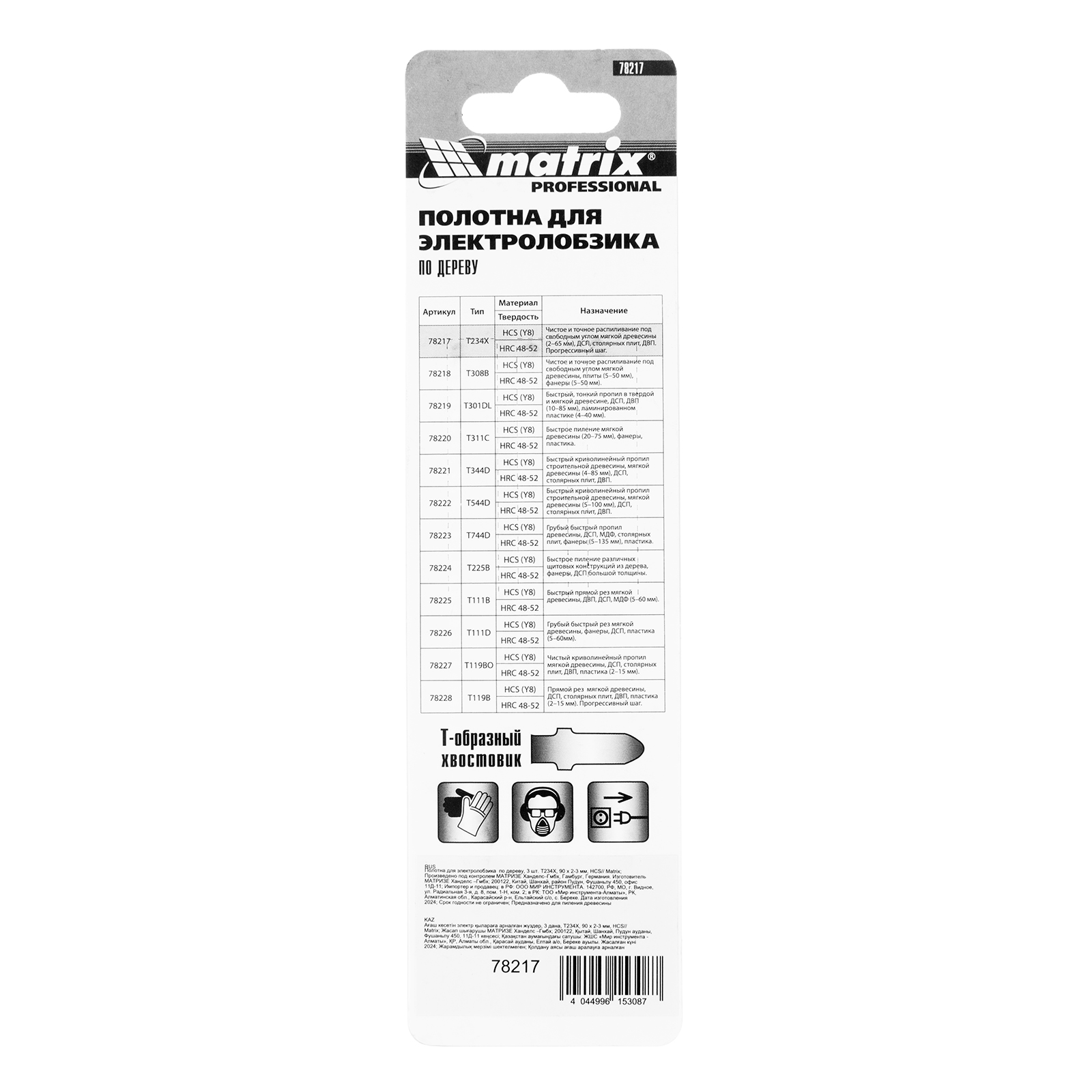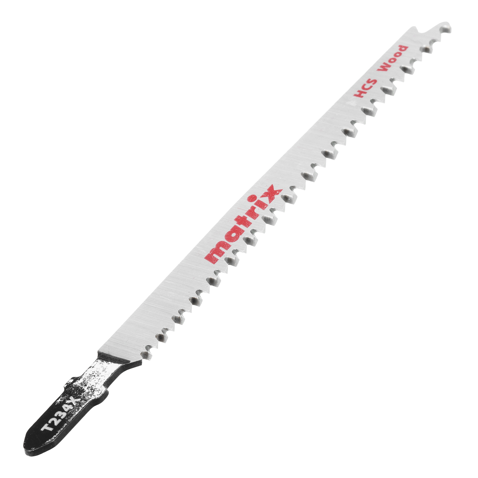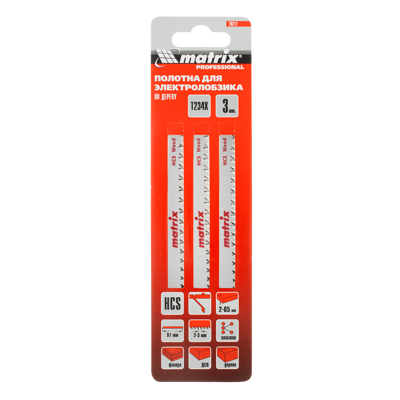 Полотна для электролобзика по дереву T234X Matrix 78217 с рабочей длиной 90 мм и шагом зубьев 2-3 мм, из стали HCS, — набор оснастки из 3 шт. Предназначены для распиловки древесных плит, ДСП и ДВП толщиной 2-65 мм. Устанавливаются на электролобзики, совместимые с оснасткой с Т-образным хвостовиком. Полотна используют во время проведения столярных или ремонтных работ.
