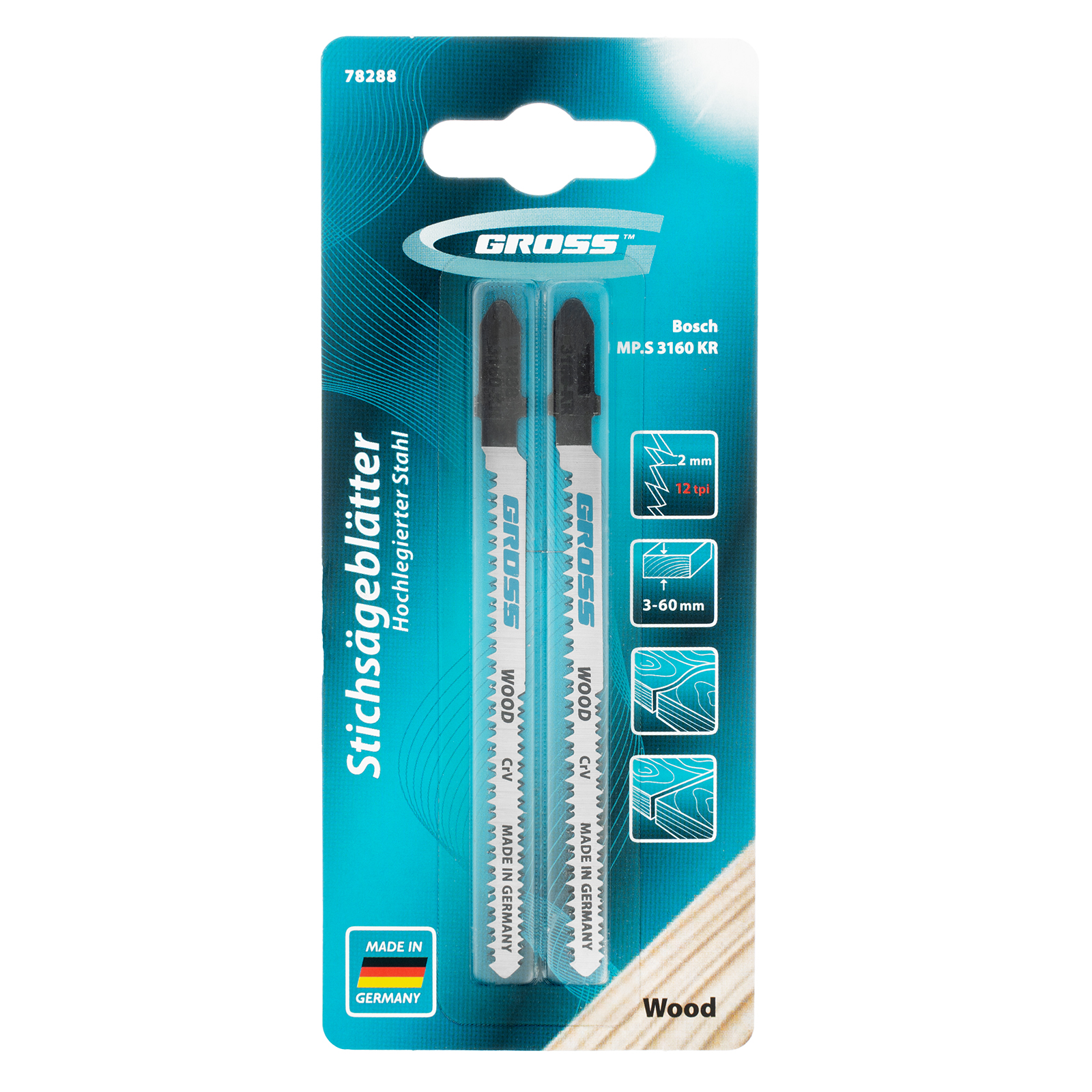 Двухсторонние полотна для электролобзика по дереву Gross 78288, 2 шт. (3160 KR), подходят для прямого и чистого фигурного реза материалов. Могут применяться для обработки древесины, фанеры, ДСП, ДВП, а также пластика толщиной 3-60 мм. Двухсторонний профиль обеспечивает качественный гладкий распил, полотна рассчитаны на профессиональное применение.