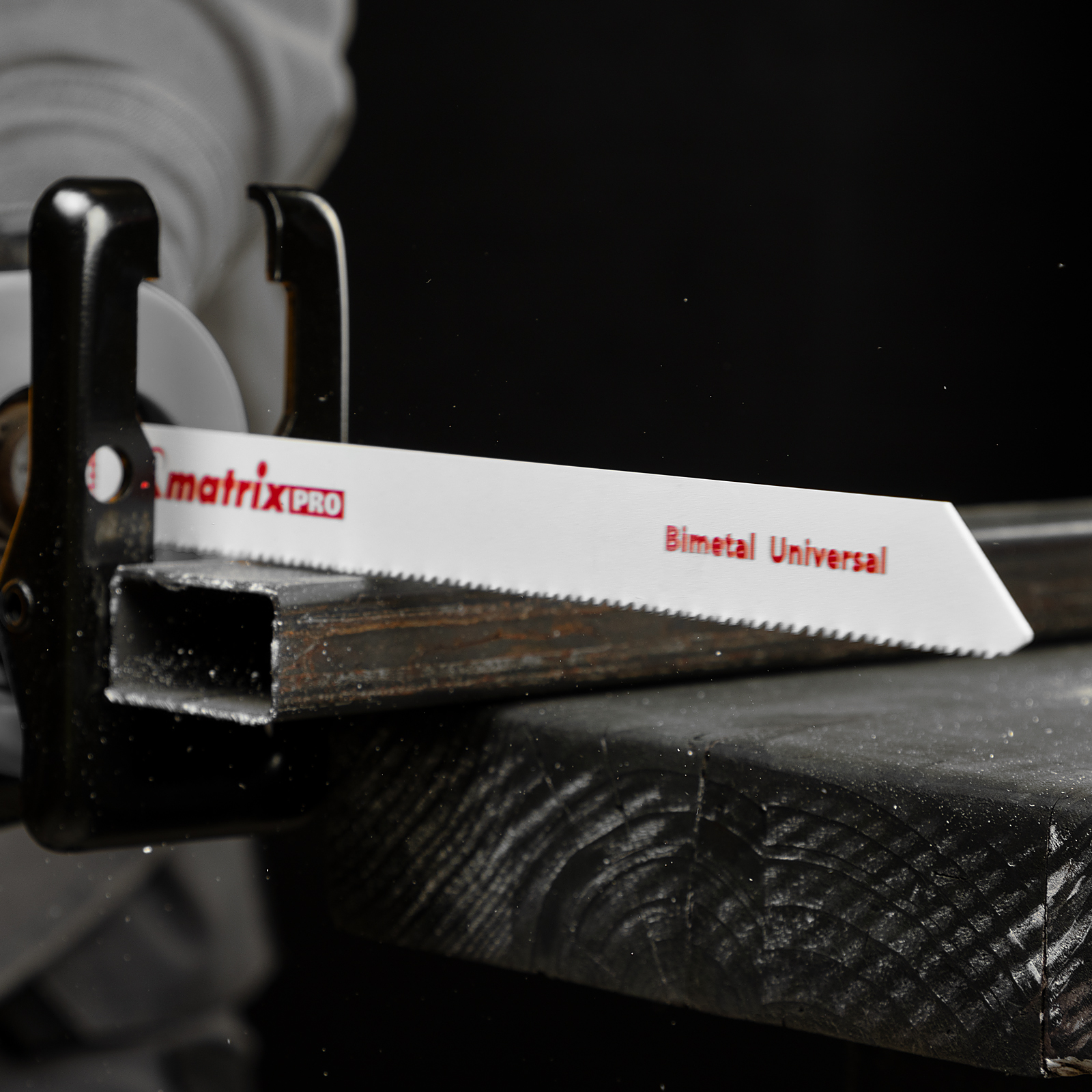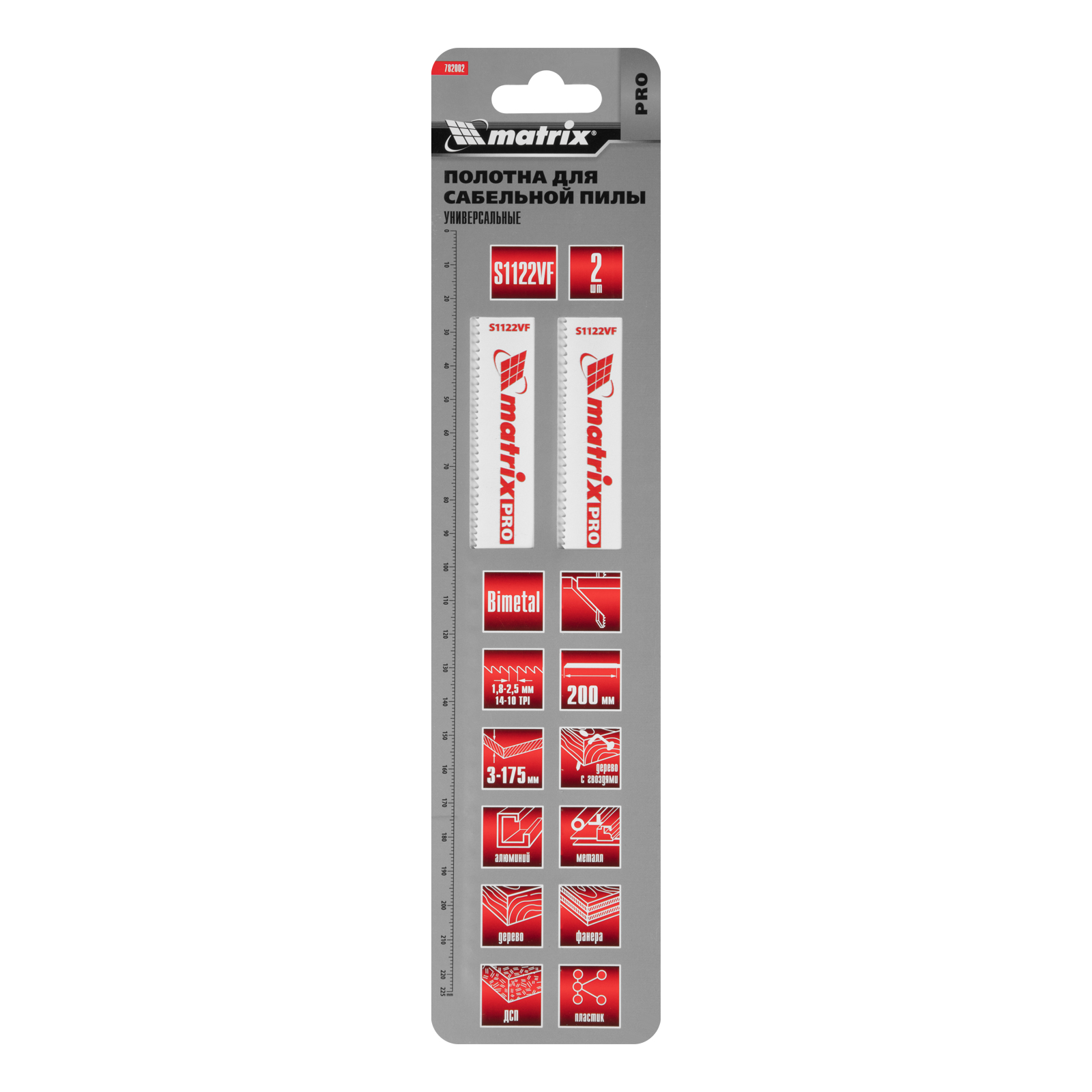 Универсальные полотна для сабельной пилы S1122VF Matrix PRO 782002 с переменным шагом зубьев 1,8-2,5 мм, биметаллические (Bimetal), 2 шт. в упаковке, имеют рабочую длину 200 мм и позволяют быстро и качественно распиливать заготовки из древесины, пластика, листового металла, фанеры, ДСП, справляются также с алюминиевыми профилями и древесиной с гвоздями. В зависимости от материала глубина распила составляет от 3 до 175 мм. Полотна пригодятся на строительной площадке, во время ремонта, демонтажа различных конструкций, будут полезны дома и на даче.