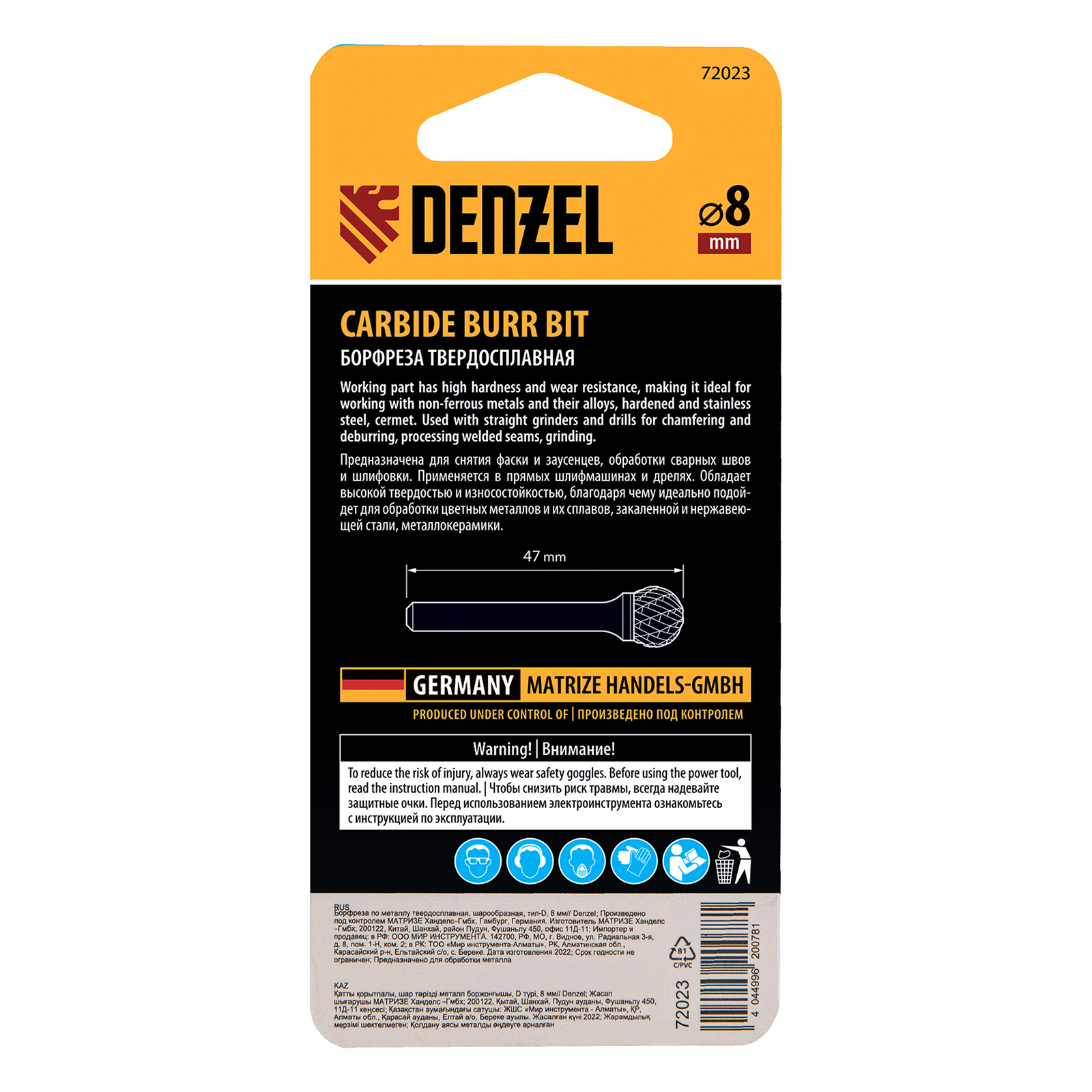 Твердосплавная борфреза Denzel 72023 с шарообразной рабочей частью (тип D), диаметром 8 мм, предназначена для шлифовальных работ по металлу. Используется для обработки закаленной и нержавеющей стали, чугуна, титана, латуни, меди, бронзы. Подходит для шлифовки искусственного камня и металлокерамики. Режущая часть в форме сферы особенно удобна для обработки радиусных пазов и внутренних отверстий. Также борфреза позволяет удалять заусенцы и возвращать первоначальный вид гравировке. Оснастка устанавливается на дрель или прямошлифовальную машину.