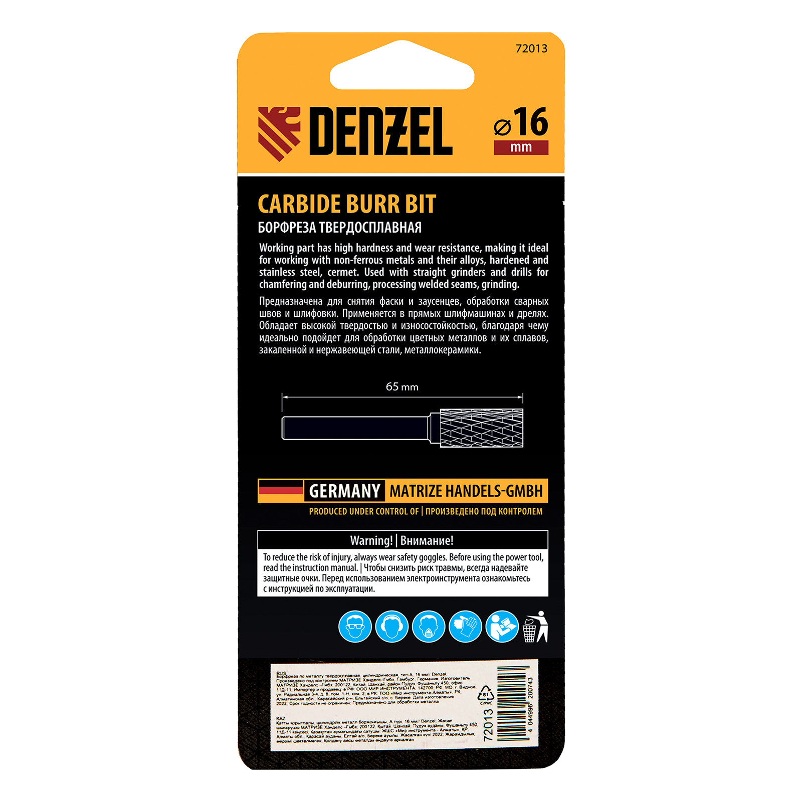 Твердосплавная борфреза Denzel 72013 с цилиндрической рабочей частью (тип A), диаметром 16 мм, используется для работ по металлу (закаленной и нержавеющей стали, латуни, меди, бронзе, чугуну, титану). Подходит также для обработки искусственного камня и металлокерамики. Предназначена для завершающей обработки и подгонки форм и поверхностей: шлифовки, зачистки сварных швов, удаления заусенцев, снятия фасок, разделки кромок. Оснастка устанавливается на прямошлифовальную машину или дрель.