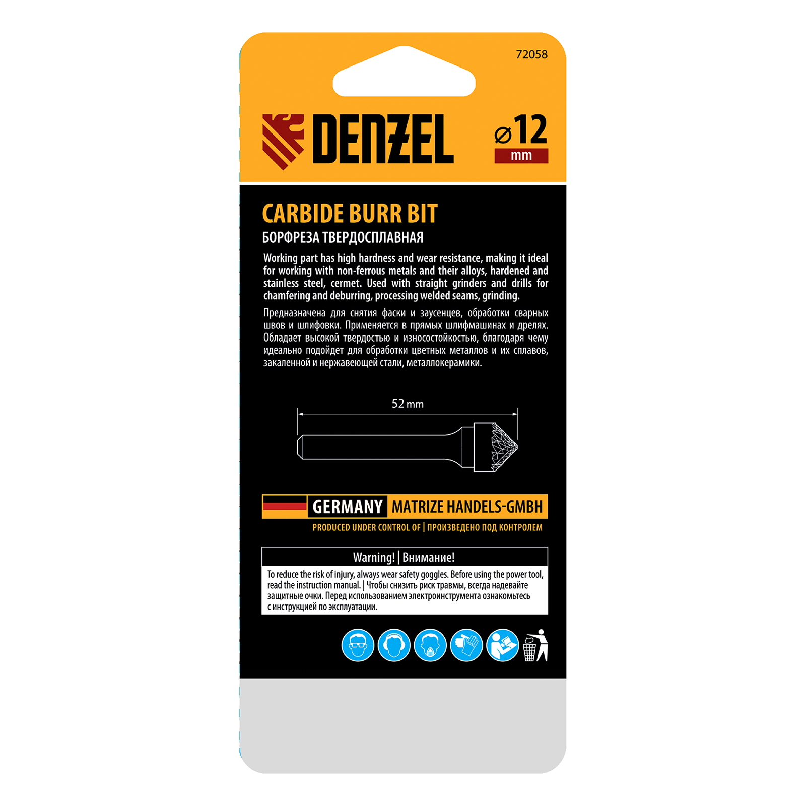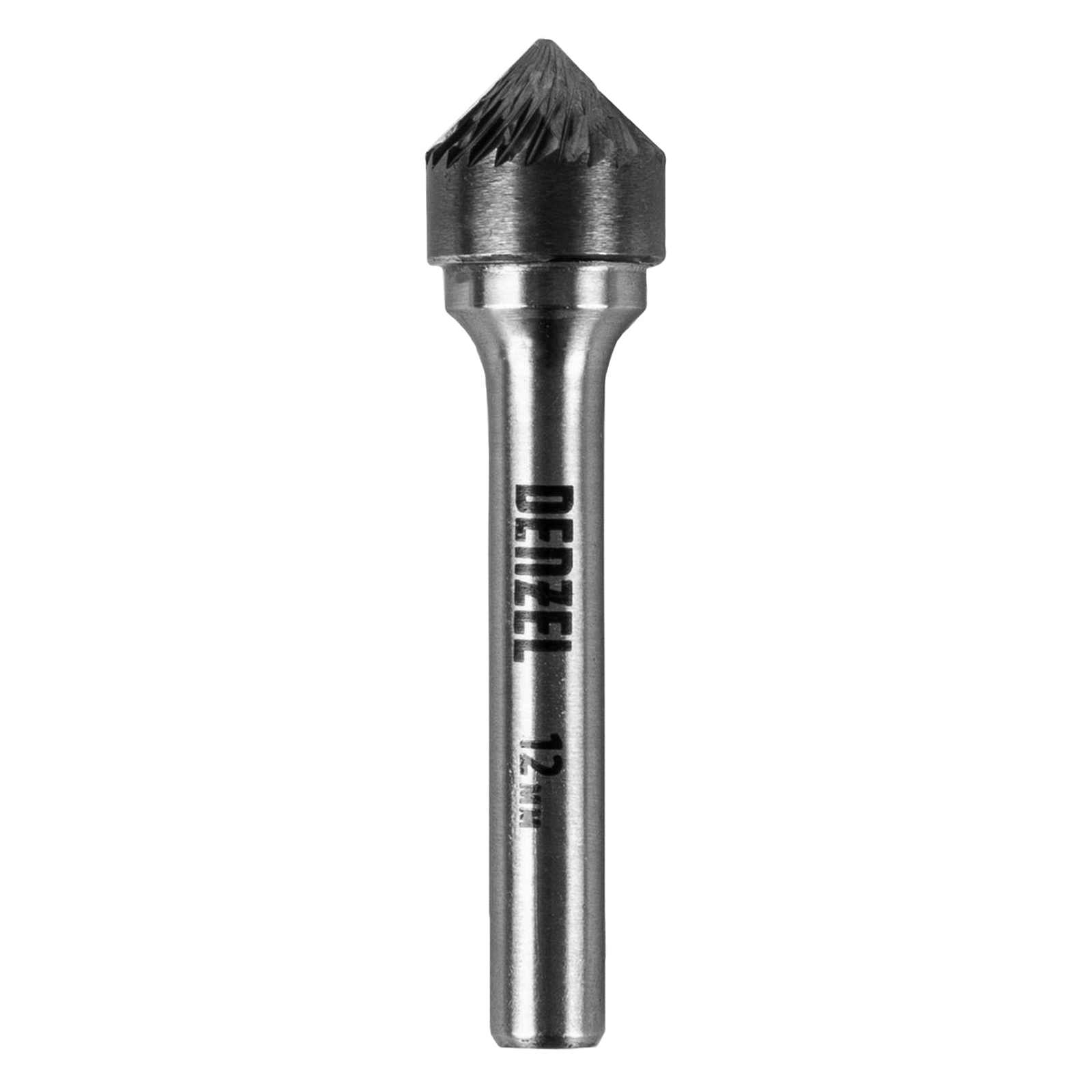 Твердосплавная борфреза по металлу Denzel 72058 с рабочей частью-зенкером с вершиной 90° (тип K), диаметром 12 мм, устанавливается на дрель или прямошлифовальную машину. Используется для обработки закаленной и нержавеющей стали, латуни, бронзы, меди, чугуна, титана, а также металлокерамики и искусственного камня. Оптимальна для снятия фасок и заусенцев, обработки кромок, угловых пазов, краев отверстий.