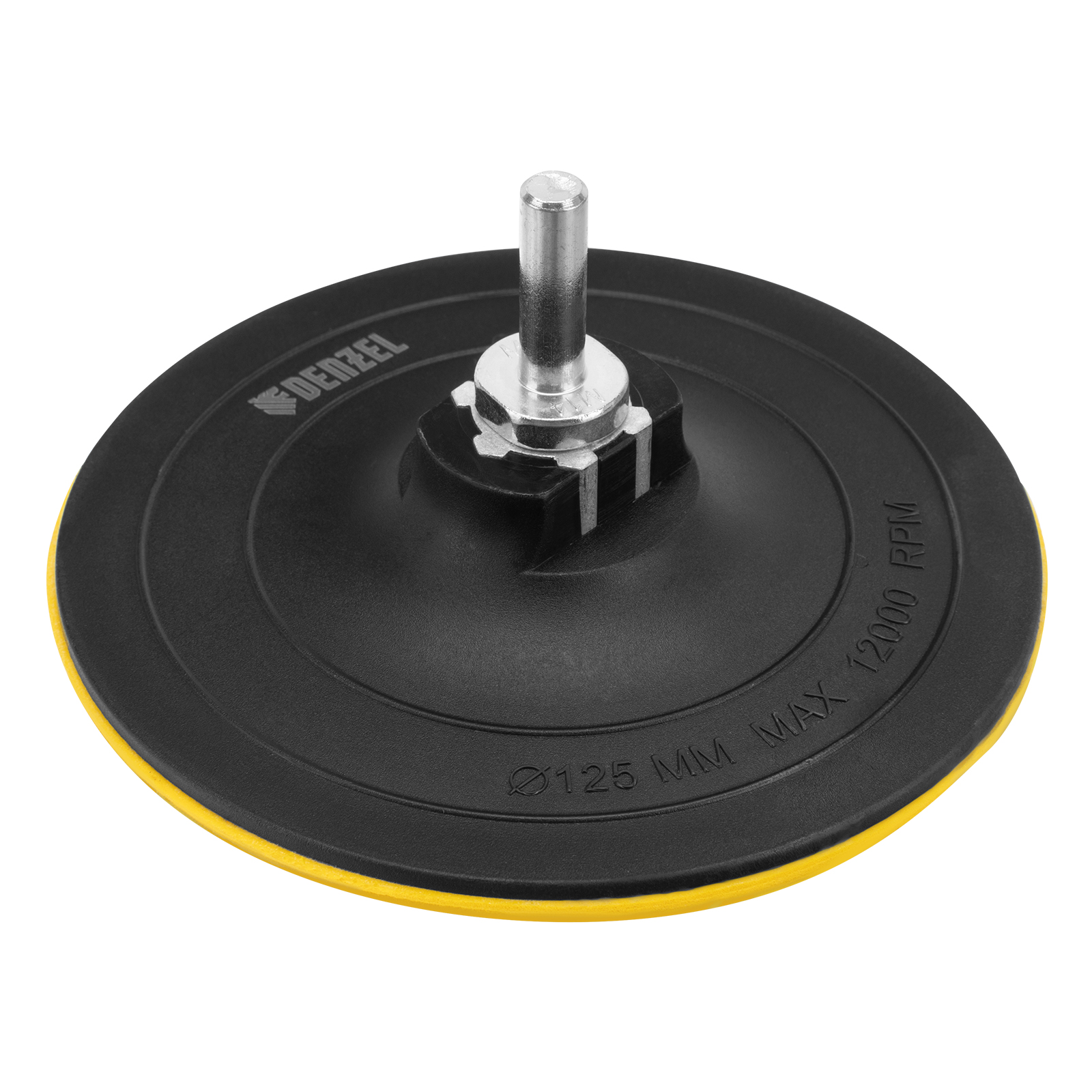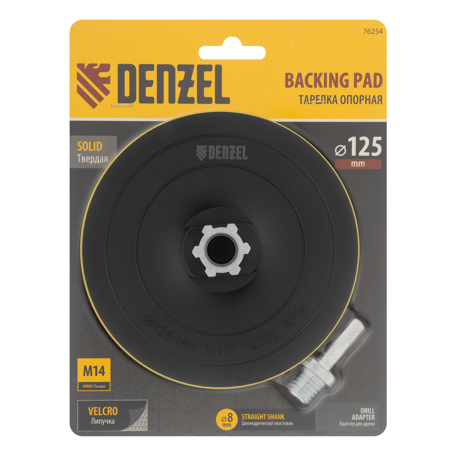 Тарелка опорная Denzel 76254 диаметром 125 мм, с липучкой и адаптером с М14 на d8, твердая, устанавливается на дрель или углошлифовальную машину (УШМ). Используется для крепления абразивных или полировальных кругов на ворсовой основе, позволяет подготовить поверхность для дальнейшей обработки или придать ей финишную гладкость.