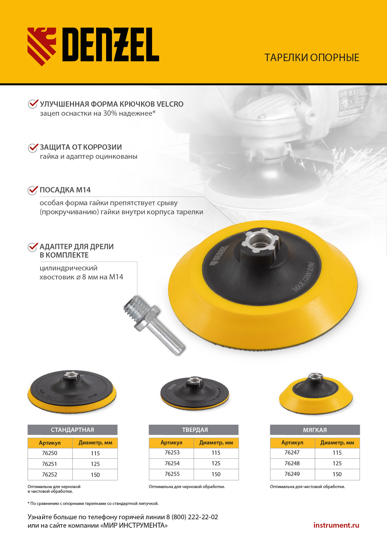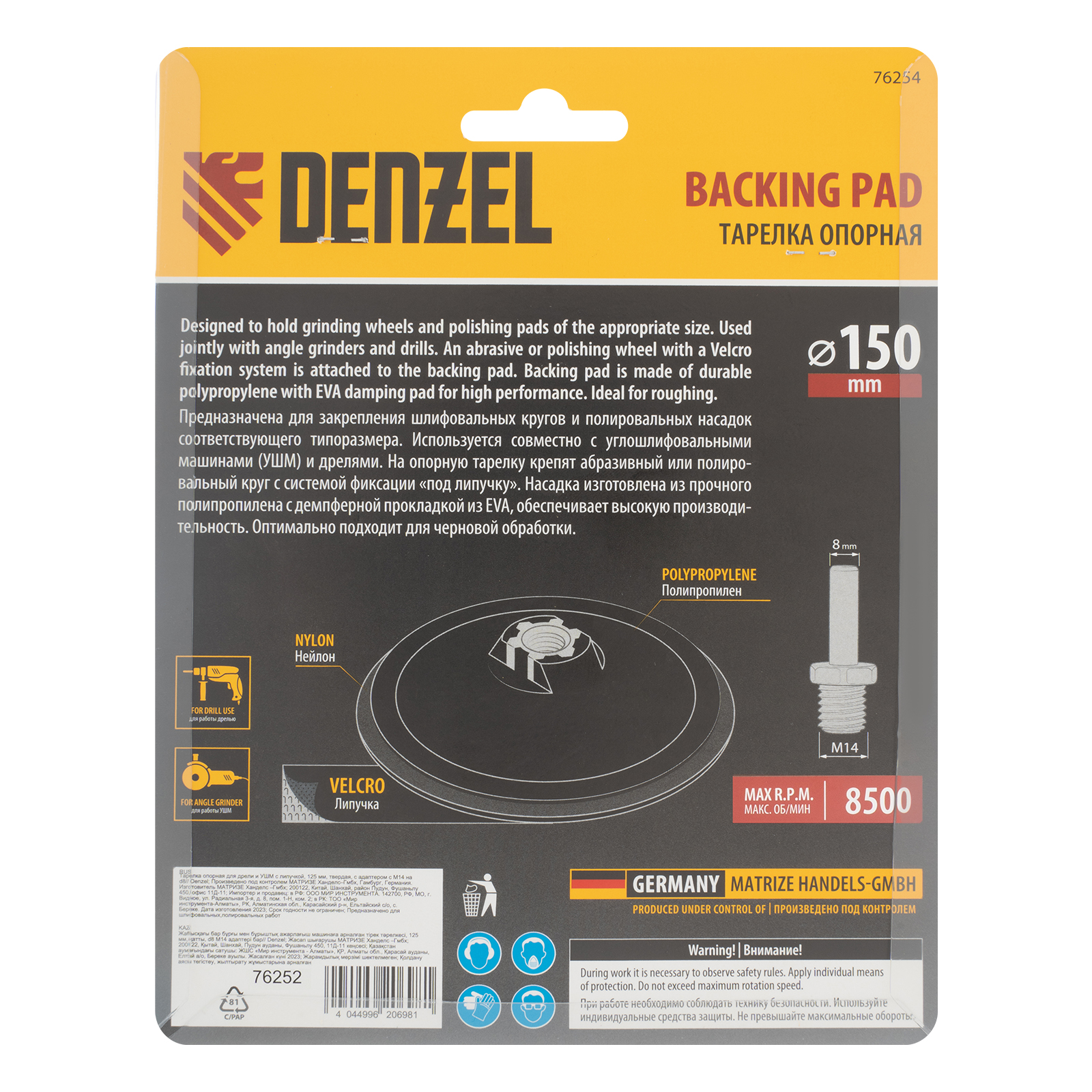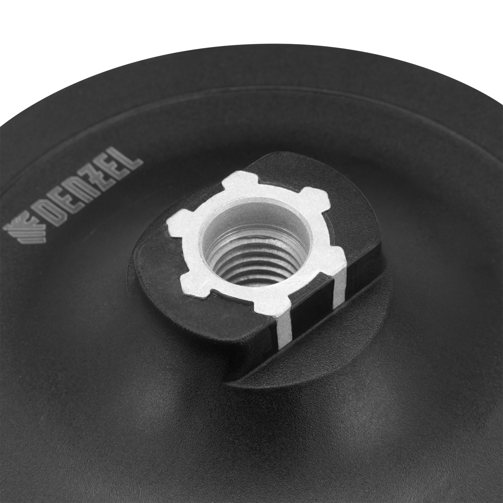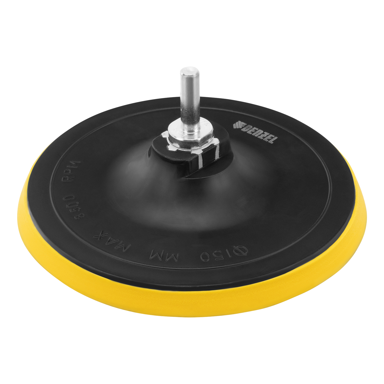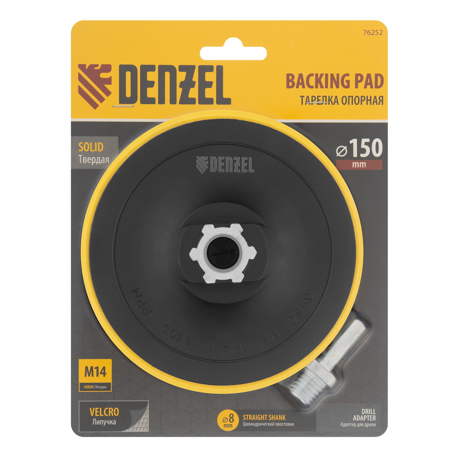 Тарелка опорная Denzel 76252 диаметром 150 мм, с липучкой и адаптером с М14 на d8, стандартная, устанавливается на дрель или углошлифовальную машину (УШМ). Используется для крепления абразивных или полировальных кругов на ворсовой основе, позволяет подготовить поверхность для дальнейшей обработки или придать ей финишную гладкость.