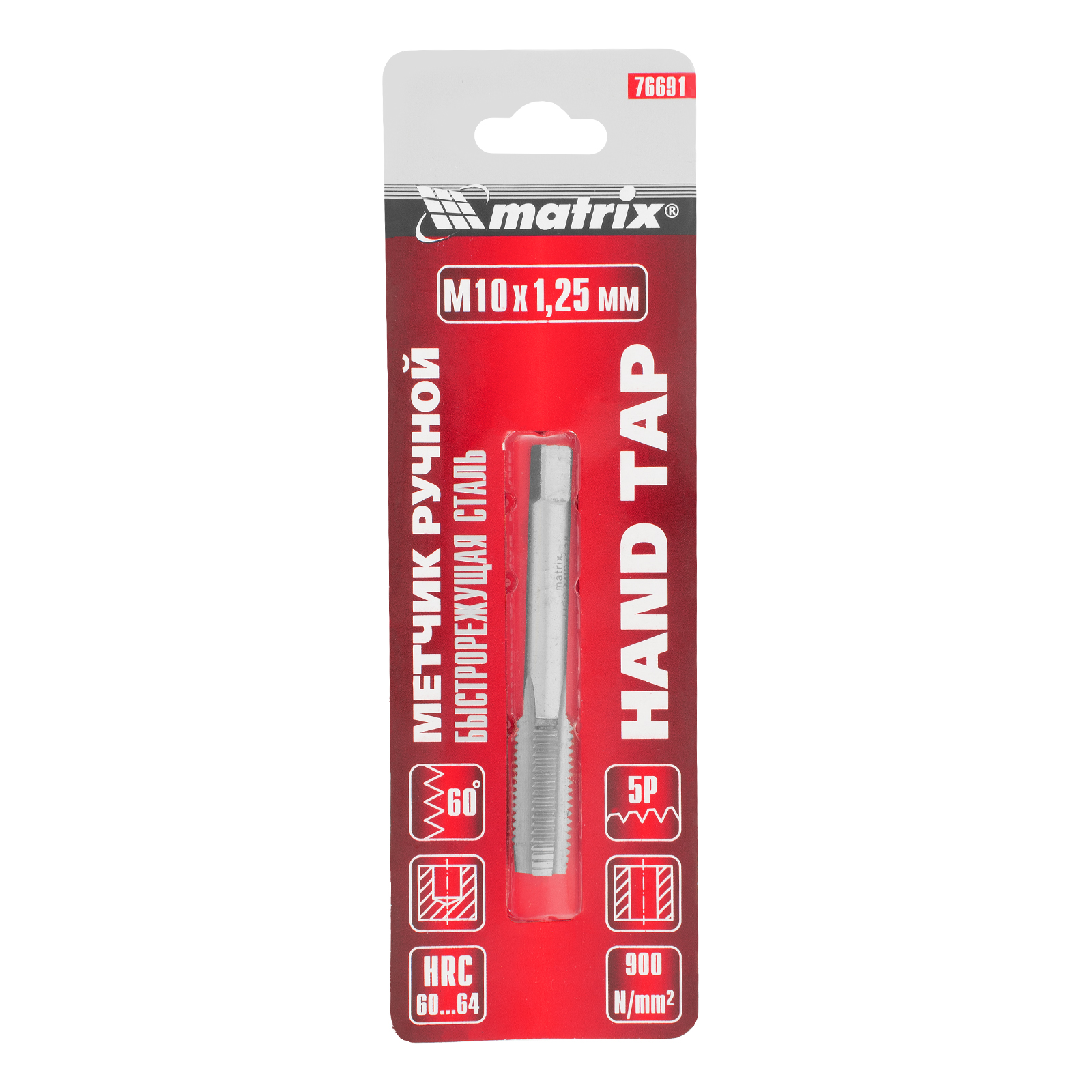 Ручной метчик Matrix 76691, HSS, — резьбонарезной инструмент, который используется для создания резьбы диаметром М10 и шагом 1,25 мм. Оптимален для работы с деталями из твердой стали прочностью до 900 Н/мм². Нарезает резьбу за один проход. Метчик устанавливается на метчикодержатель с патроном под хвостовик 5,4 мм. Будет полезен в слесарной мастерской, а также дома или в гараже.