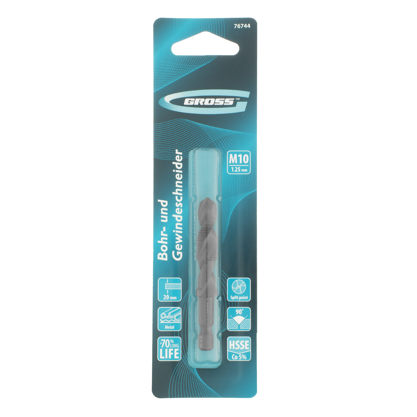 Сверло-метчик Gross 76744 из стали с 5%-м содержанием кобальта предназначено для получения глухих и сквозных отверстий в металлических заготовках с одновременным нарезанием правой резьбы M10 с шагом 1,25 мм. Позволяет существенно сэкономить время работы, объединив две операции в одну. Угол заточки 135° оптимален для работы с чугуном, сталью, алюминием, медью, бронзой.