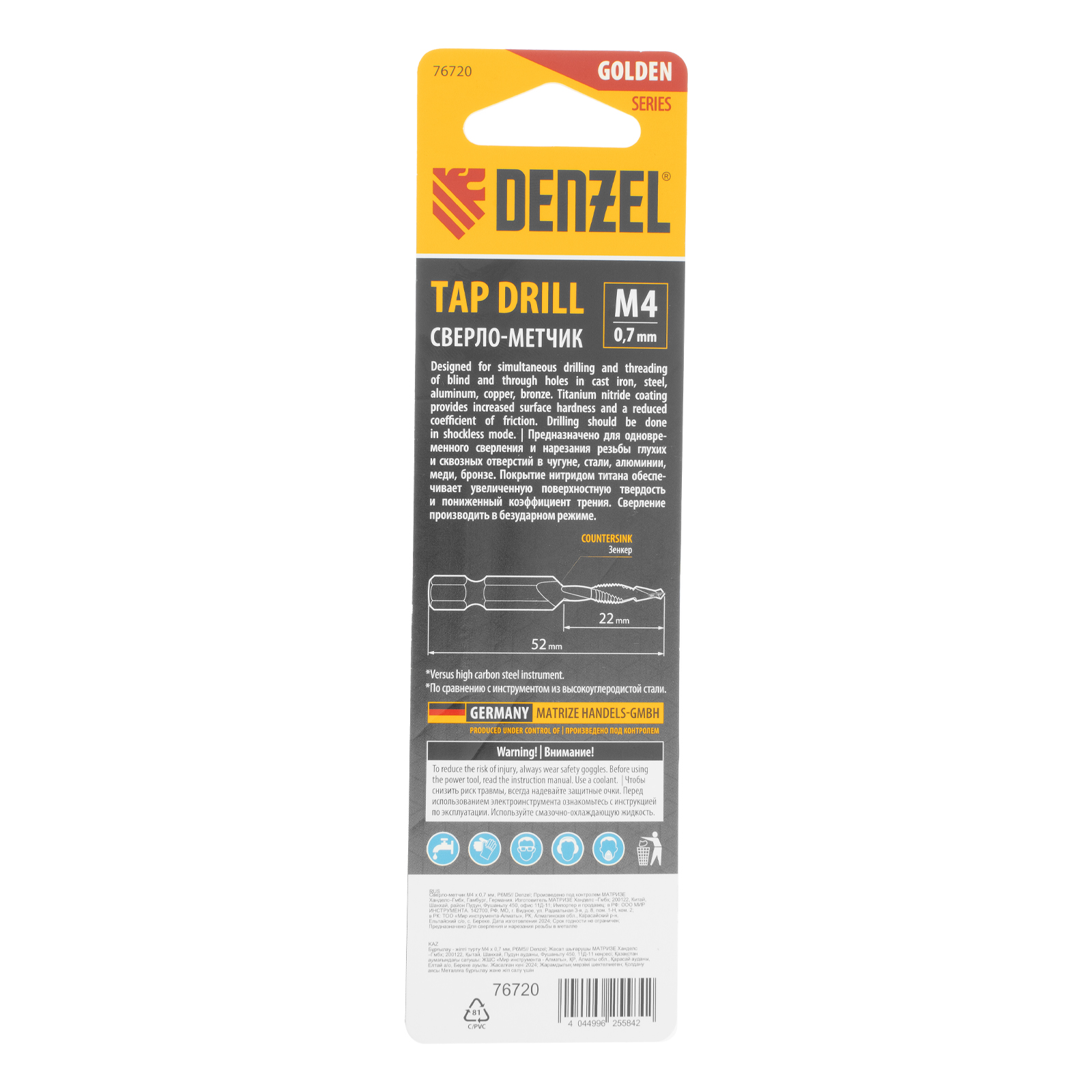 Сверло-метчик Denzel 76720 из стали P6M5 предназначено для получения глухих и сквозных отверстий в металлических заготовках с одновременным нарезанием правой резьбы M4 с шагом 0,7 мм. Позволяет существенно сэкономить время работы, объединив две операции в одну. Угол заточки 135° оптимален для работы с чугуном, сталью, алюминием, медью, бронзой. Ресурс оснастки увеличен в 10 раз по сравнению с аналогичными моделями из углеродистой стали.