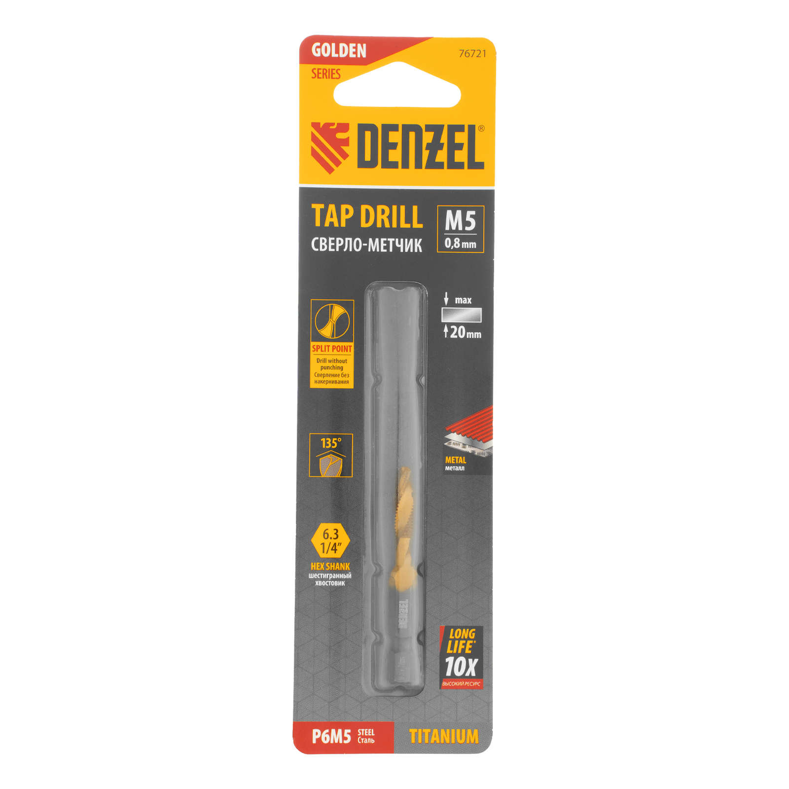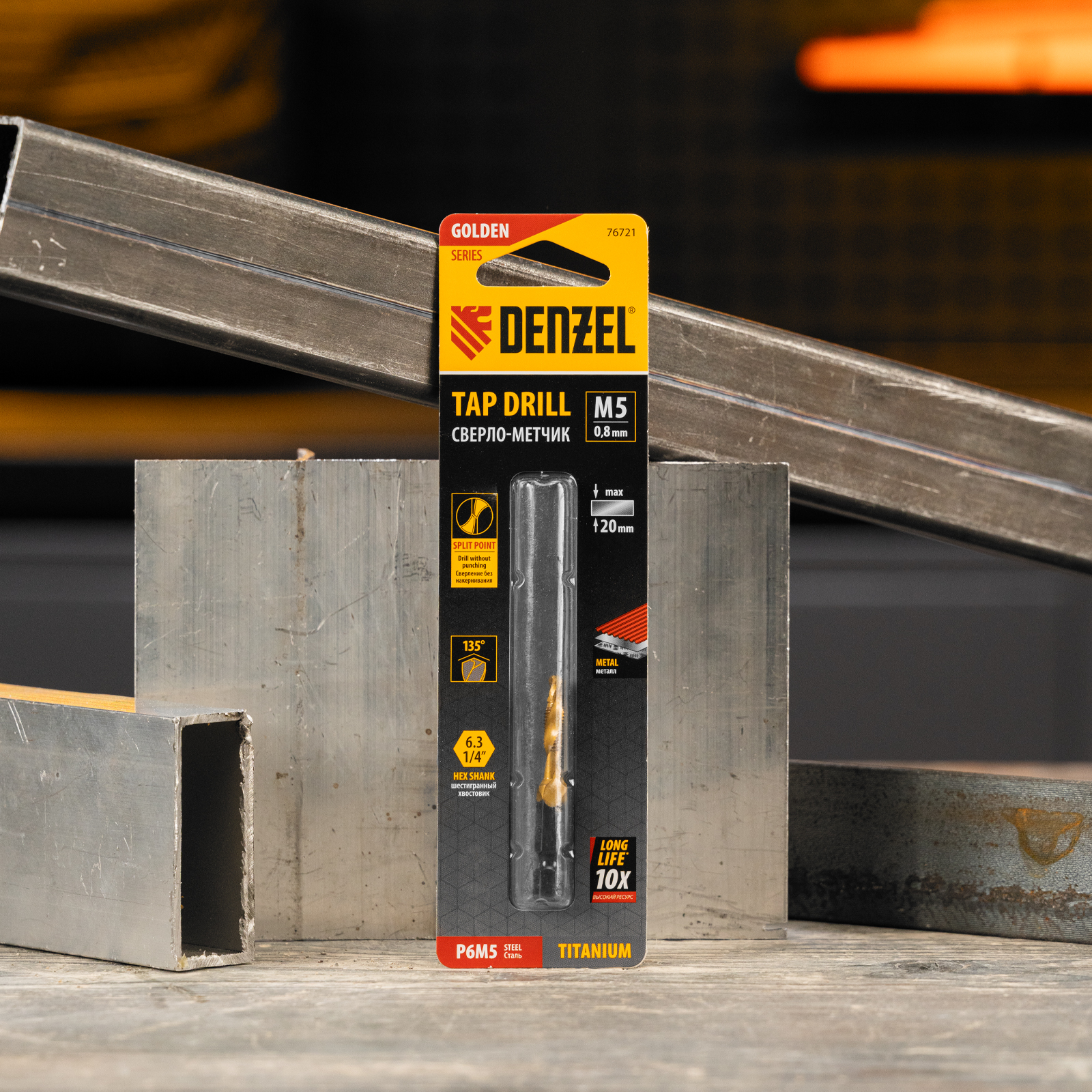 Сверло-метчик Denzel 76721 из стали P6M5 предназначено для получения глухих и сквозных отверстий в металлических заготовках с одновременным нарезанием правой резьбы M5 с шагом 0,8 мм. Позволяет существенно сэкономить время работы, объединив две операции в одну. Угол заточки 135° оптимален для работы с чугуном, сталью, алюминием, медью, бронзой. Ресурс оснастки увеличен в 10 раз по сравнению с аналогичными моделями из углеродистой стали.