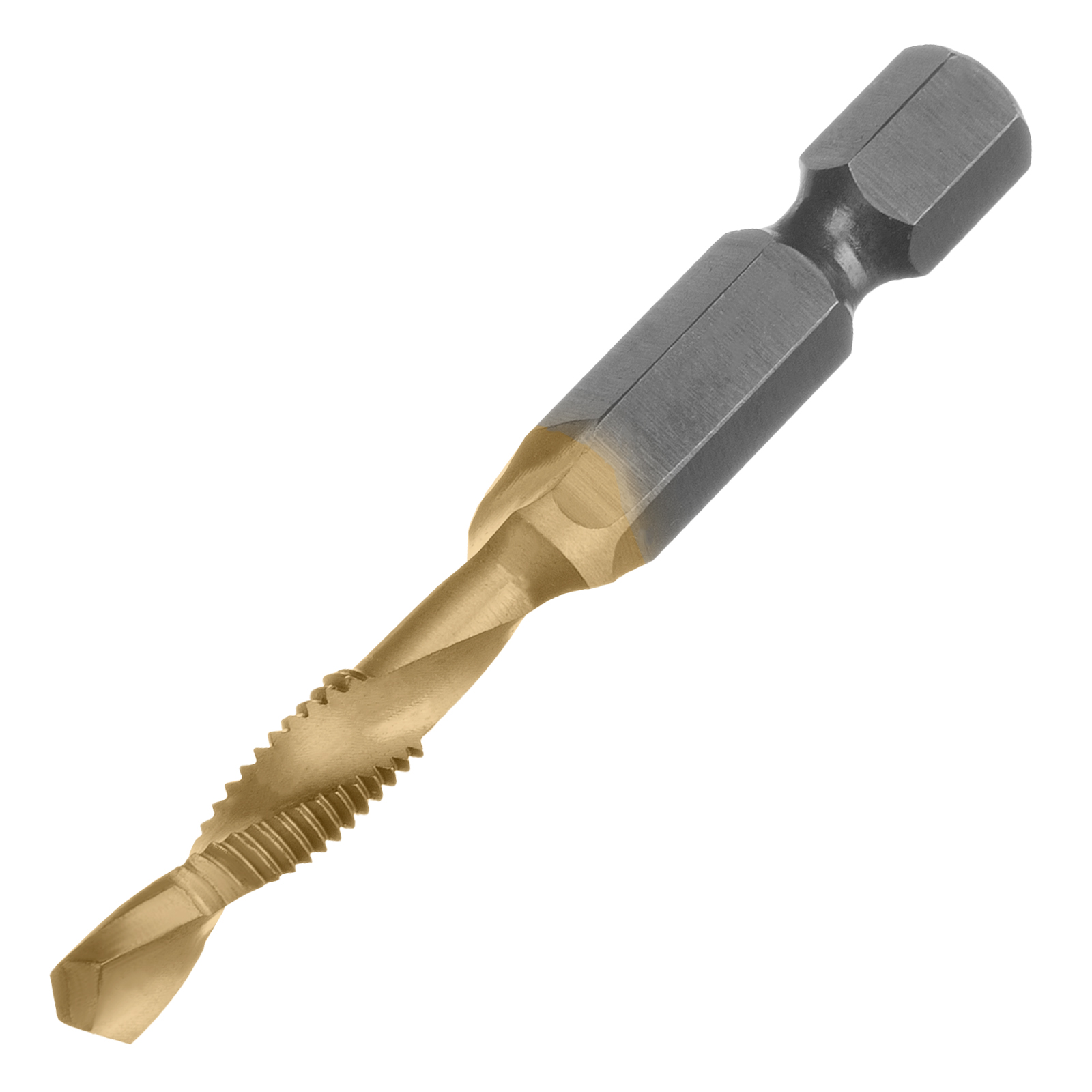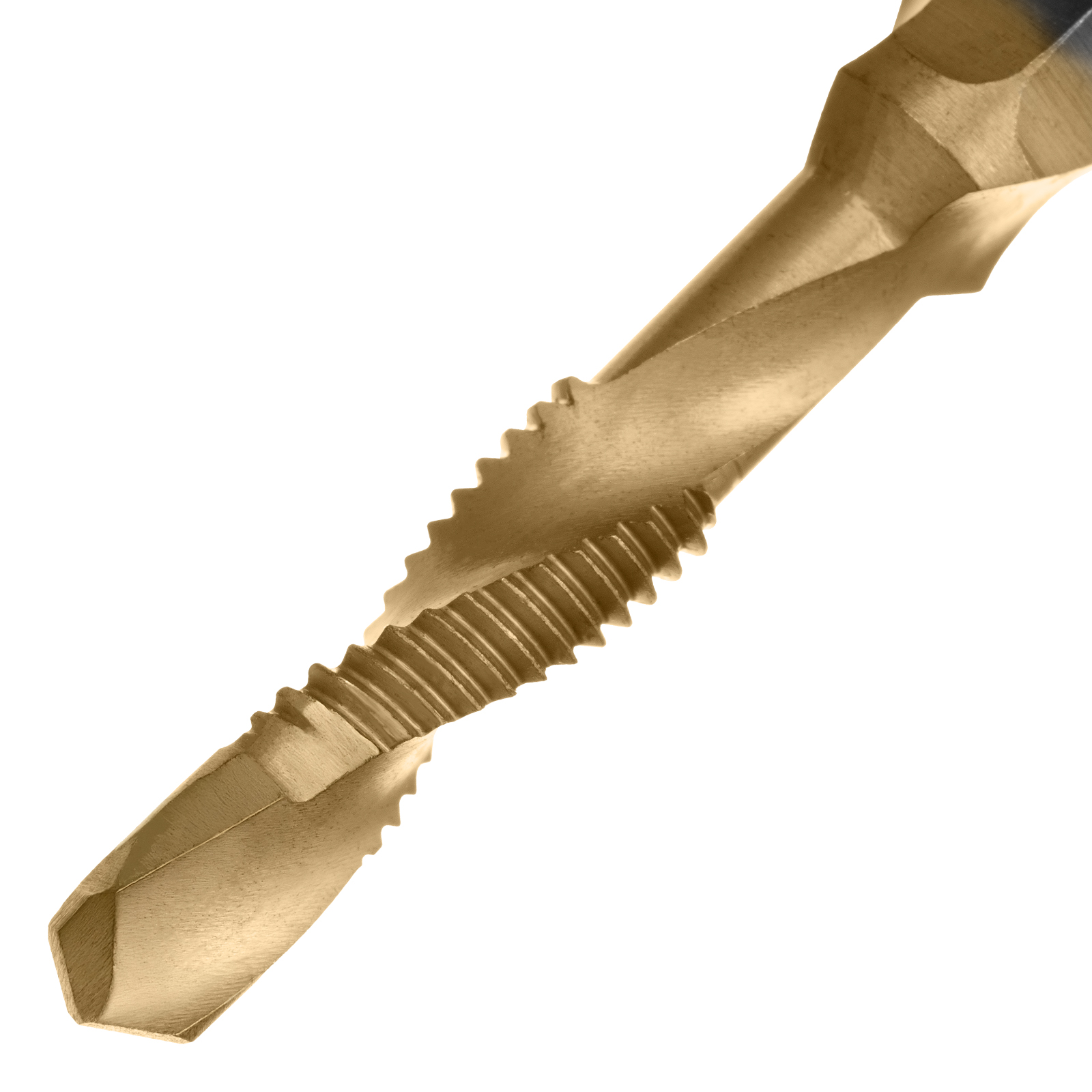 - Долговечность — нитридтитановое покрытие защищает от повреждений и уменьшает трение, что увеличивает устойчивость сверла-метчика к износу.