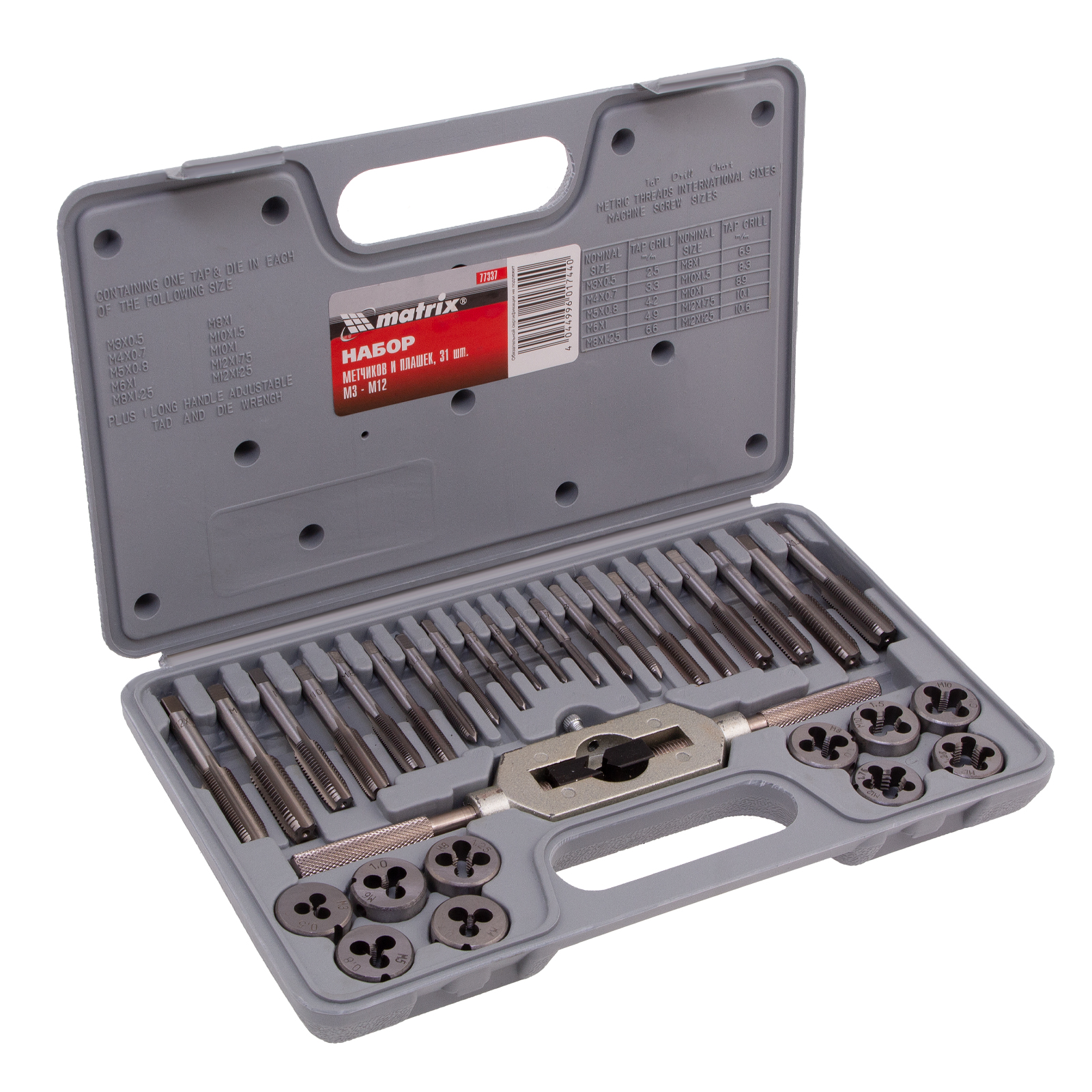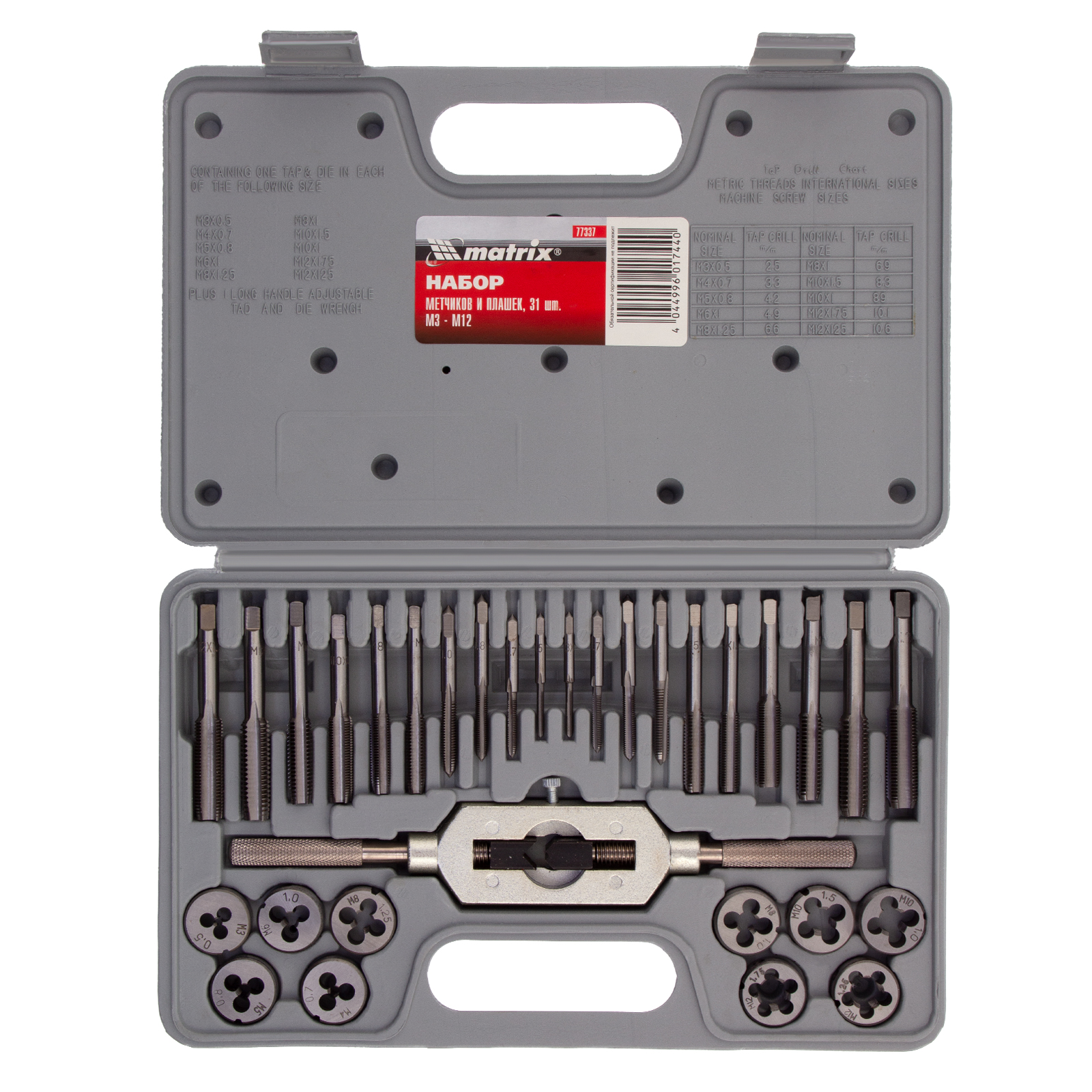 Набор метчиков и плашек М3-М12 Matrix 77337 из 31 предмета позволяет нарезать наружную и внутреннюю резьбу на металлических деталях. Также он применяется для восстановления сорванной резьбы. Все инструменты хранятся в удобном пластиковом боксе. Набор предназначен для ремонтных работ, используется в профессиональной и бытовой сфере.