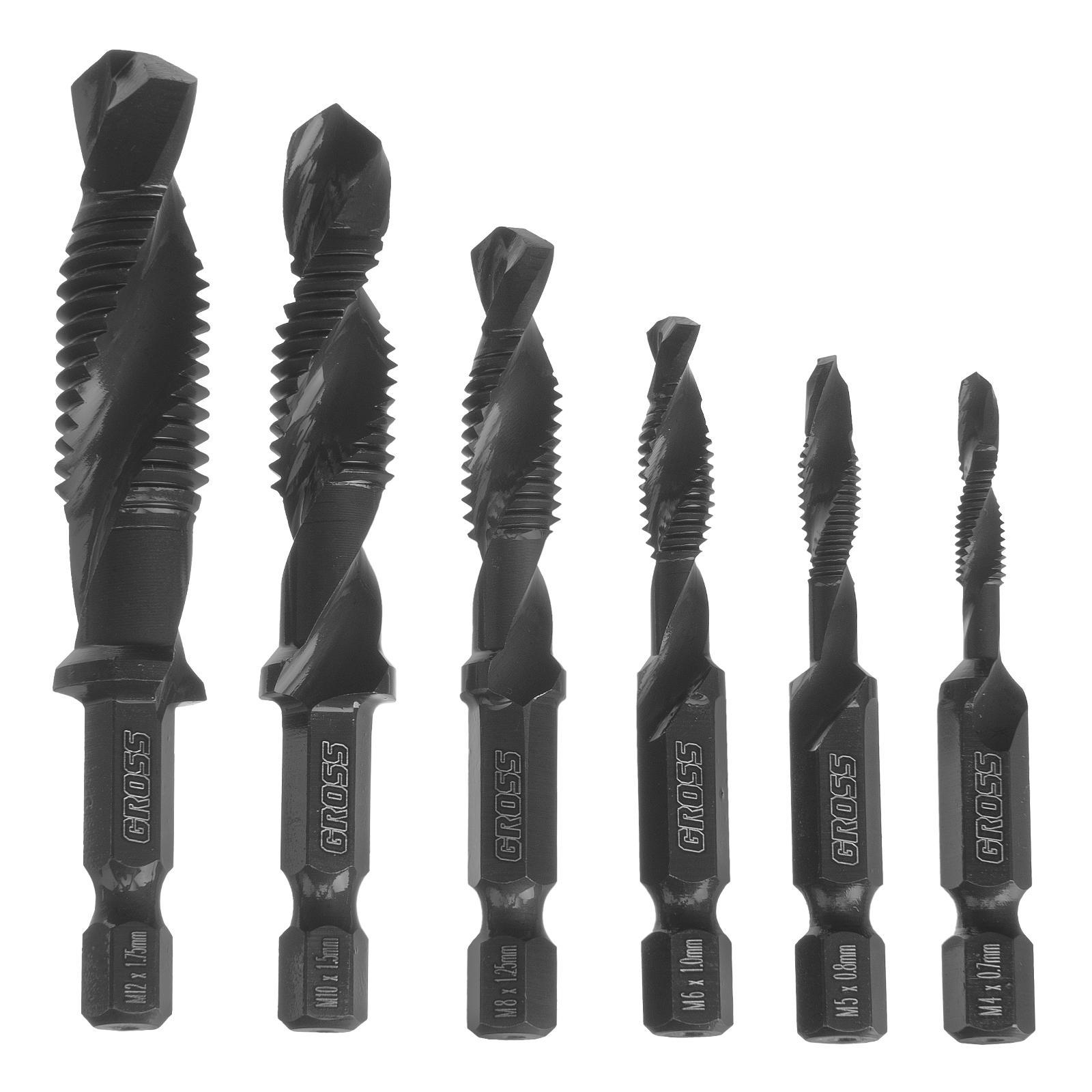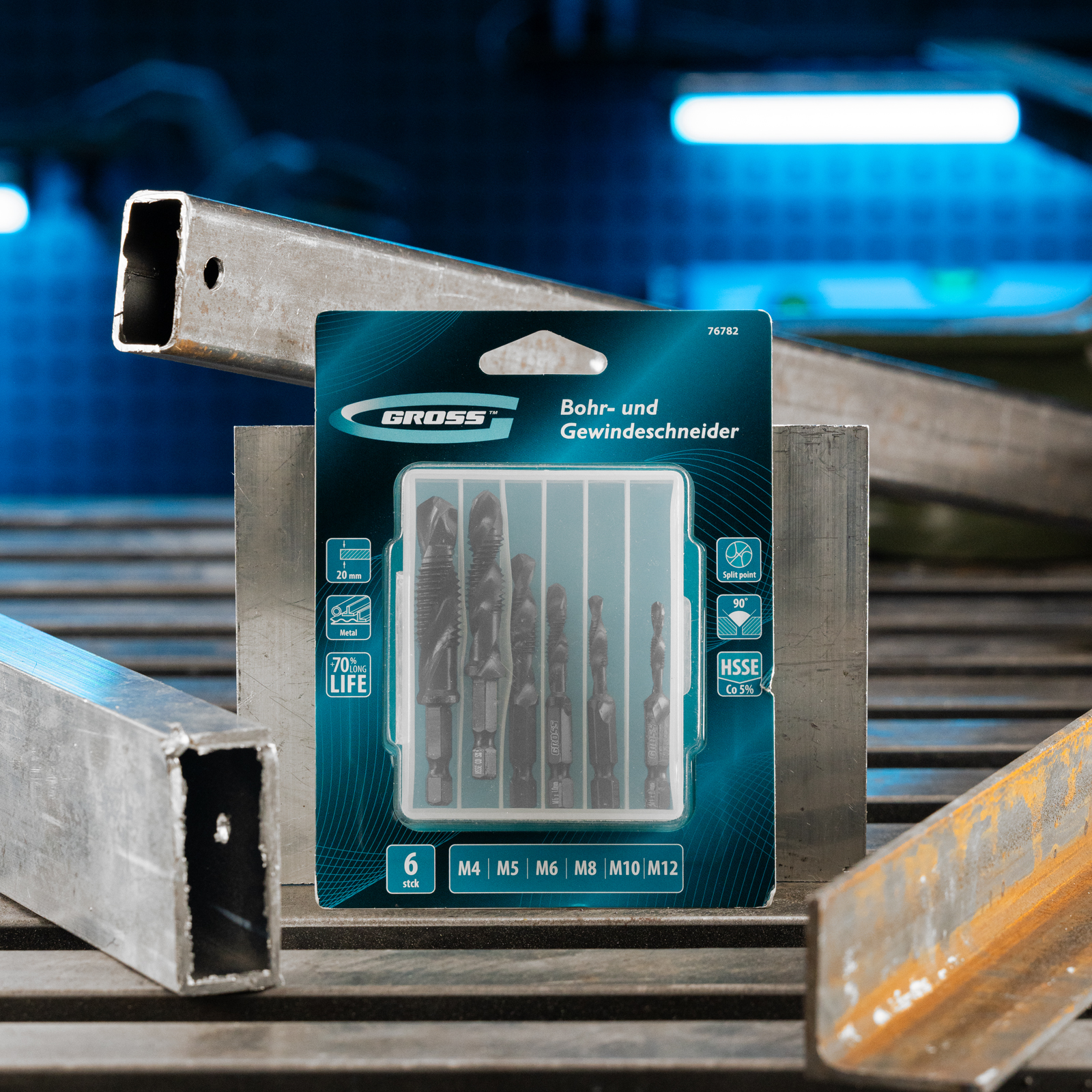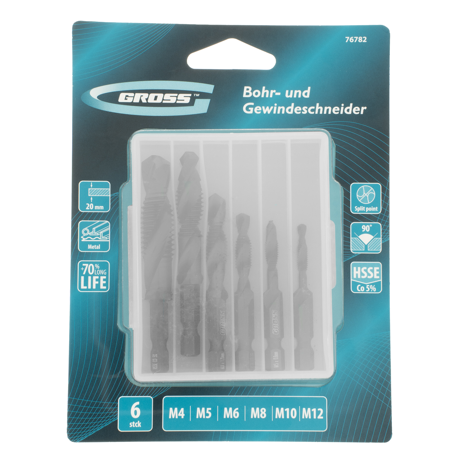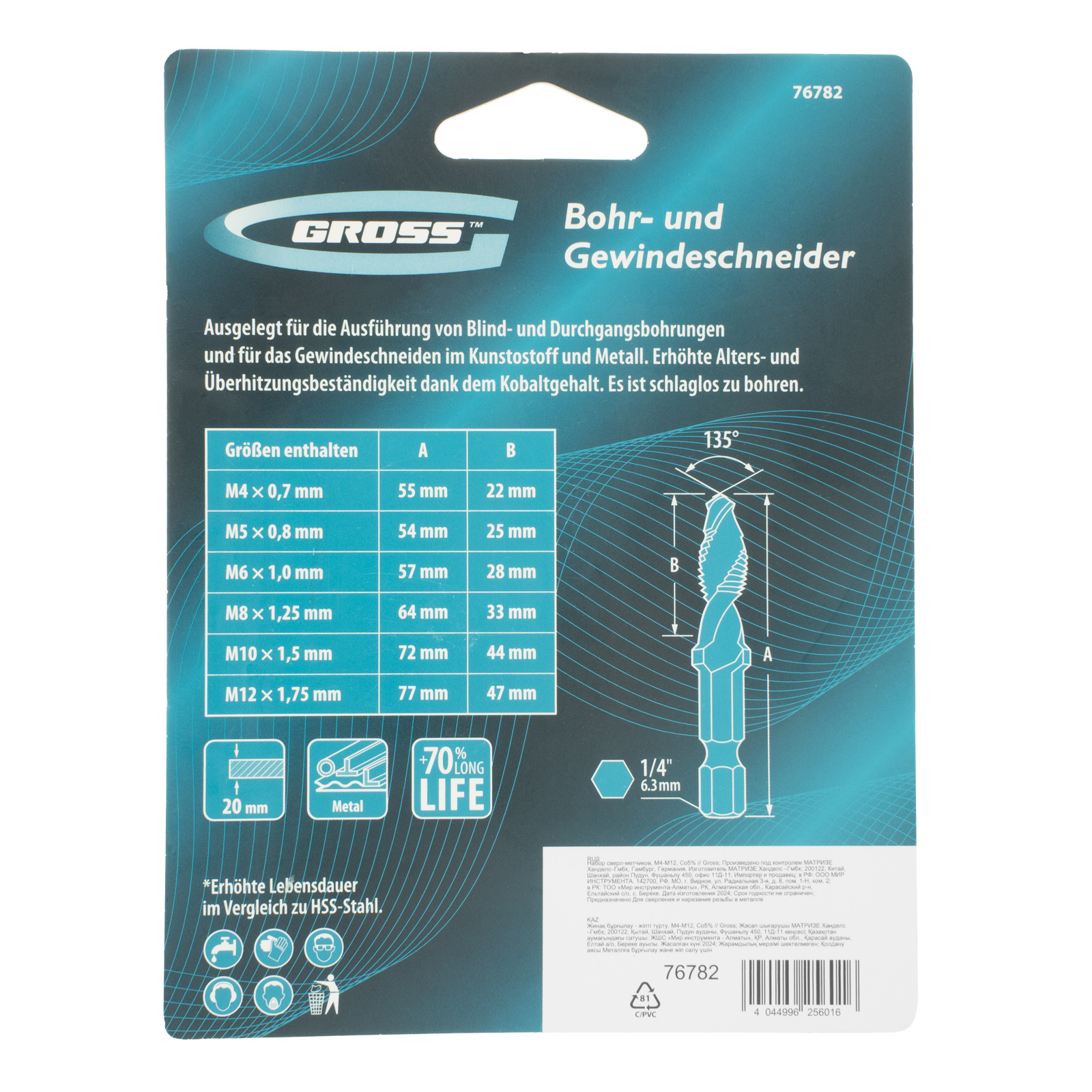 Набор сверл-метчиков Gross 76782 состоит из 6 предметов, изготовленных из стали с 5%-м содержанием кобальта, и позволяет сверлить глухие и сквозные отверстия в чугуне, стали, алюминии, меди, бронзе с одновременным нарезанием правой метрической резьбы размером M4-M12 с шагом 0,7-1,75 мм. Такое решение позволяет существенно сократить время работы. Угол заточки оснастки 135° оптимален для эффективного решения поставленных задач. Сверлам-метчикам присвоен класс точности 4H, что обеспечивает высокое качество получаемой резьбы.