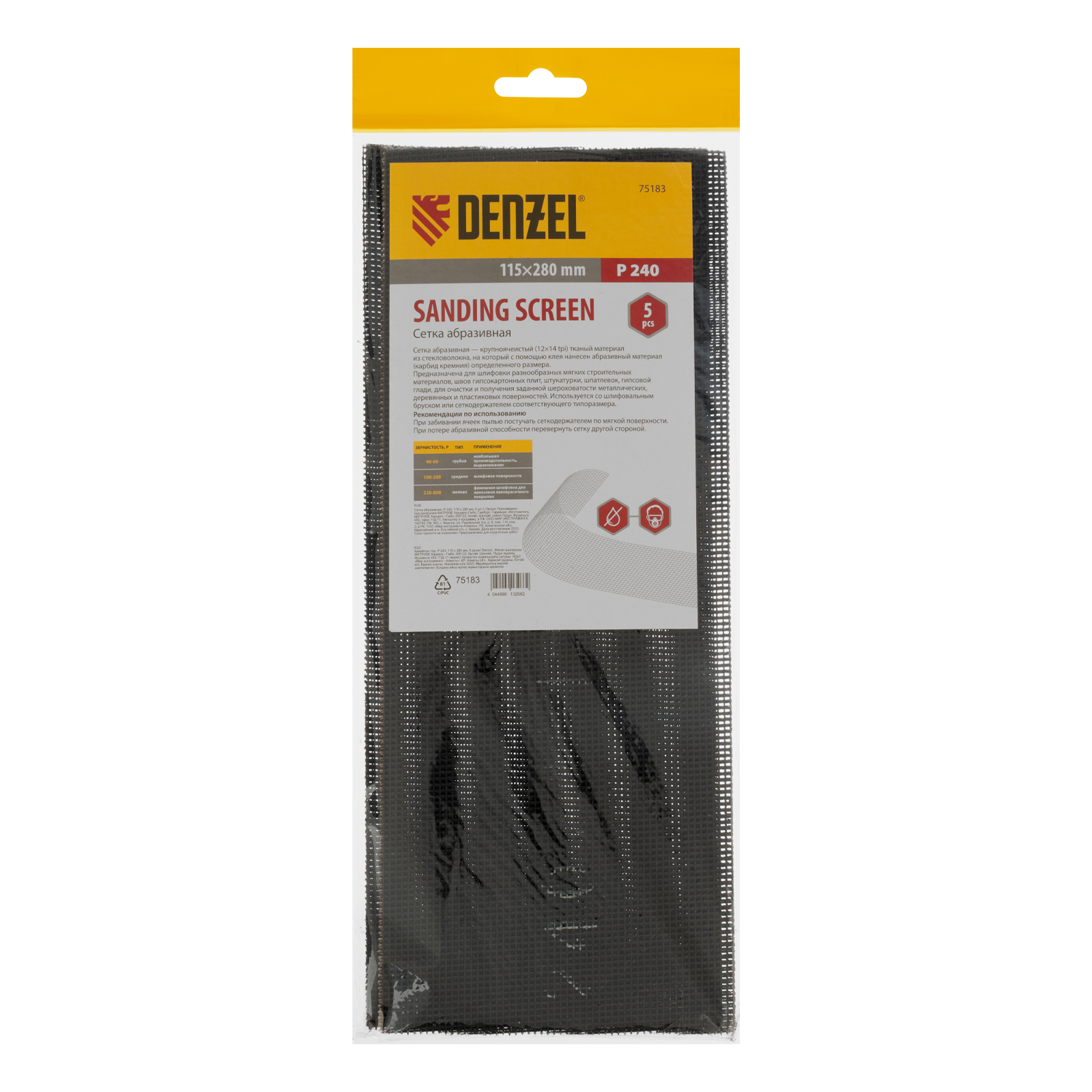 Абразивная сетка Denzel 75183 размером 115 х 280 мм, с зернистостью P 240, 5 шт. в упаковке, применяется для финишной обработки и придания гладкости зашпаклеванным поверхностям, а также твердой древесине и металлу. Бережно снимает тонкий слой материала и лакокрасочного покрытия, удаляет ржавчину и заусенцы, сглаживает неровности. Обладает высоким ресурсом, т.к. заостренные зерна карбида кремния стачиваются медленно. Сетку устанавливают на ручное шлифовальное приспособление — брусок или сеткодержатель соответствующего типоразмера.