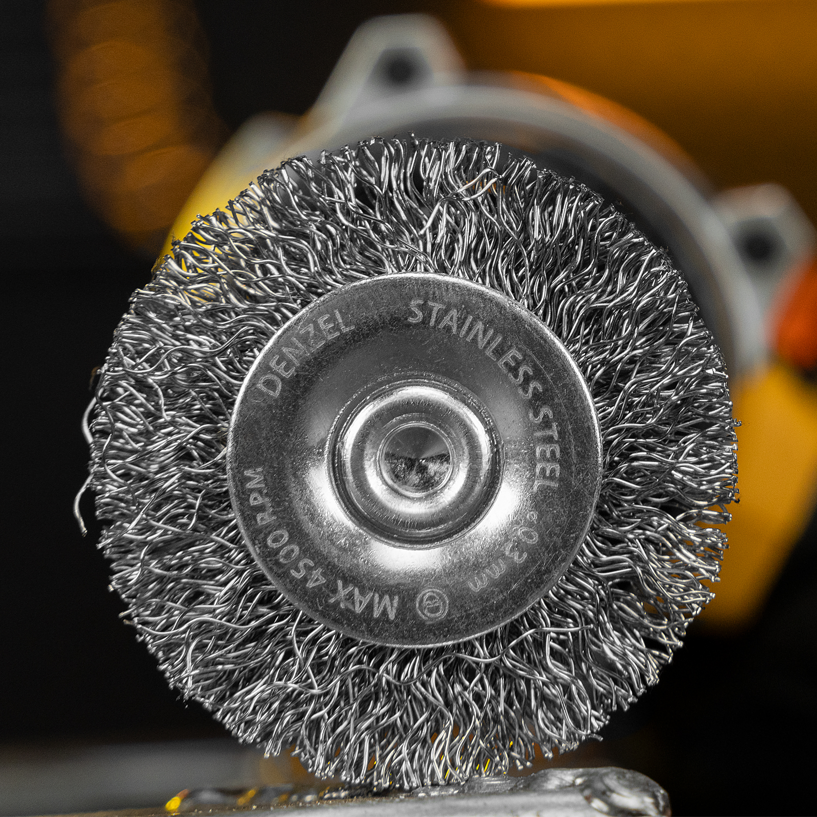 Набор щеток для дрели Denzel 74491 со шпилькой и щетиной из нержавеющей витой проволоки включает в себя 1 плоскую насадку диаметром 50 мм и 2 «Чашки» диаметром 25-50 мм. Набор используется для щадящей обработки твердых поверхностей: металла, стали (в том числе нержавеющей), древесины, пластика, позволяет удалять старые лакокрасочные покрытия, ржавчину и загрязнения. Щетки в форме чашки оптимальны для обработки плоских поверхностей большой площади, плоская насадка удобна для зачистки пазов, изгибов и углов.